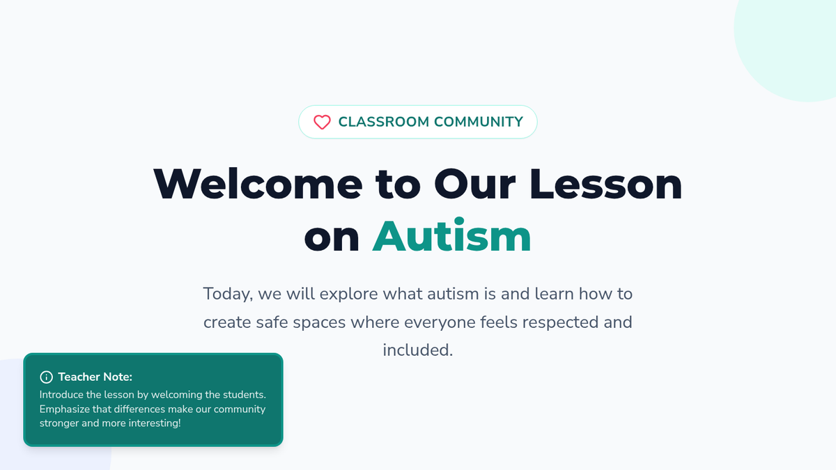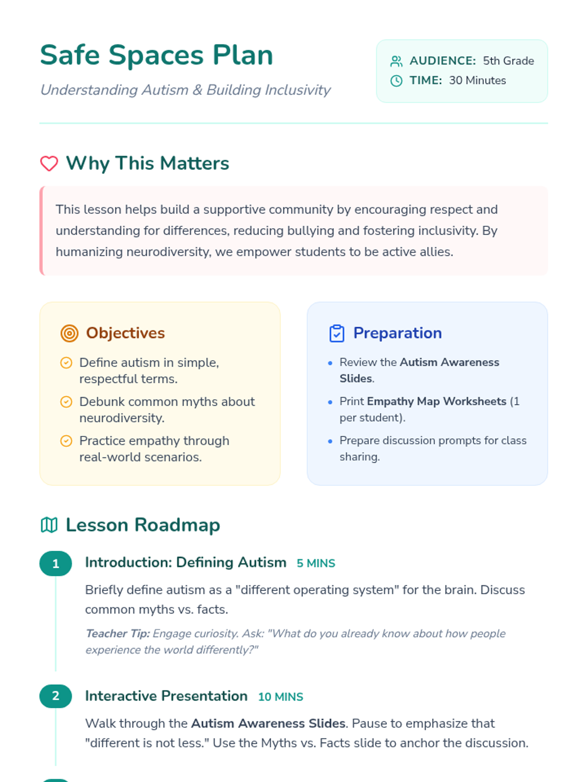 This lesson introduces 5th-grade students to autism, focusing on building empathy, debunking myths, and creating an inclusive classroom environment where differences are celebrated. Students will engage in discussions and reflective activities to become allies for their peers.