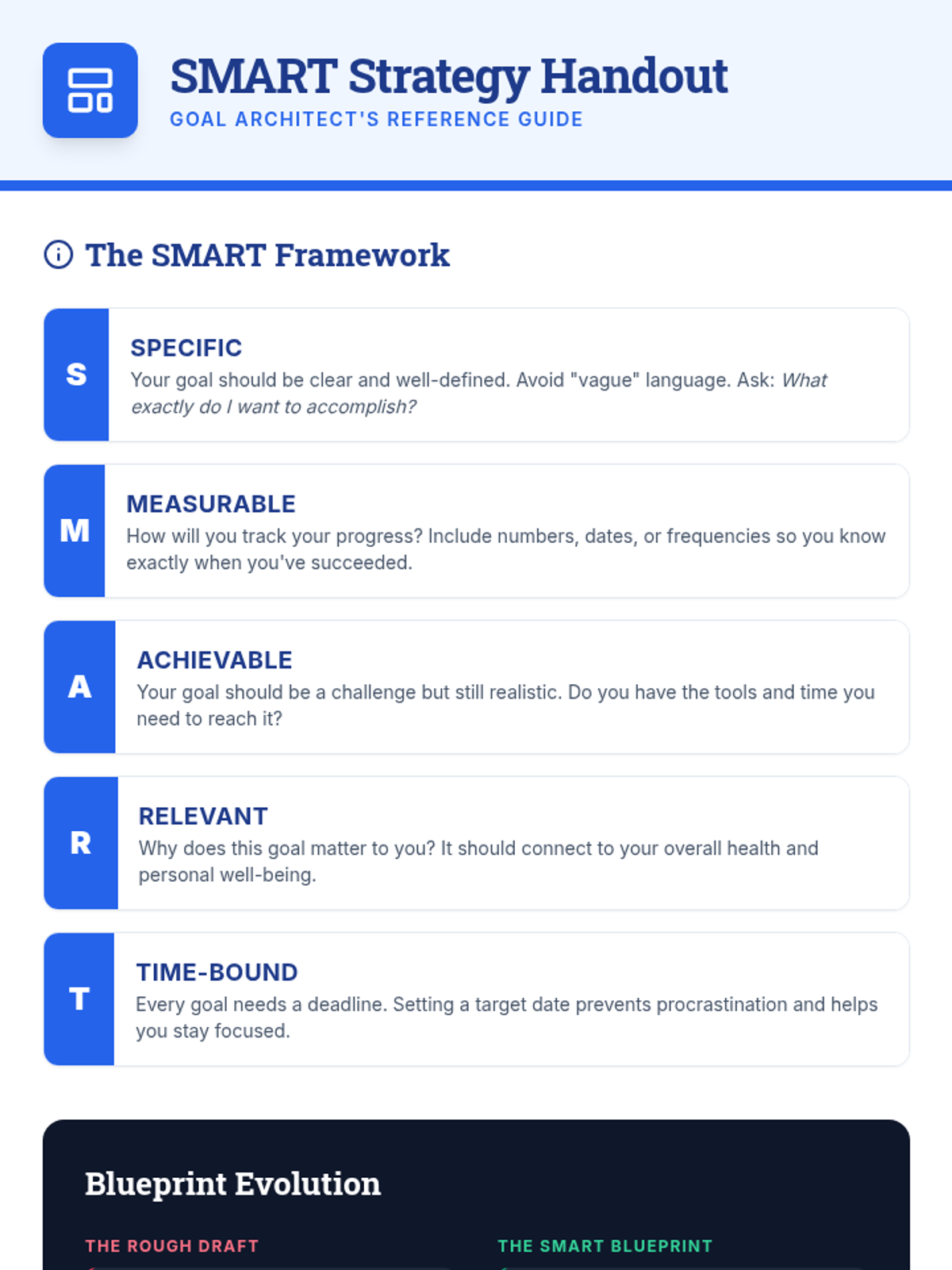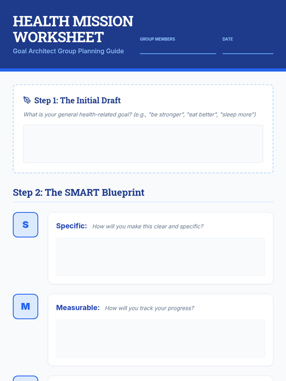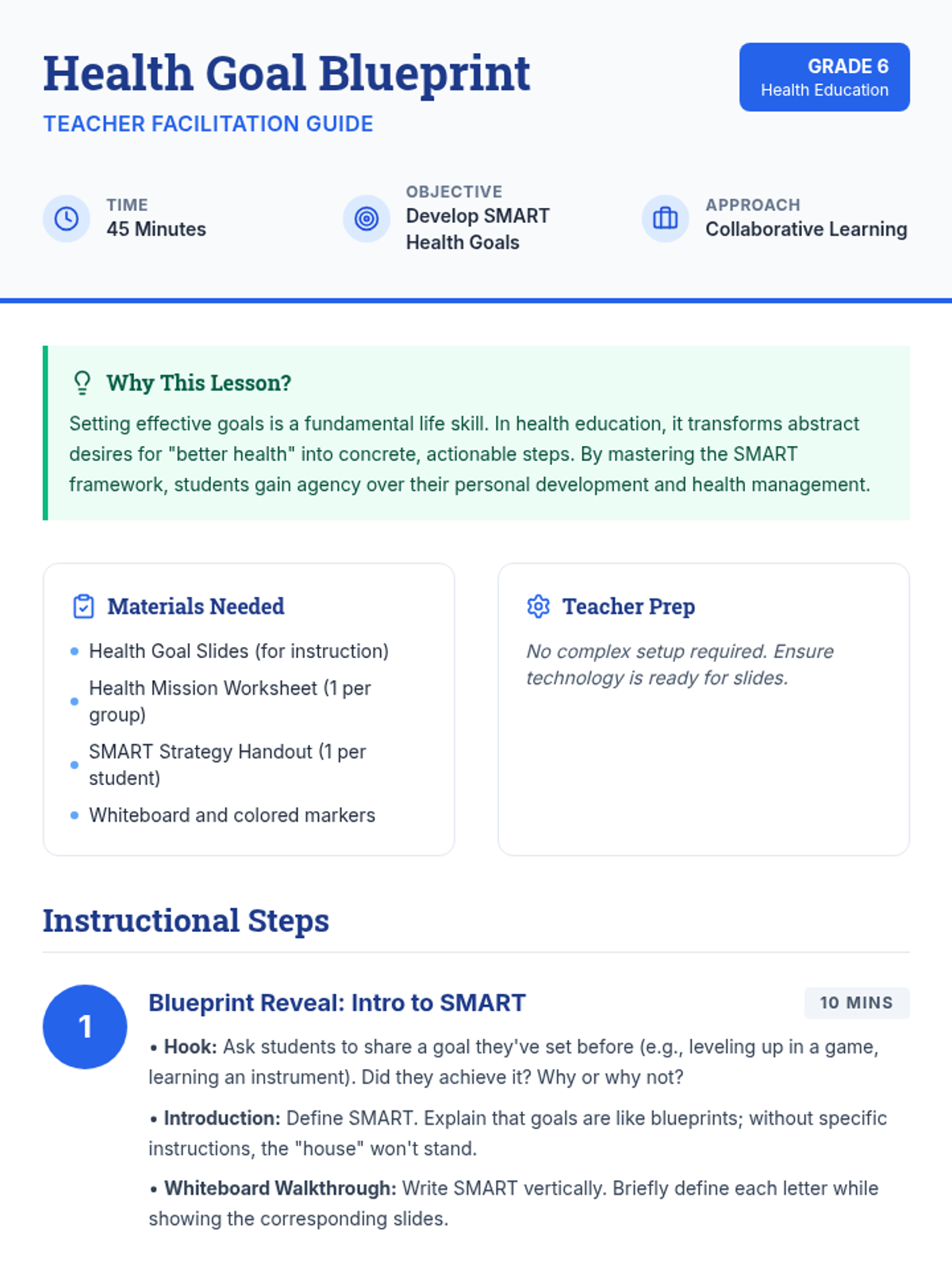 Students learn to apply the SMART framework (Specific, Measurable, Achievable, Relevant, Time-bound) to develop actionable health-related goals. The lesson includes a presentation, a guided worksheet for group practice, and a reference handout for personal reflection.