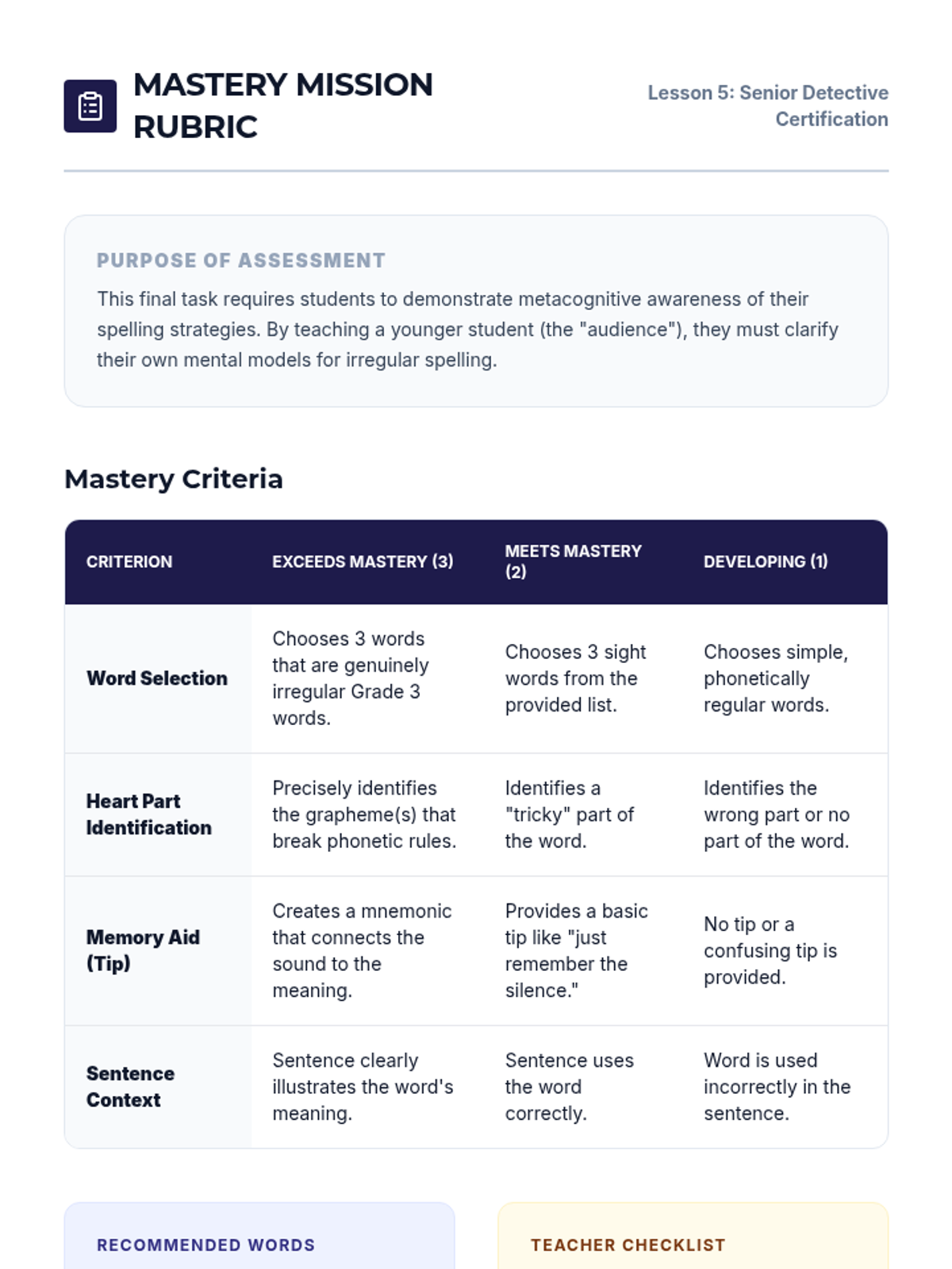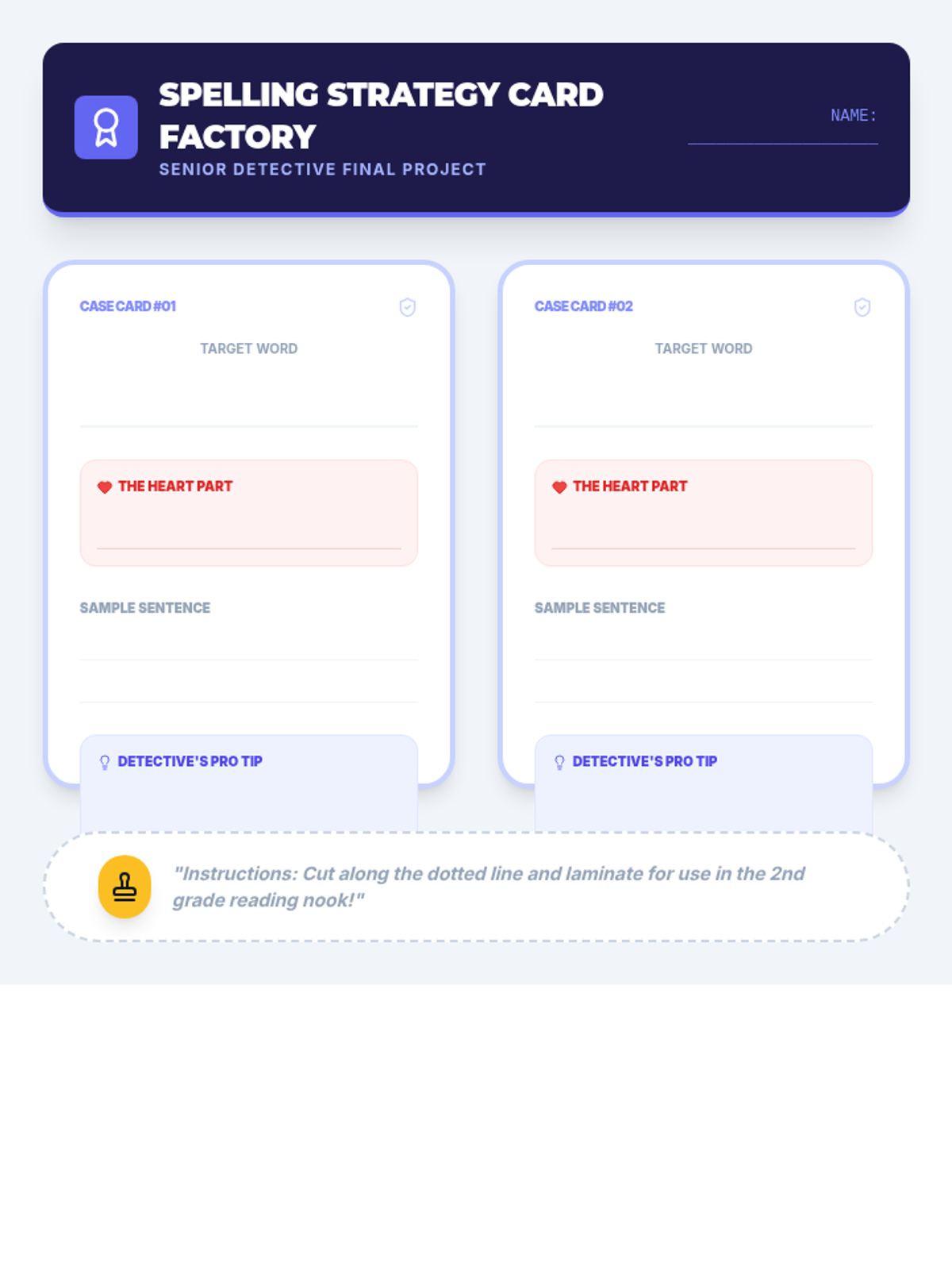 Students synthesize their learning by creating instructional 'Spelling Strategy Cards' for younger students, explaining the tricky parts of high-frequency words.