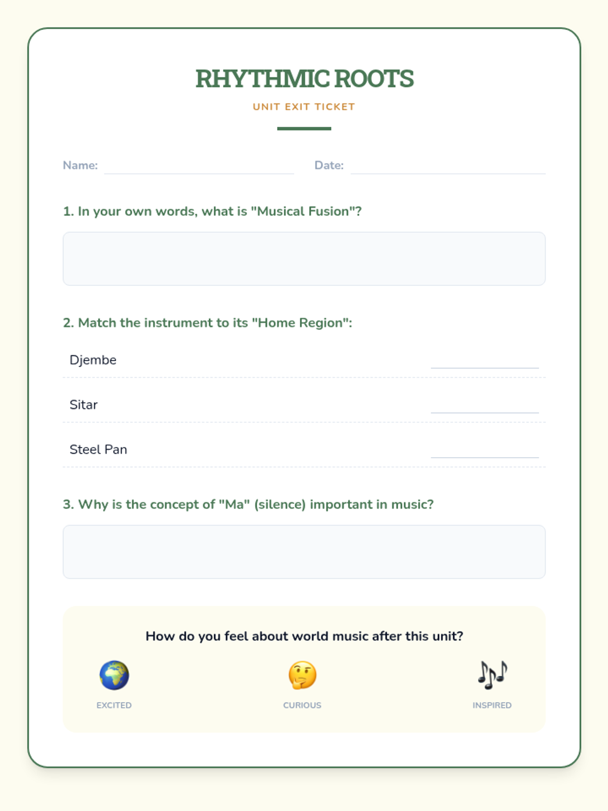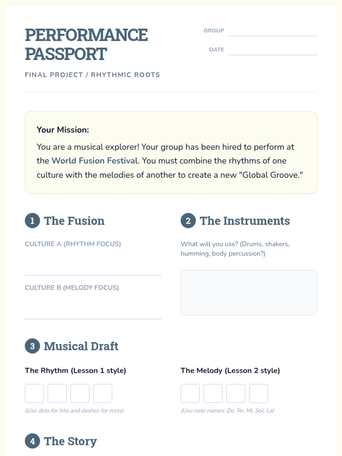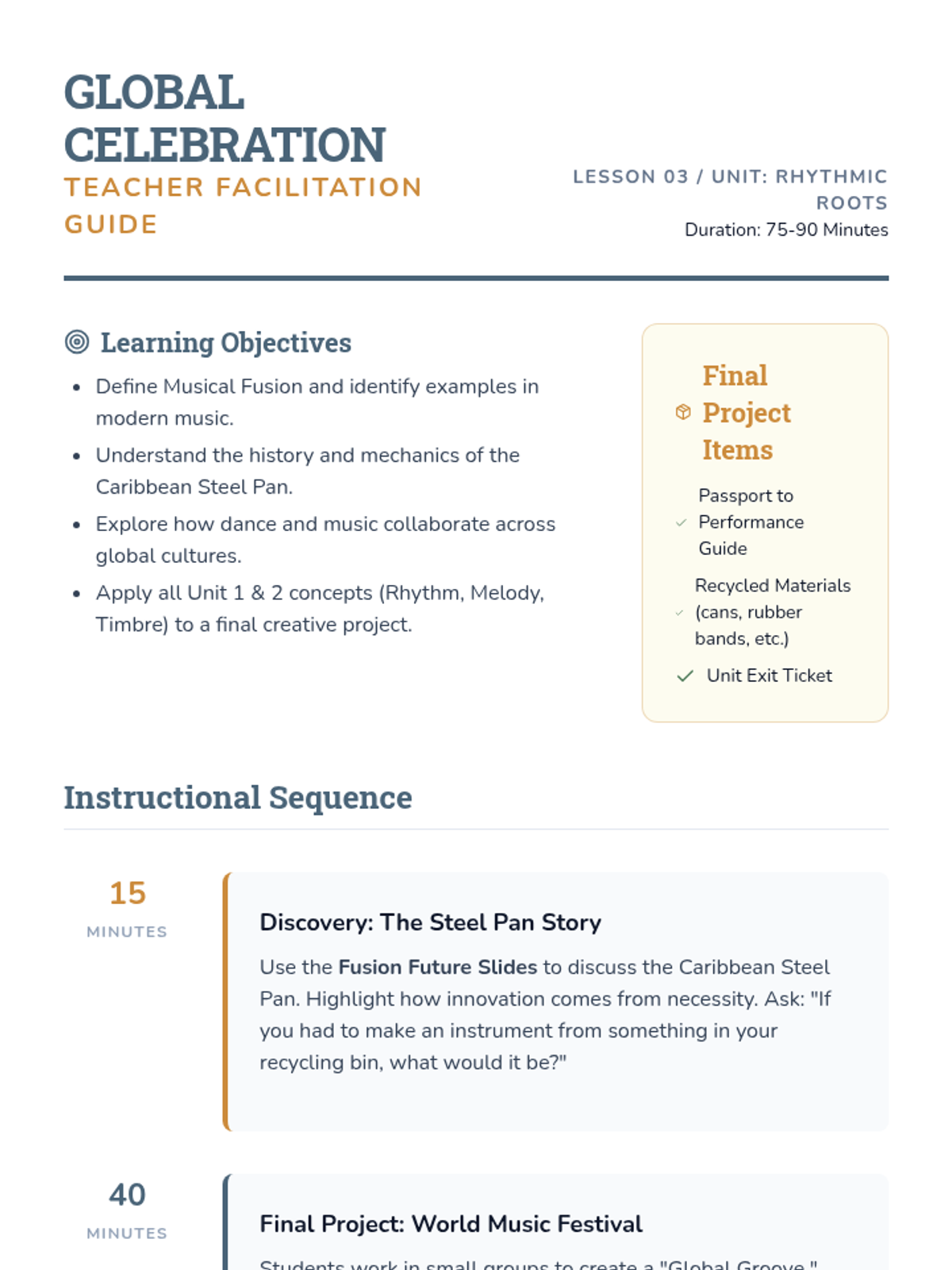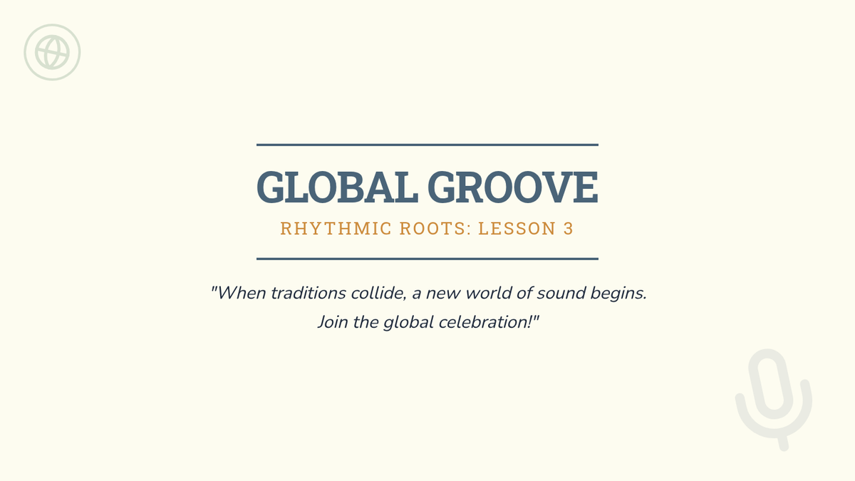 Synthesize learning through the study of global fusion and the creation of a collaborative world music project.