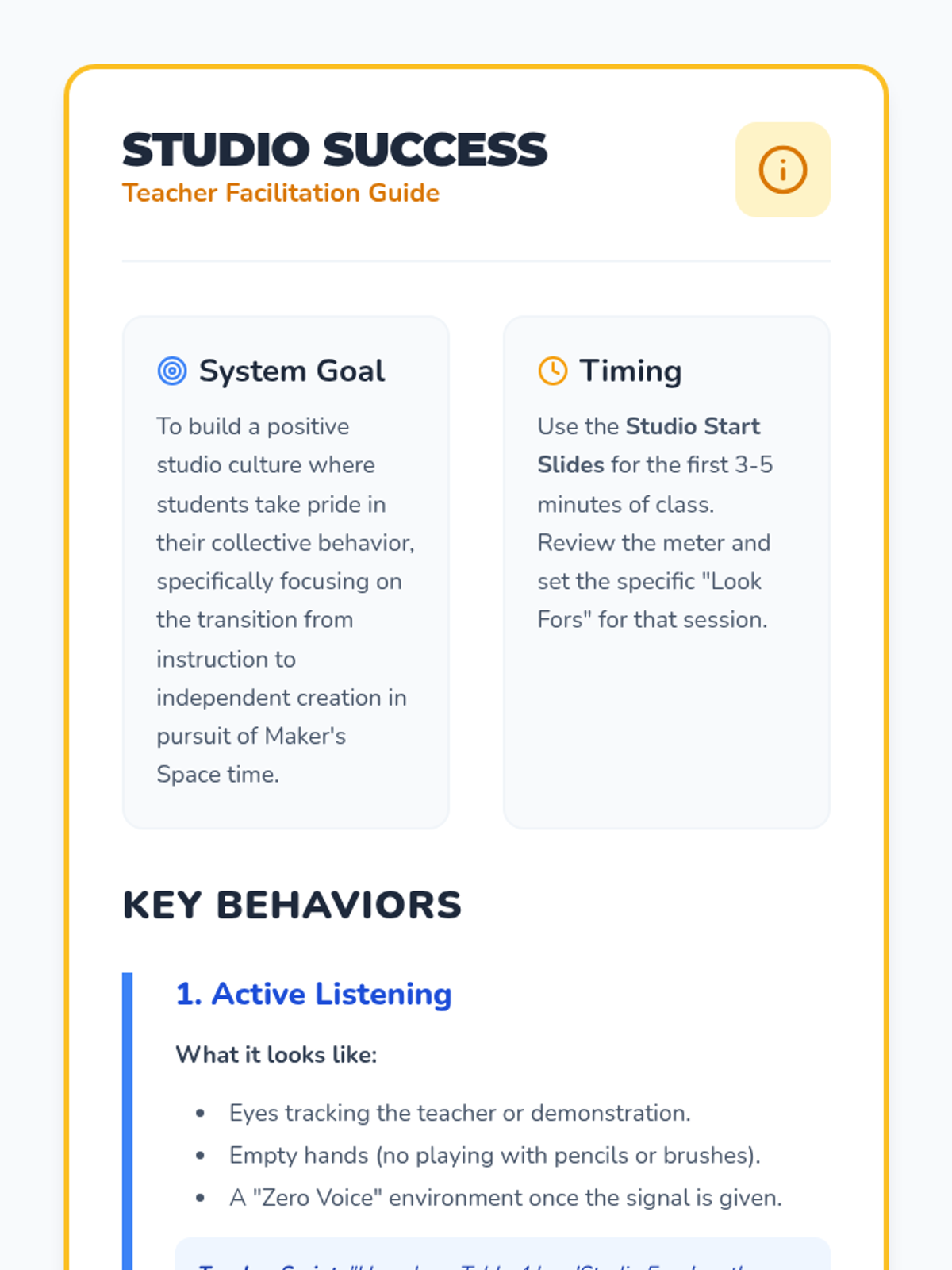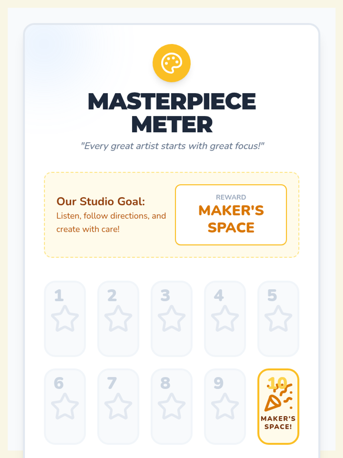 A system for art students to track their progress toward earning Maker's Space time by practicing active listening and following directions. This lesson includes a visual tracking chart, daily warm-up slides, and clear behavioral expectations.