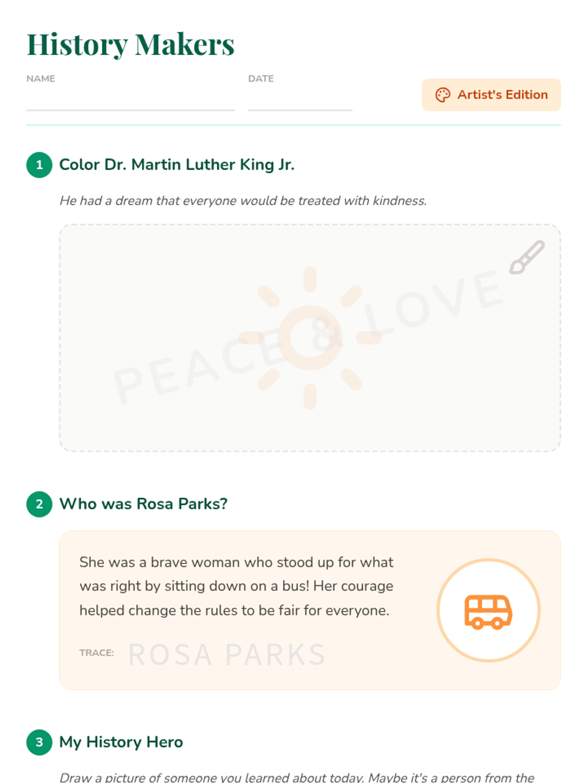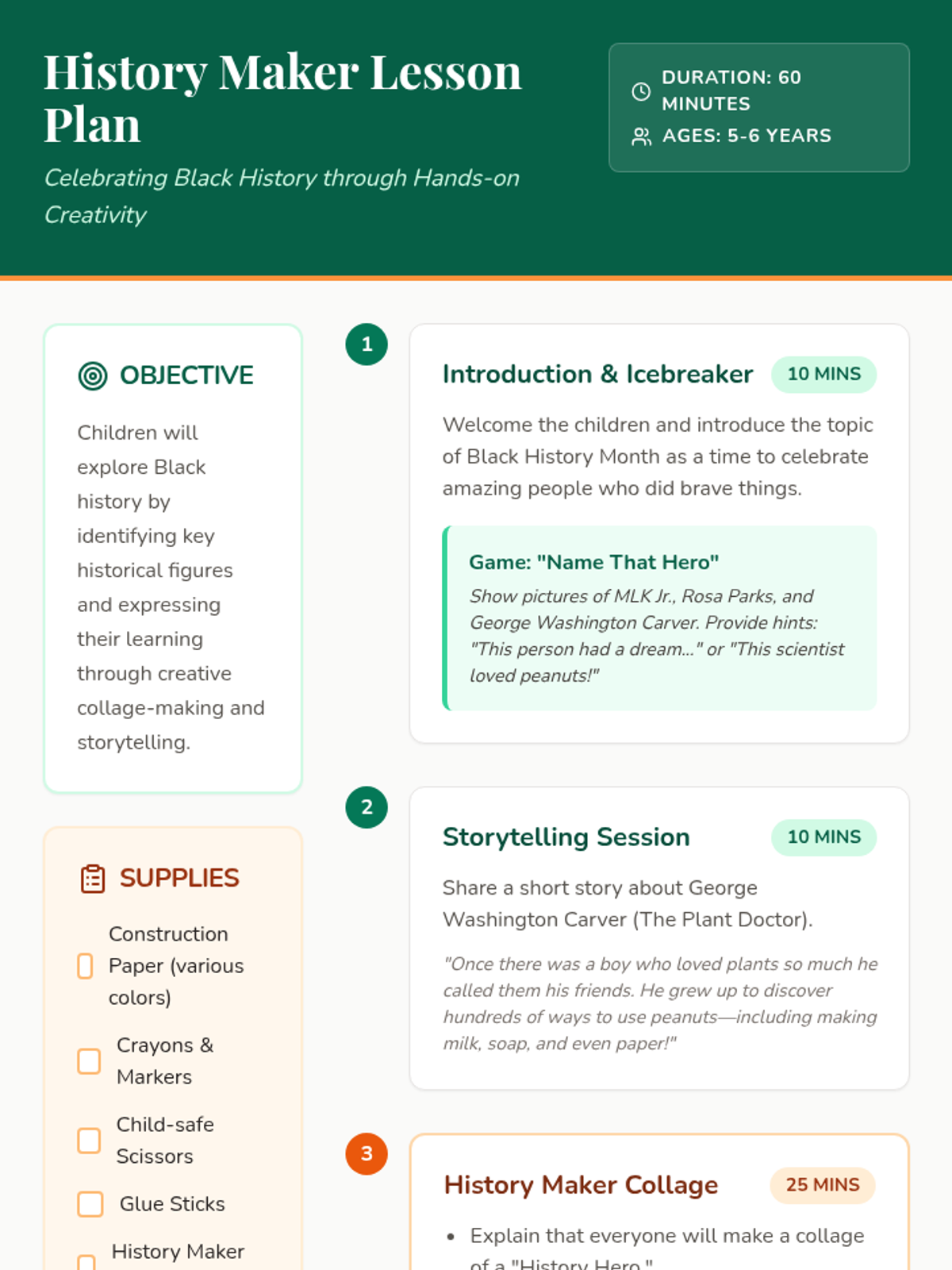A hands-on, creative lesson for 5-6 year olds that introduces Black history through storytelling, crafts, and interactive games. Students will learn about key historical figures like George Washington Carver and Rosa Parks while creating their own "History Maker" collages.