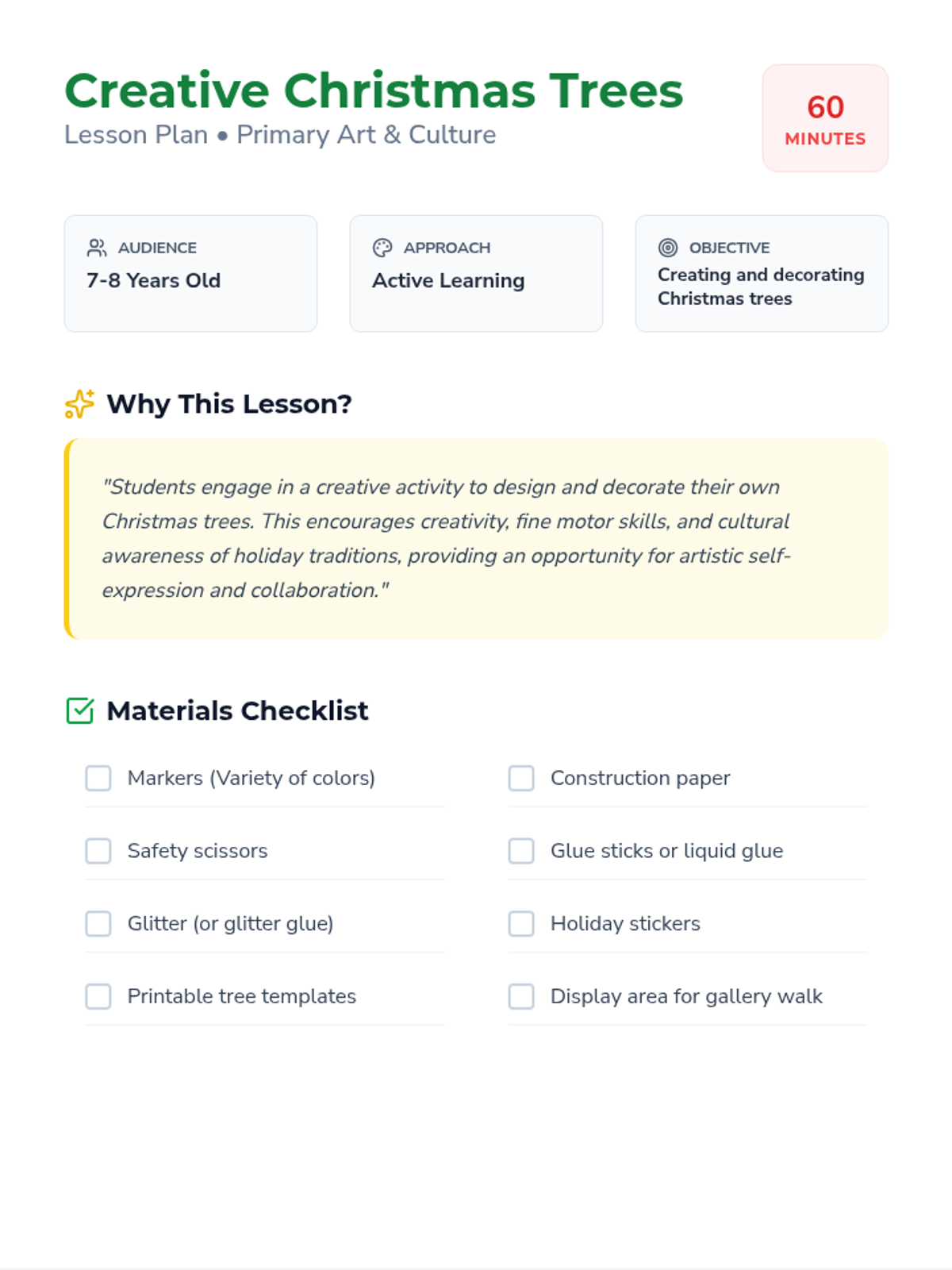 Students will design and decorate their own Christmas trees using a variety of craft materials, exploring holiday traditions while developing fine motor skills and artistic expression.