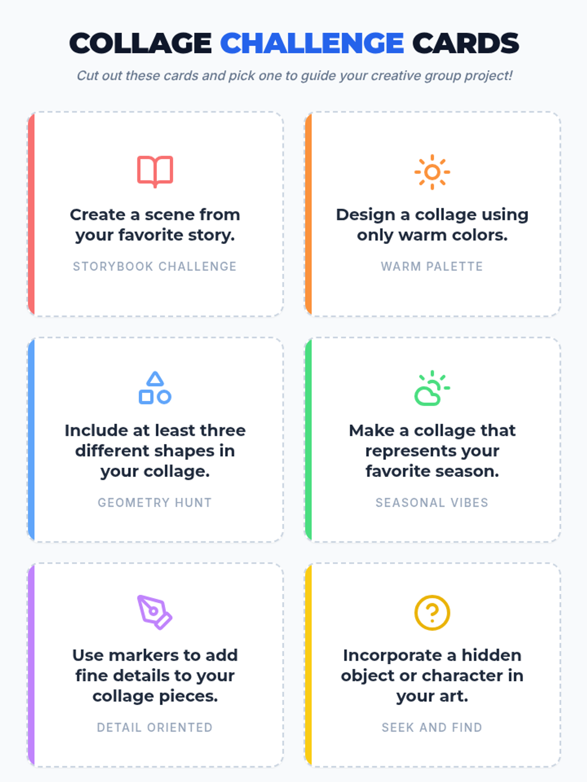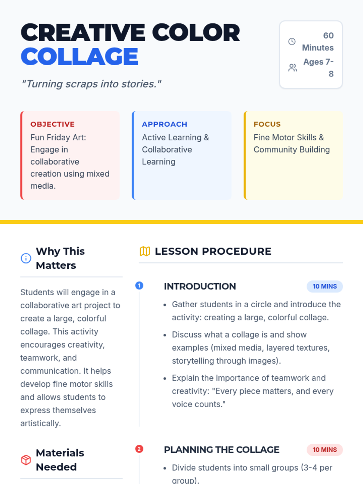 A collaborative art lesson where 7-8 year olds create large-scale color collages to develop teamwork, fine motor skills, and artistic expression.