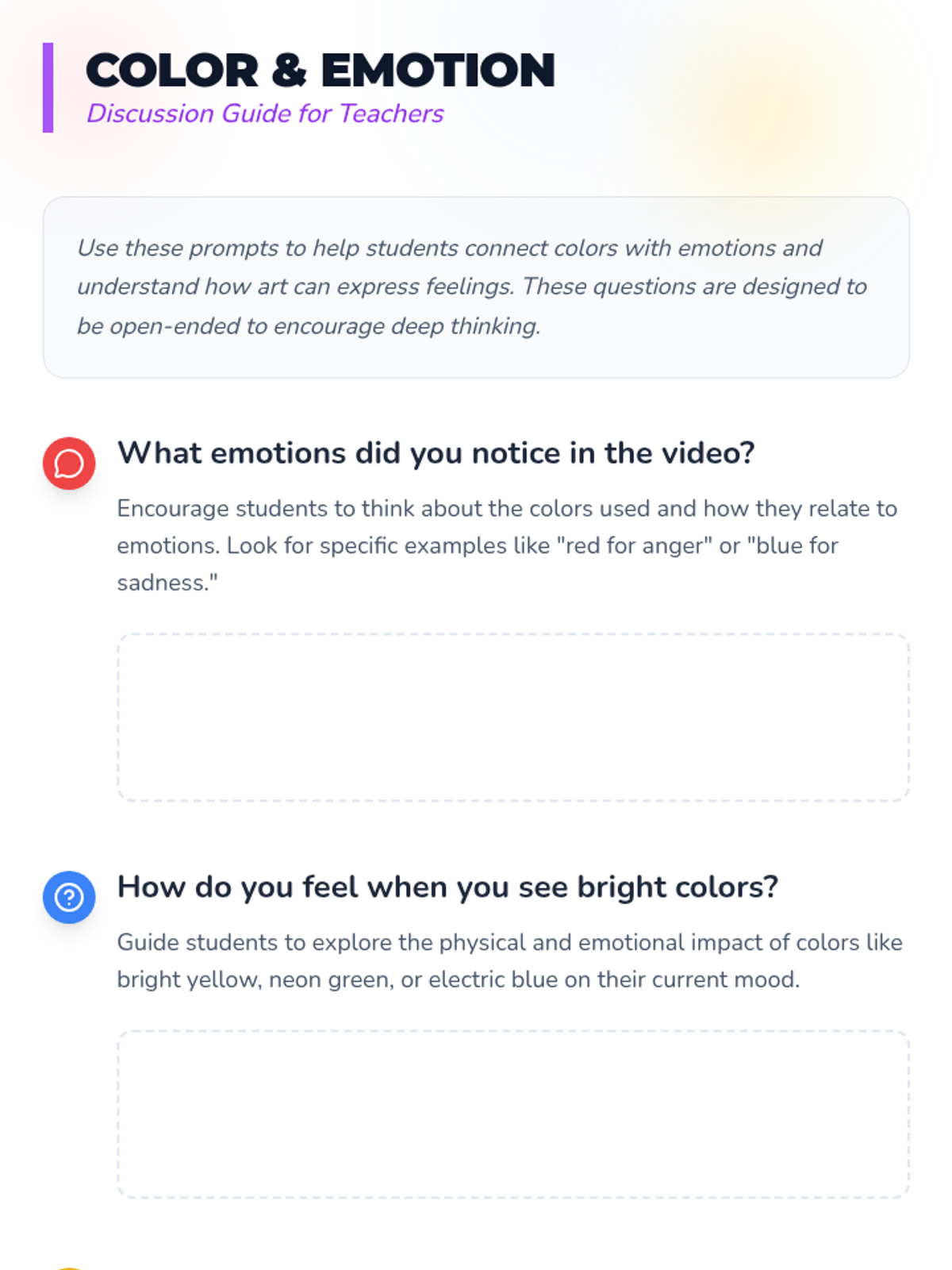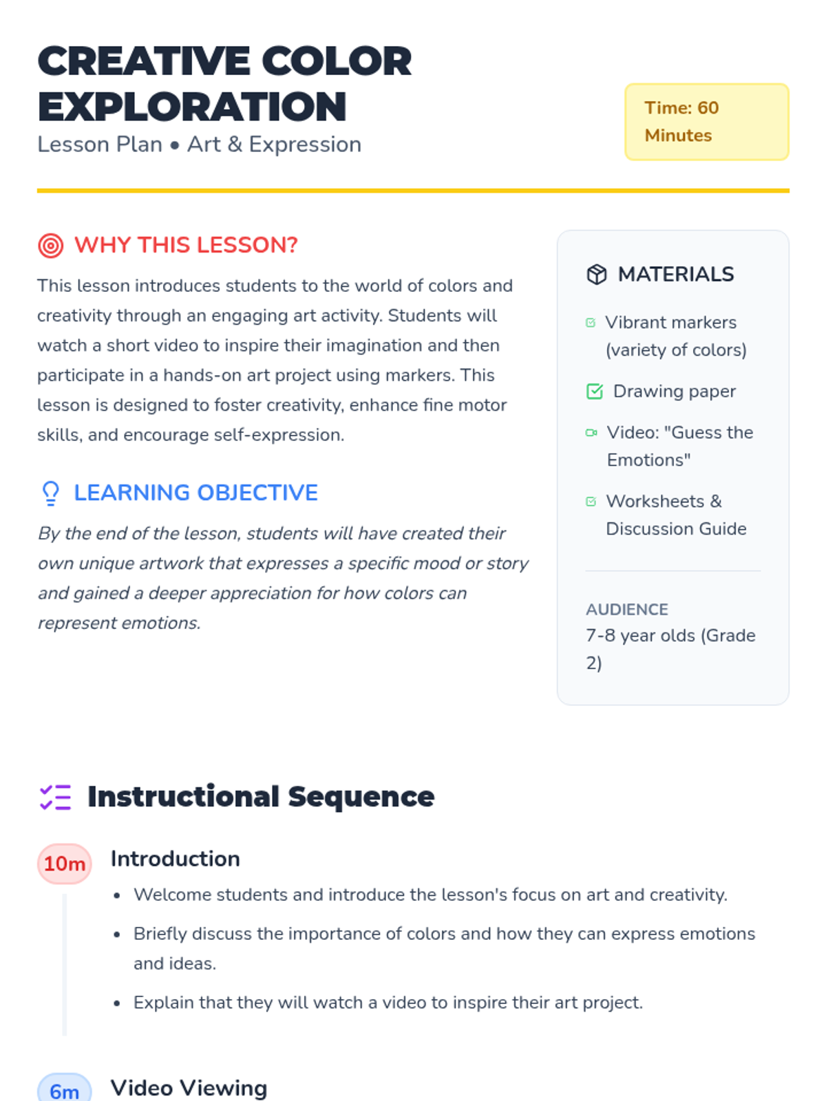 This lesson introduces 7-8 year olds to the connection between colors and emotions through video, discussion, and a hands-on art project using markers.