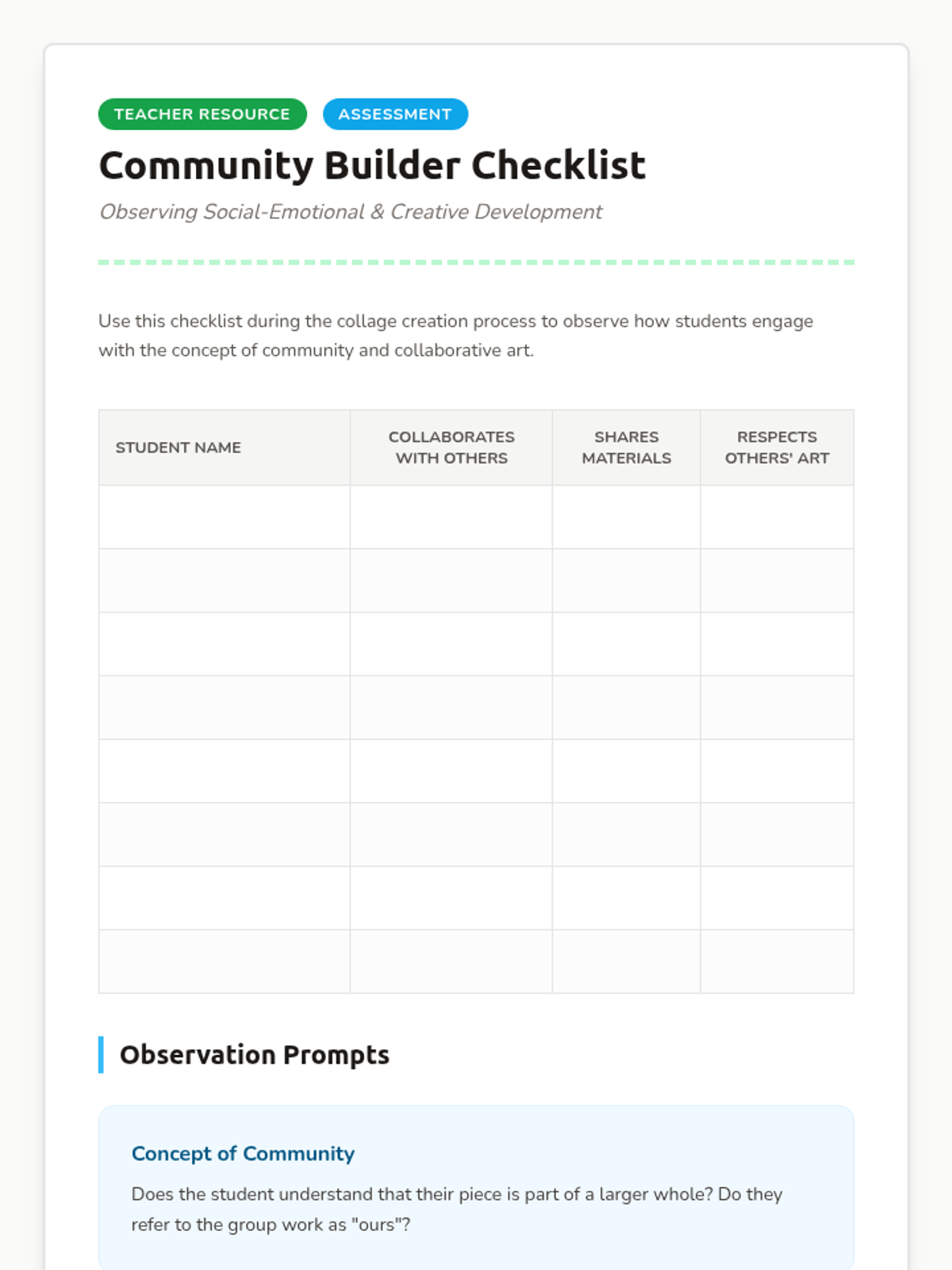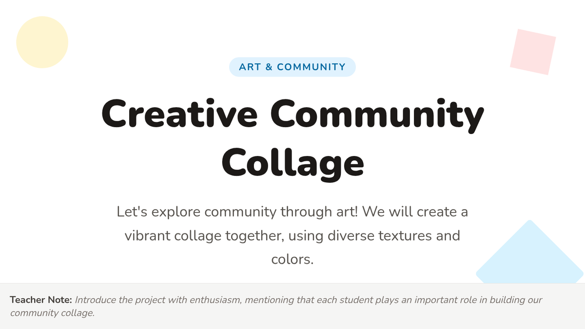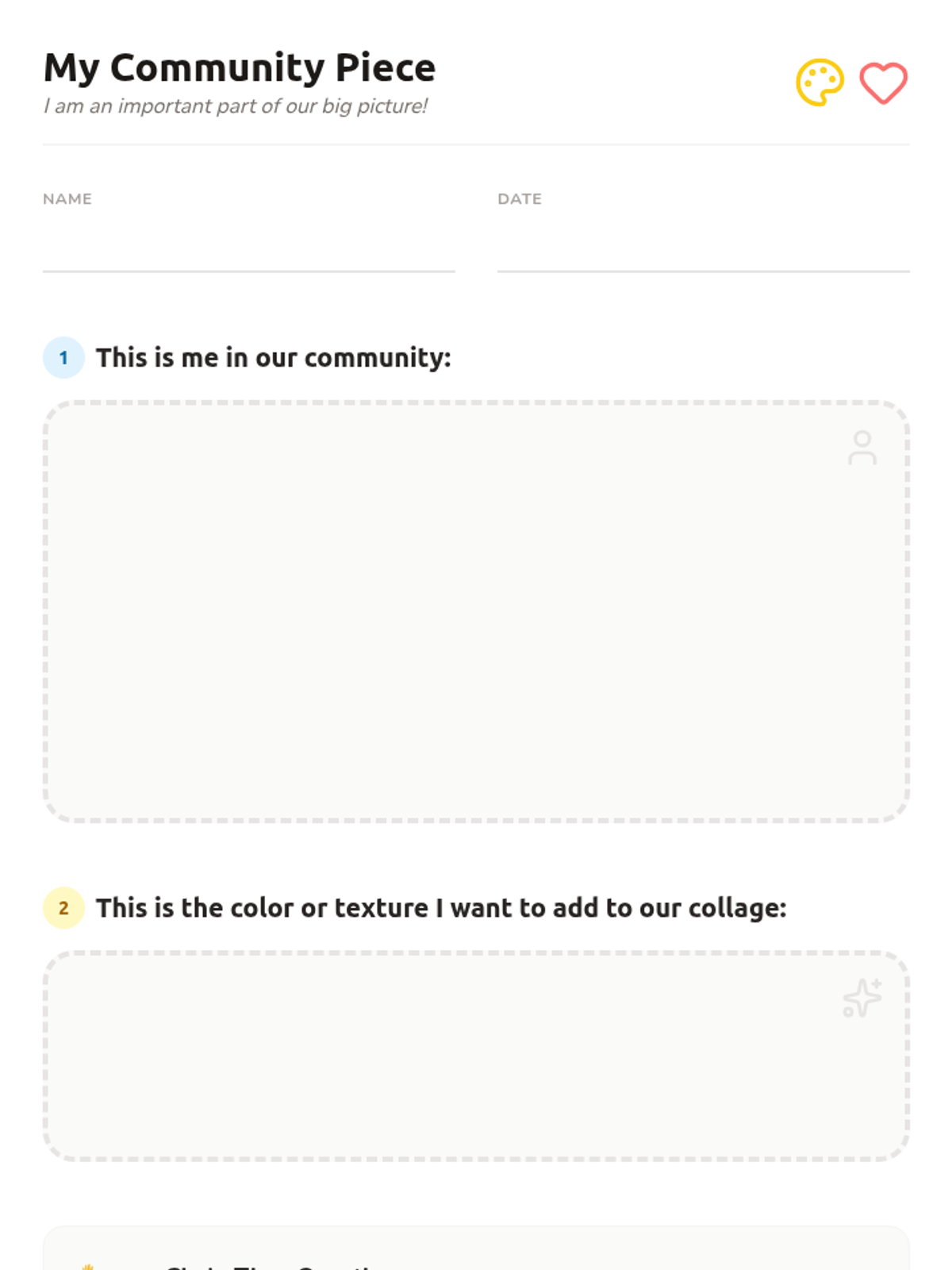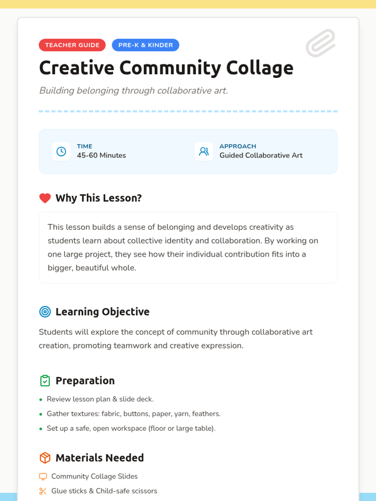 Pre-K and Kindergarten students collaborate to create a colorful collage that depicts the concept of community. By using various textures and materials, they learn about collective identity and teamwork.