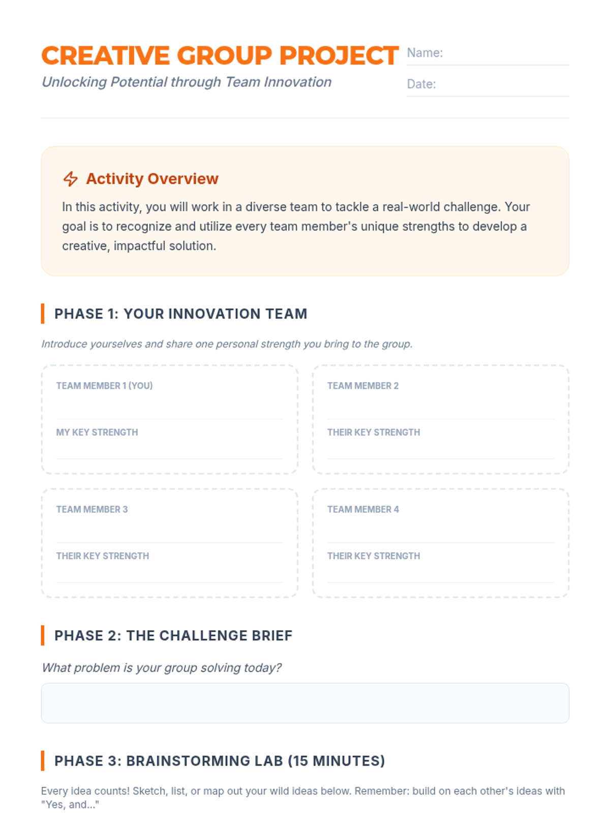 This lesson focuses on building self-esteem and creative problem-solving through practical, hands-on group projects. Students will learn to identify their individual strengths, collaborate in diverse teams, and develop innovative solutions to everyday challenges.