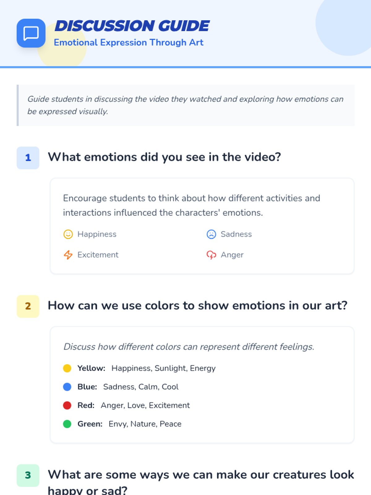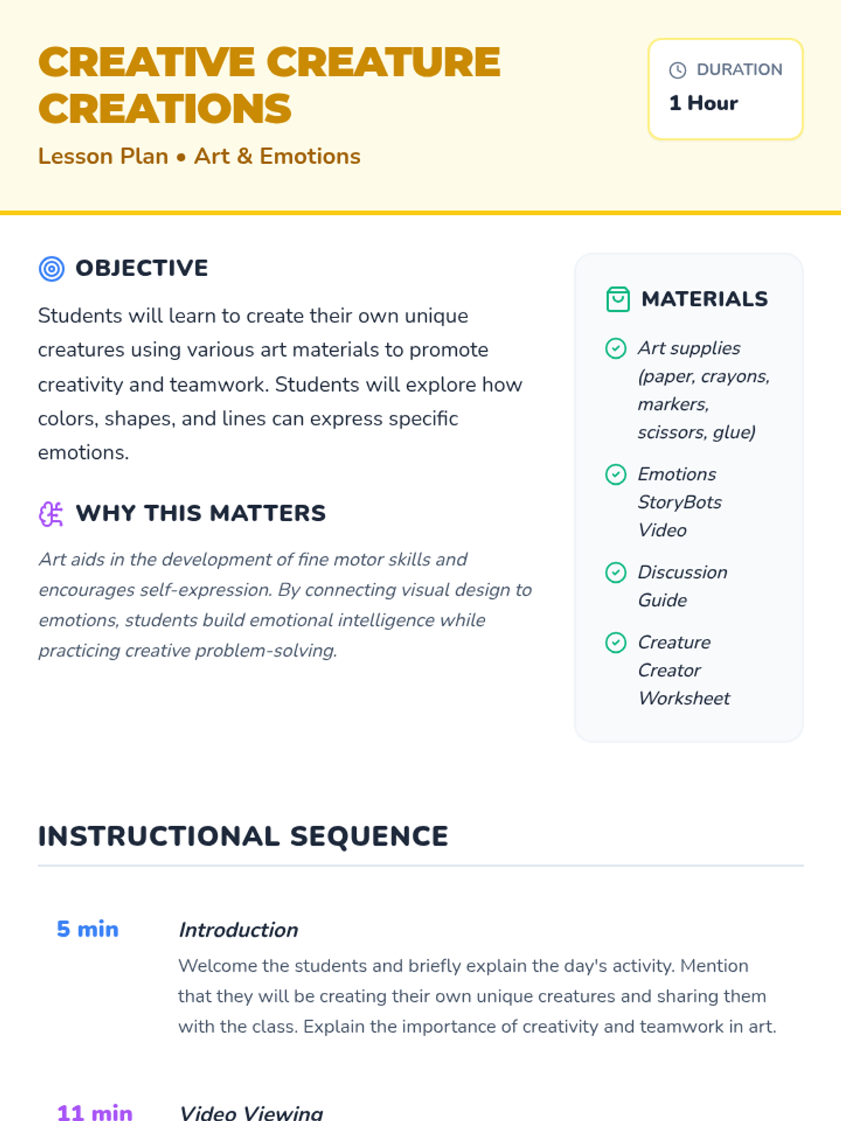 A fun, hands-on art lesson where students explore emotions through character design, creating unique creatures using various colors and shapes.