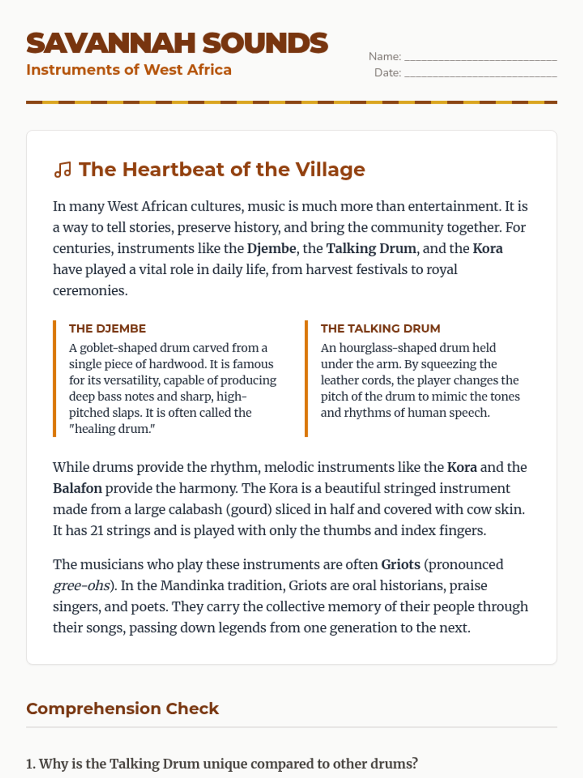 A 2nd grade music and science integration lesson where students investigate how vibrations produce sound and classify musical instruments by their vibrating parts.