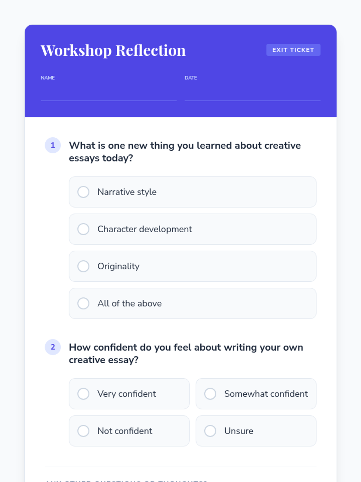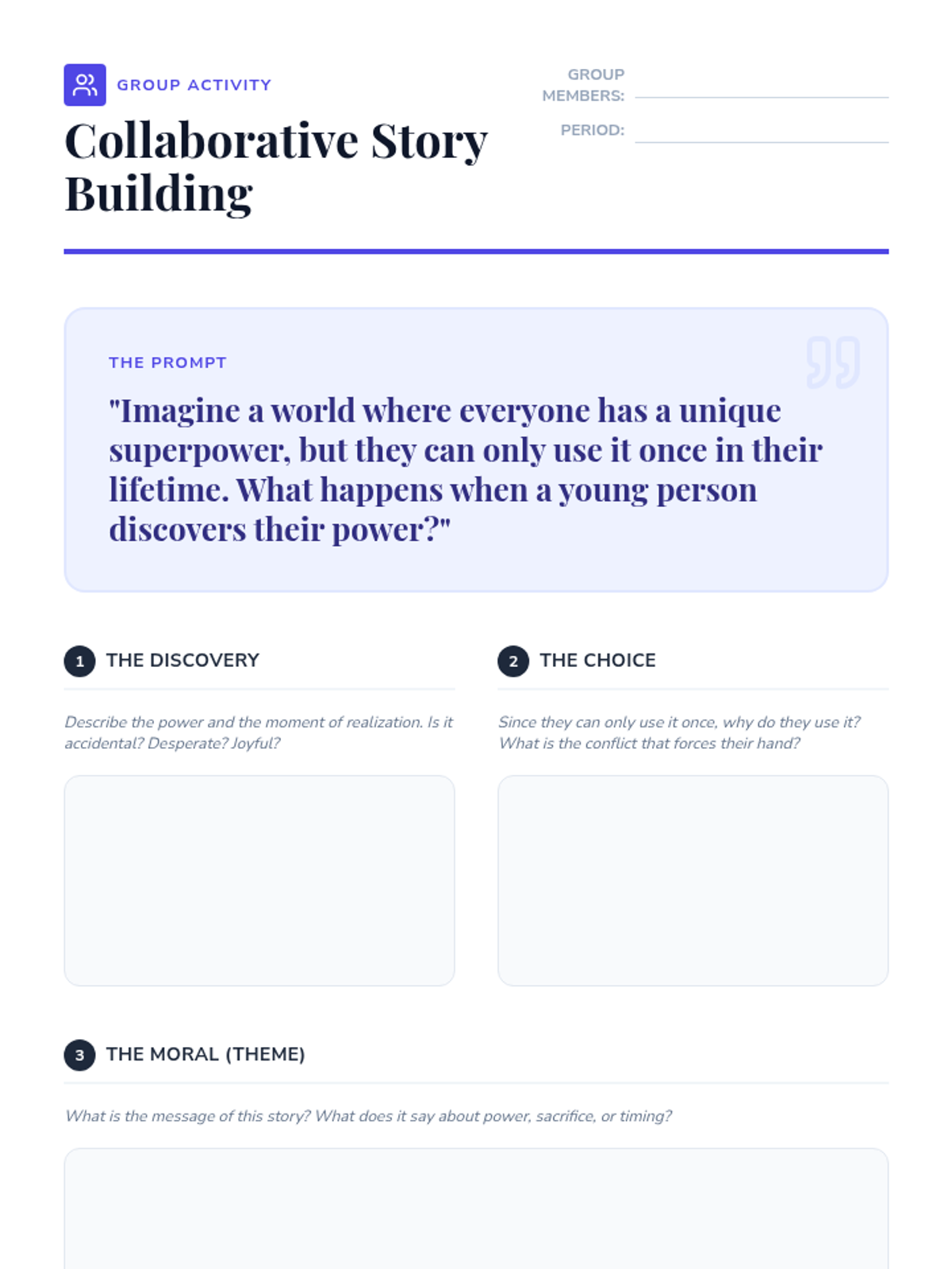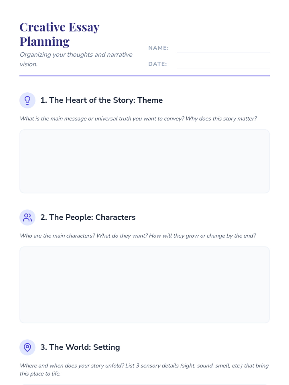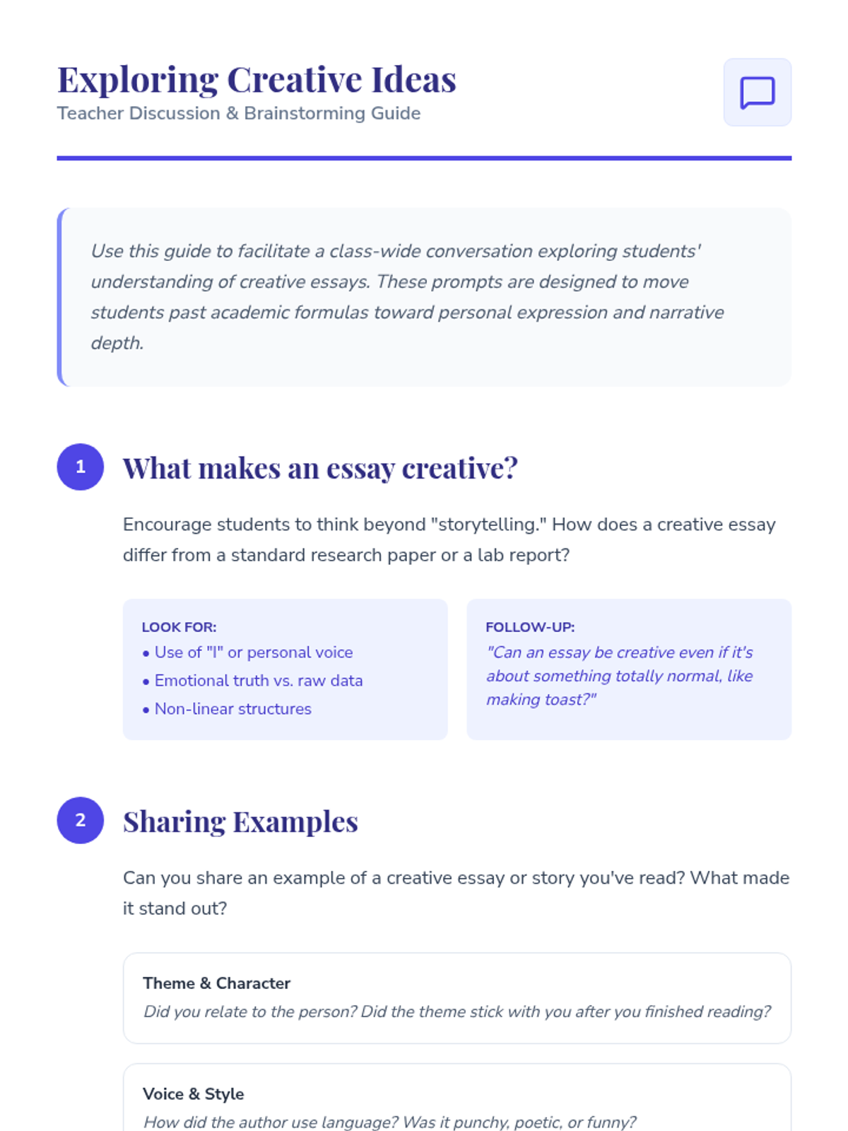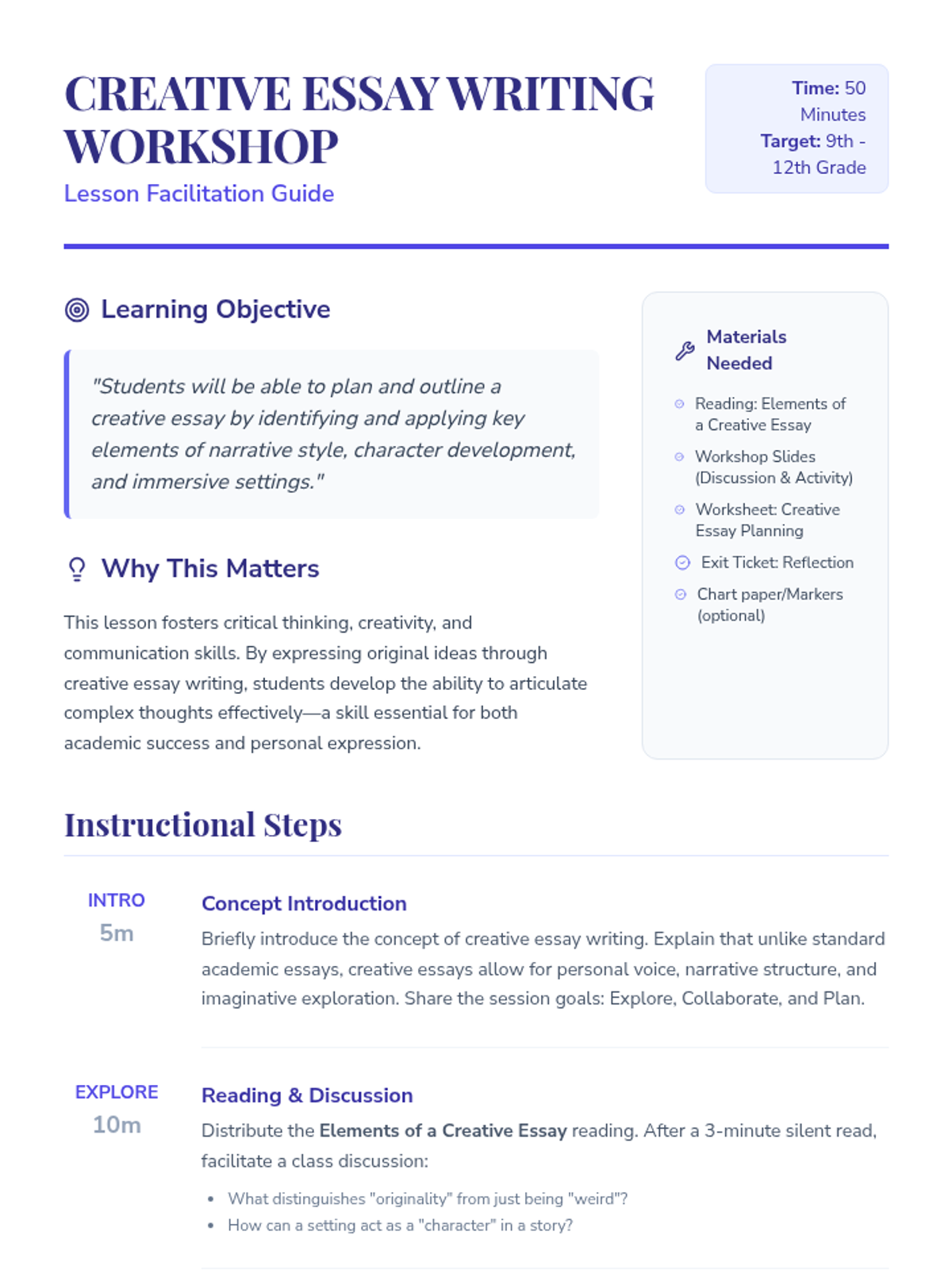This lesson guides students through the process of writing a creative essay, encouraging them to express their ideas and creativity through collaborative activities and structured planning. Students will learn the key elements of creative writing and apply them to develop their own unique narratives.