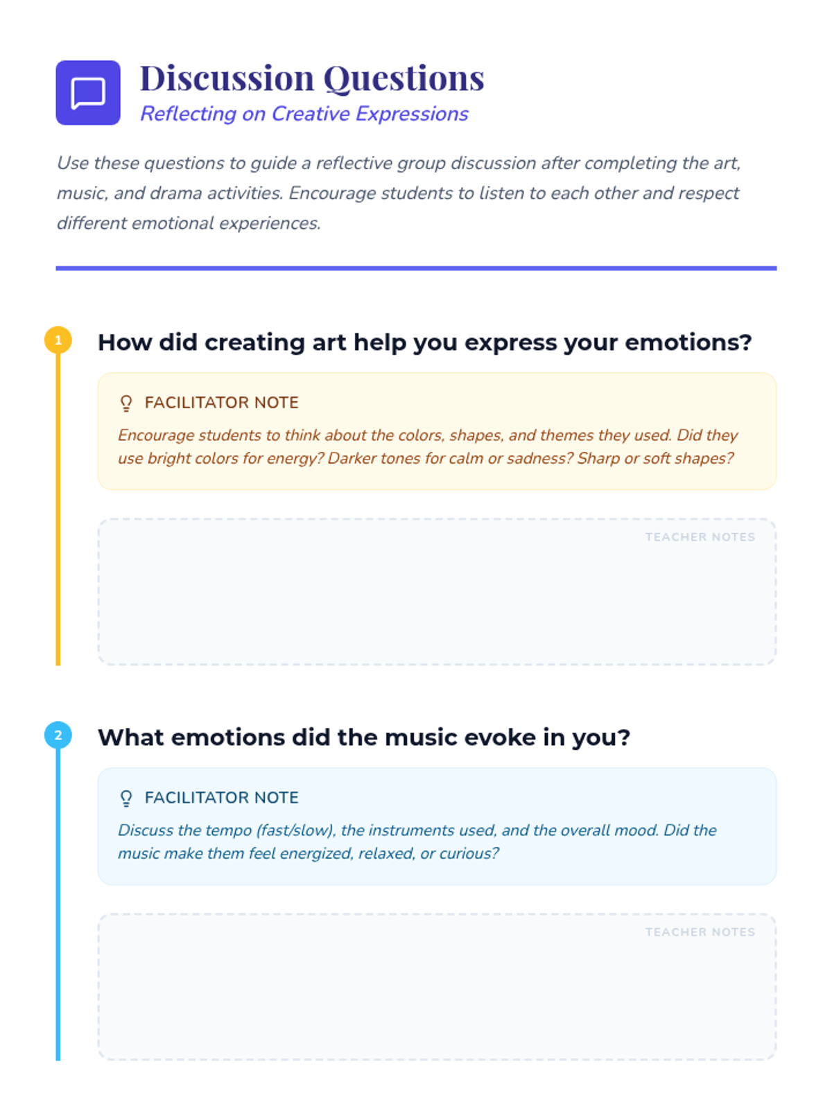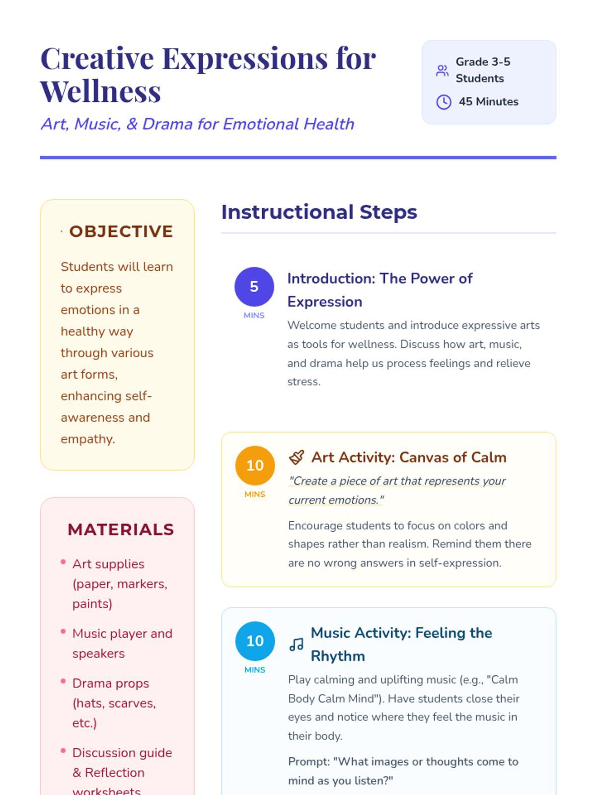 This lesson engages Grade 3-5 students in creative arts activities, including art, music, and drama, to promote emotional expression and stress relief. By participating in these activities, students will learn to express their emotions in a healthy way, enhancing their mental well-being and developing skills in self-awareness and empathy.