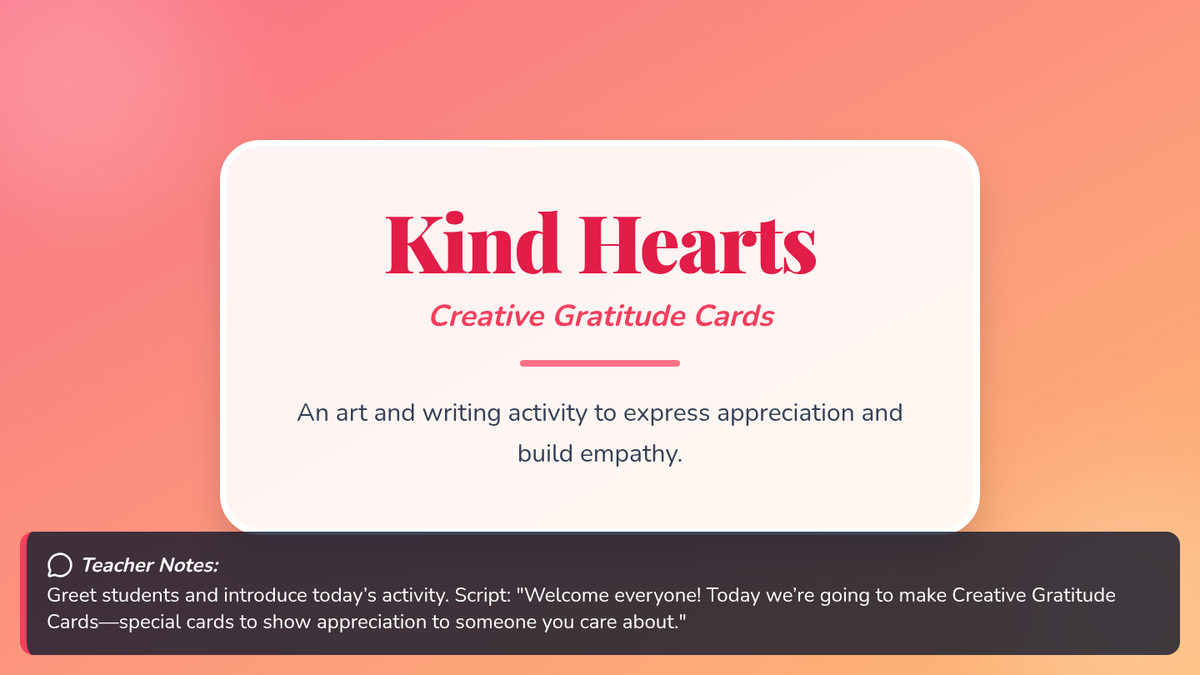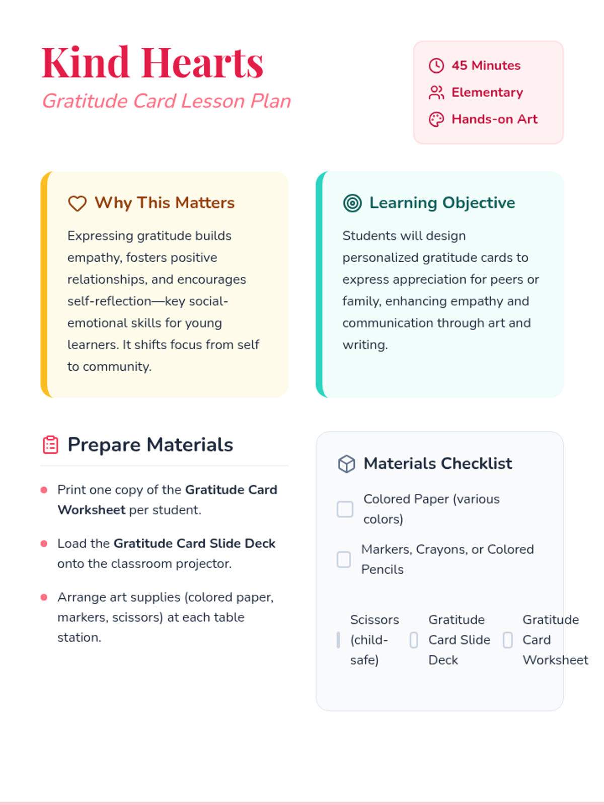 Students design and craft personalized gratitude cards to express appreciation for peers, teachers, or family members, fostering empathy and community.
