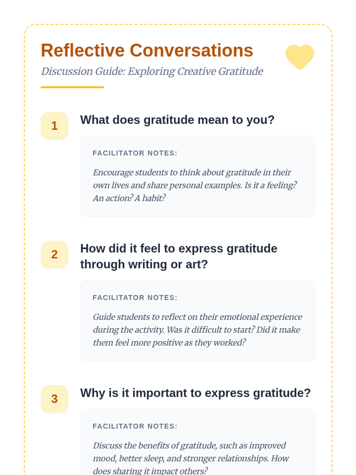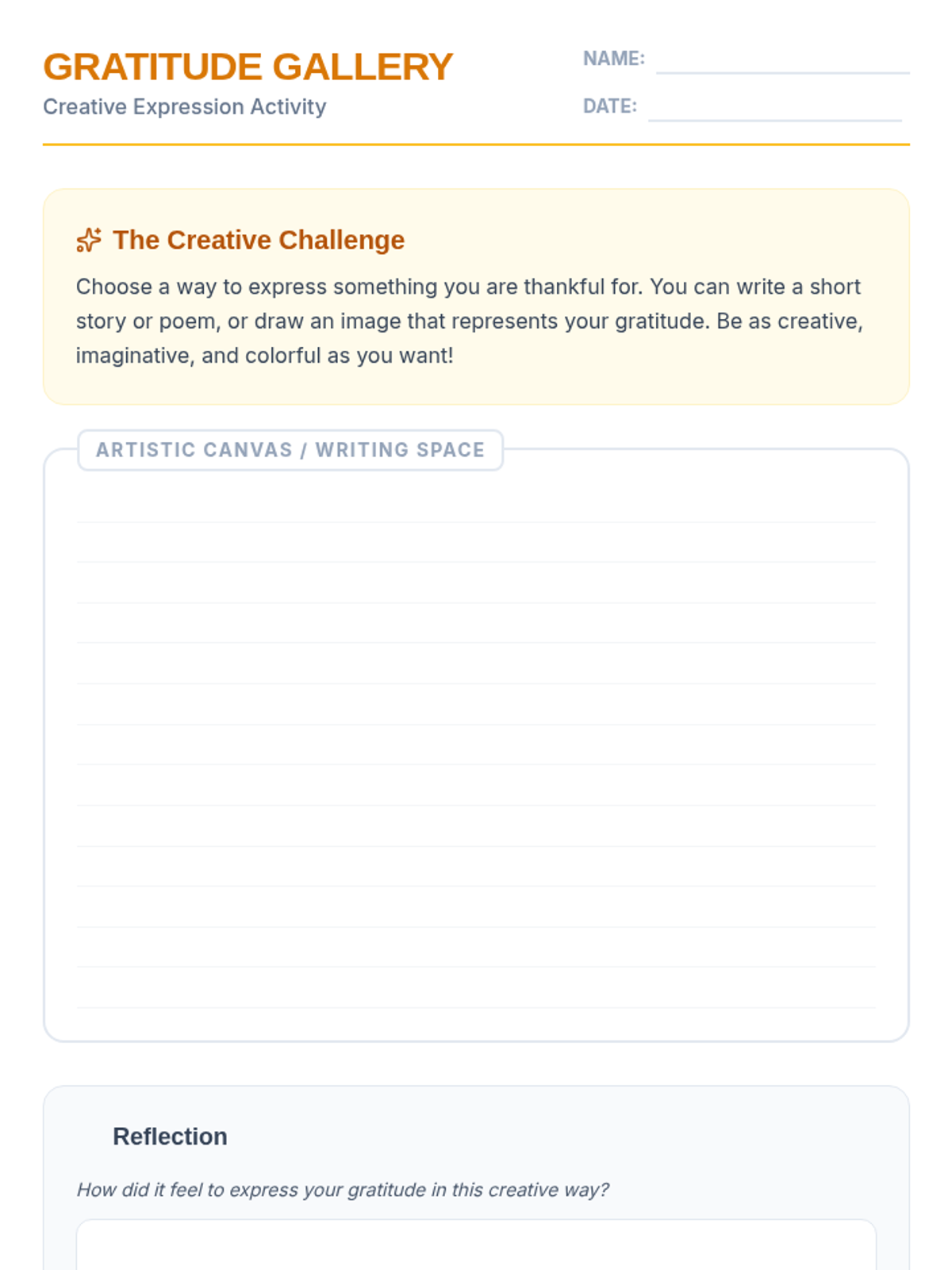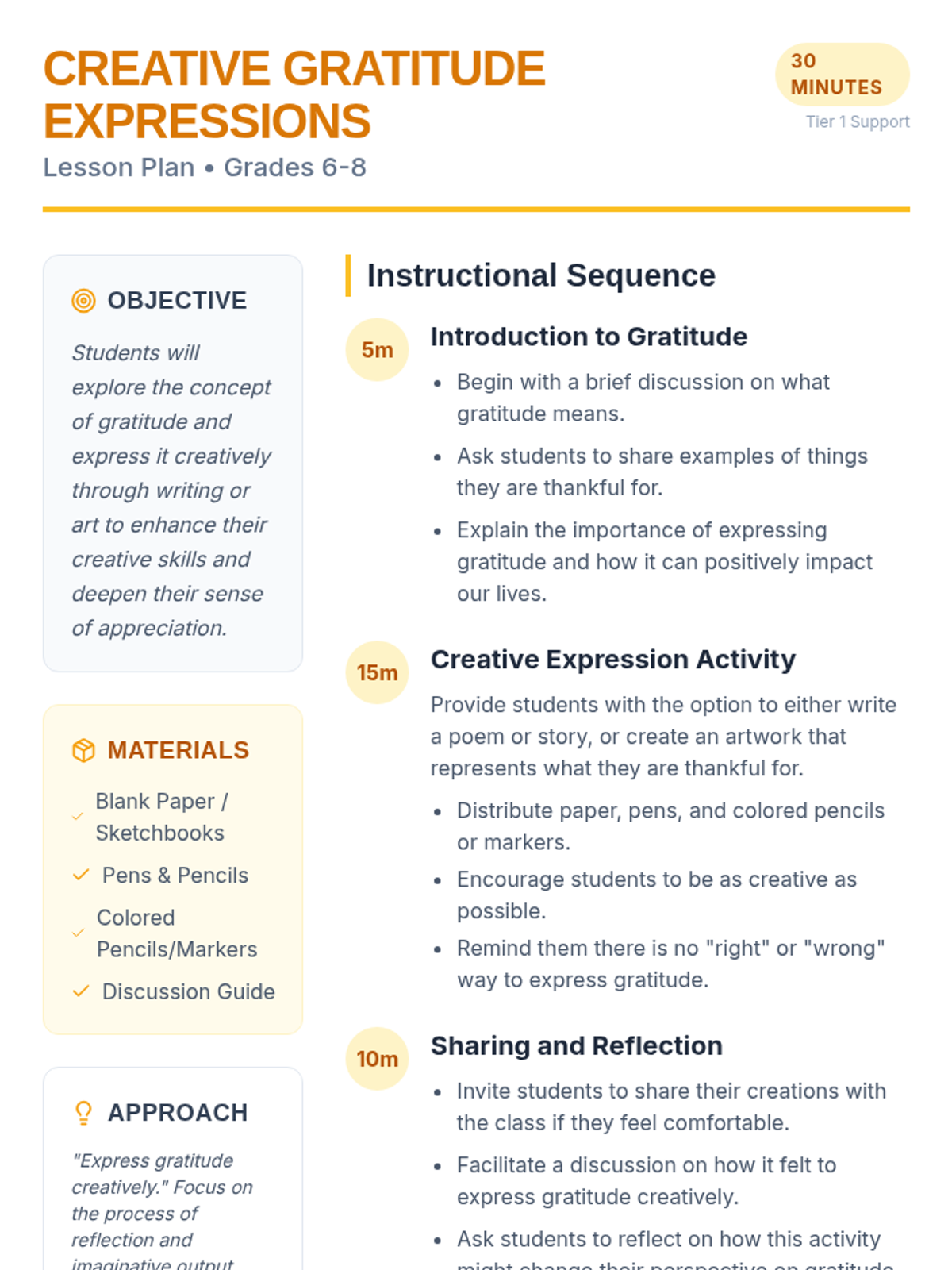 A 30-minute lesson for Grades 6-8 exploring gratitude through creative writing and art to foster appreciation and emotional well-being.