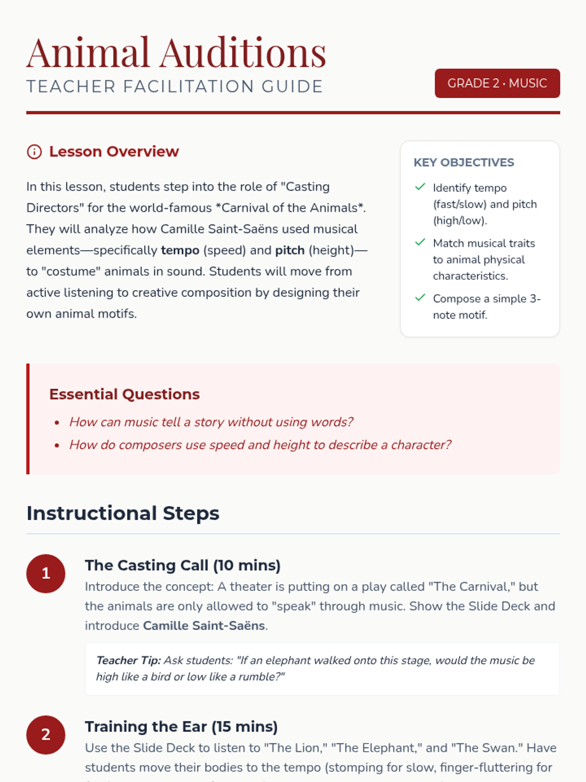 A theatrical exploration of Saint-Saëns' 'The Carnival of the Animals' where 2nd graders act as casting directors to match musical traits like tempo and pitch to animal characters.