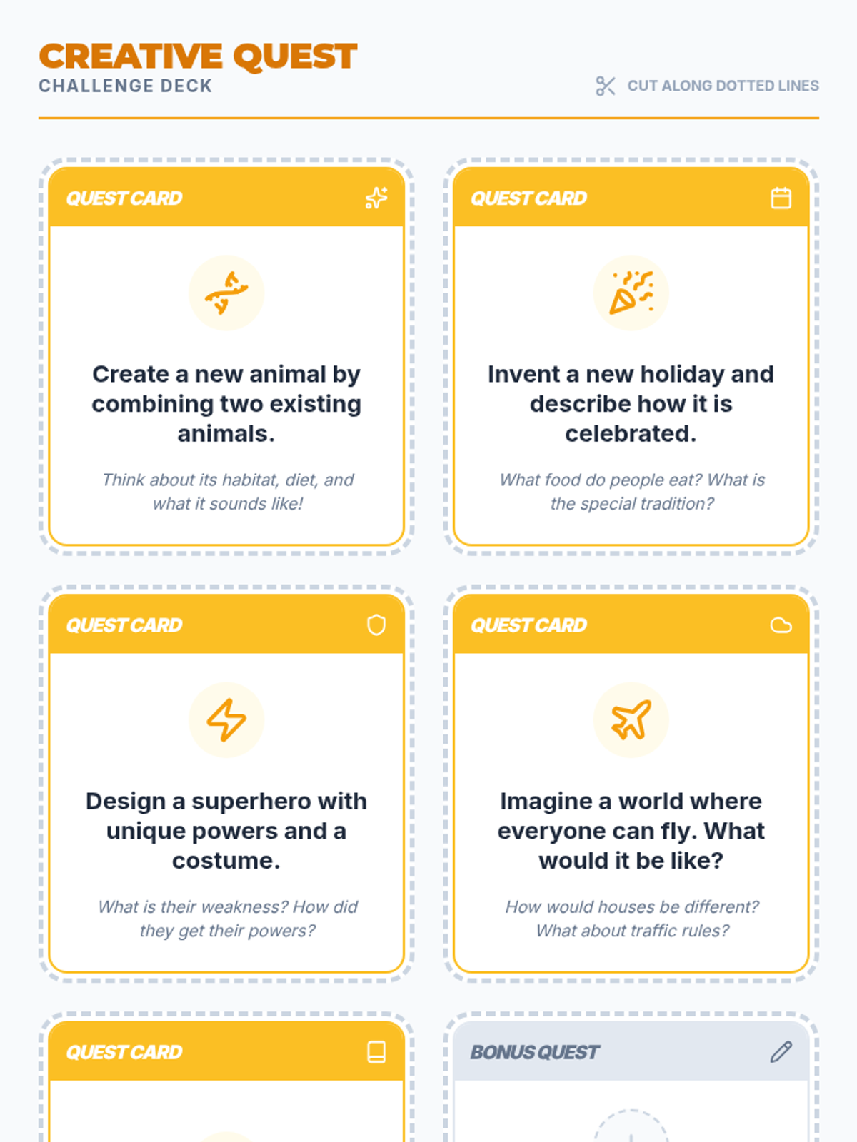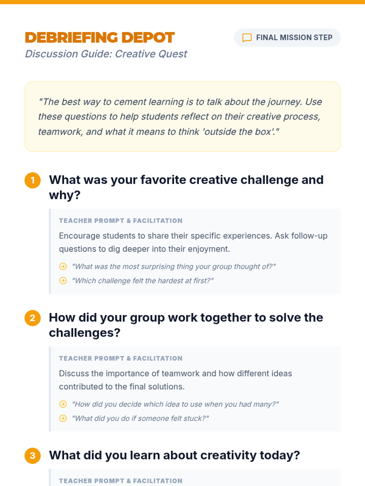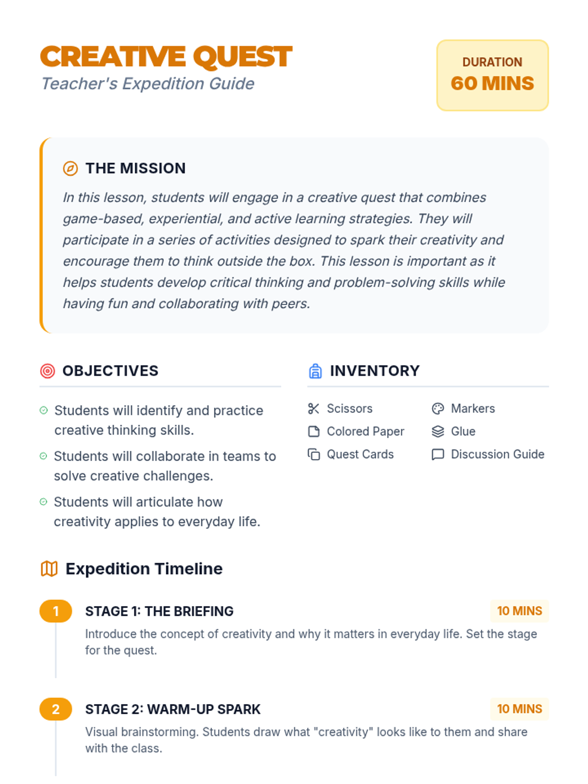 A game-based lesson where students embark on a creative adventure, completing challenges that build critical thinking and collaborative skills.