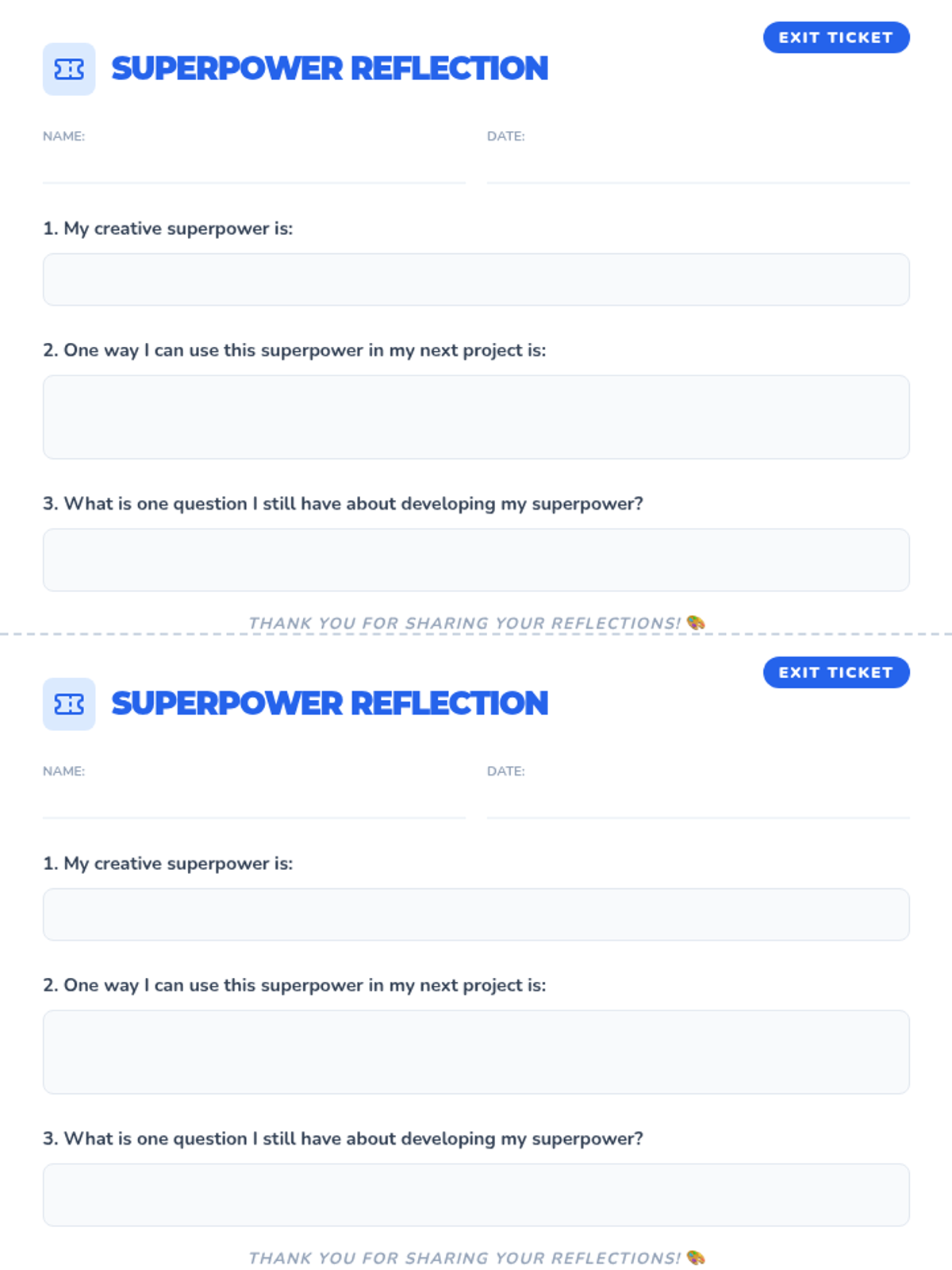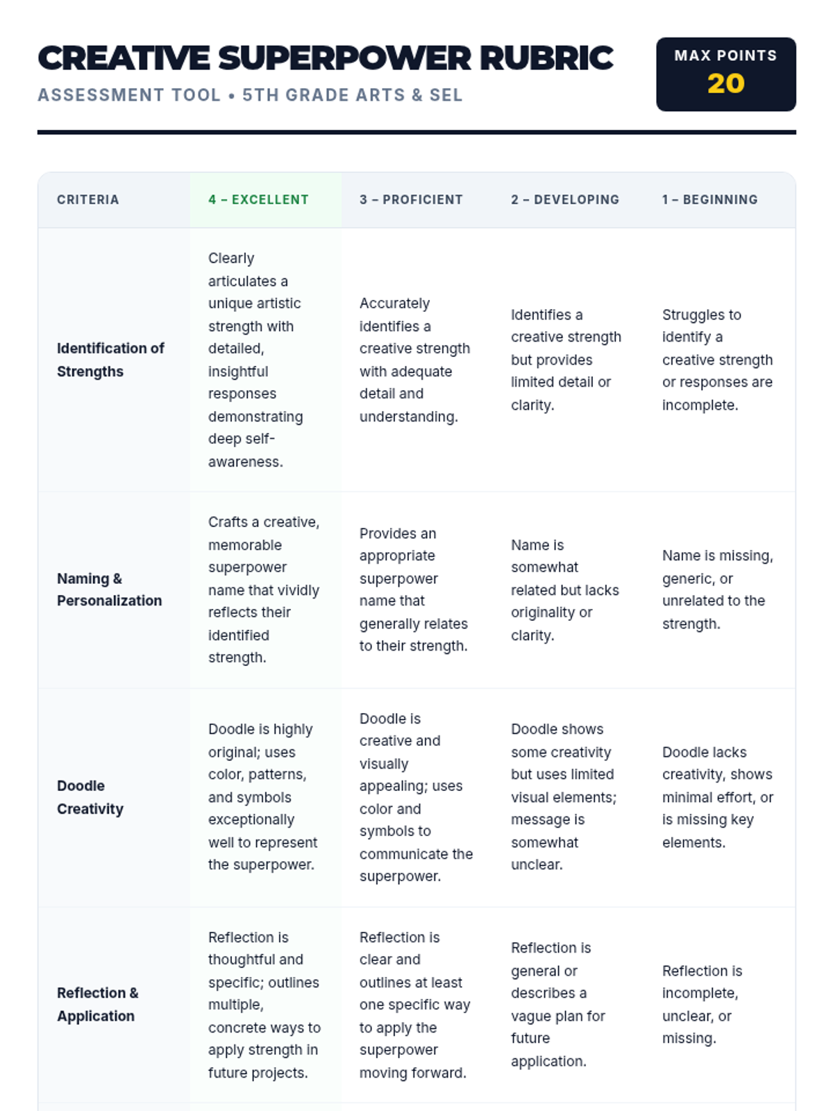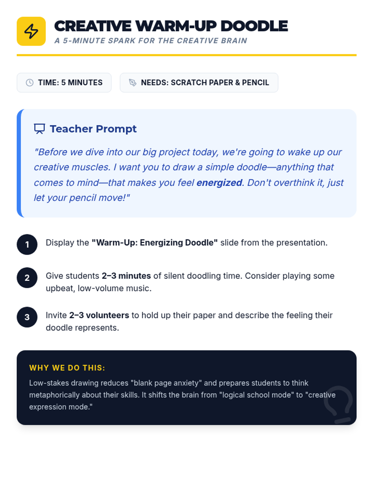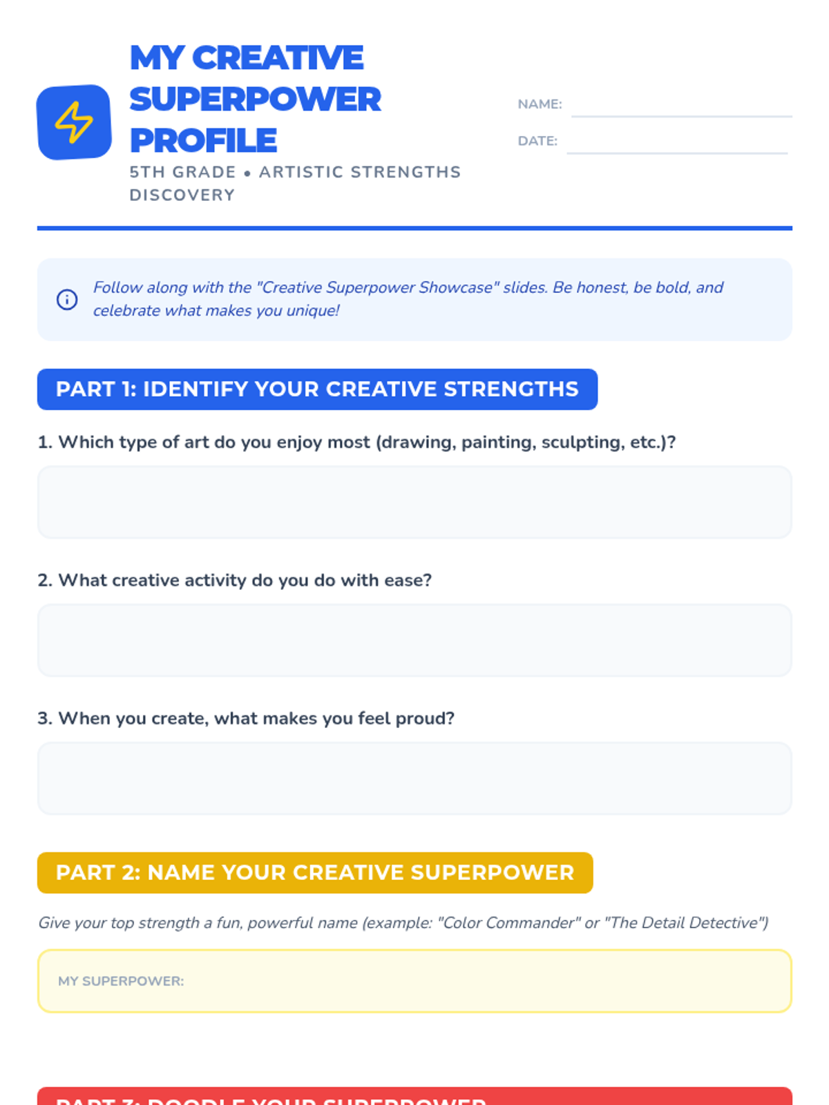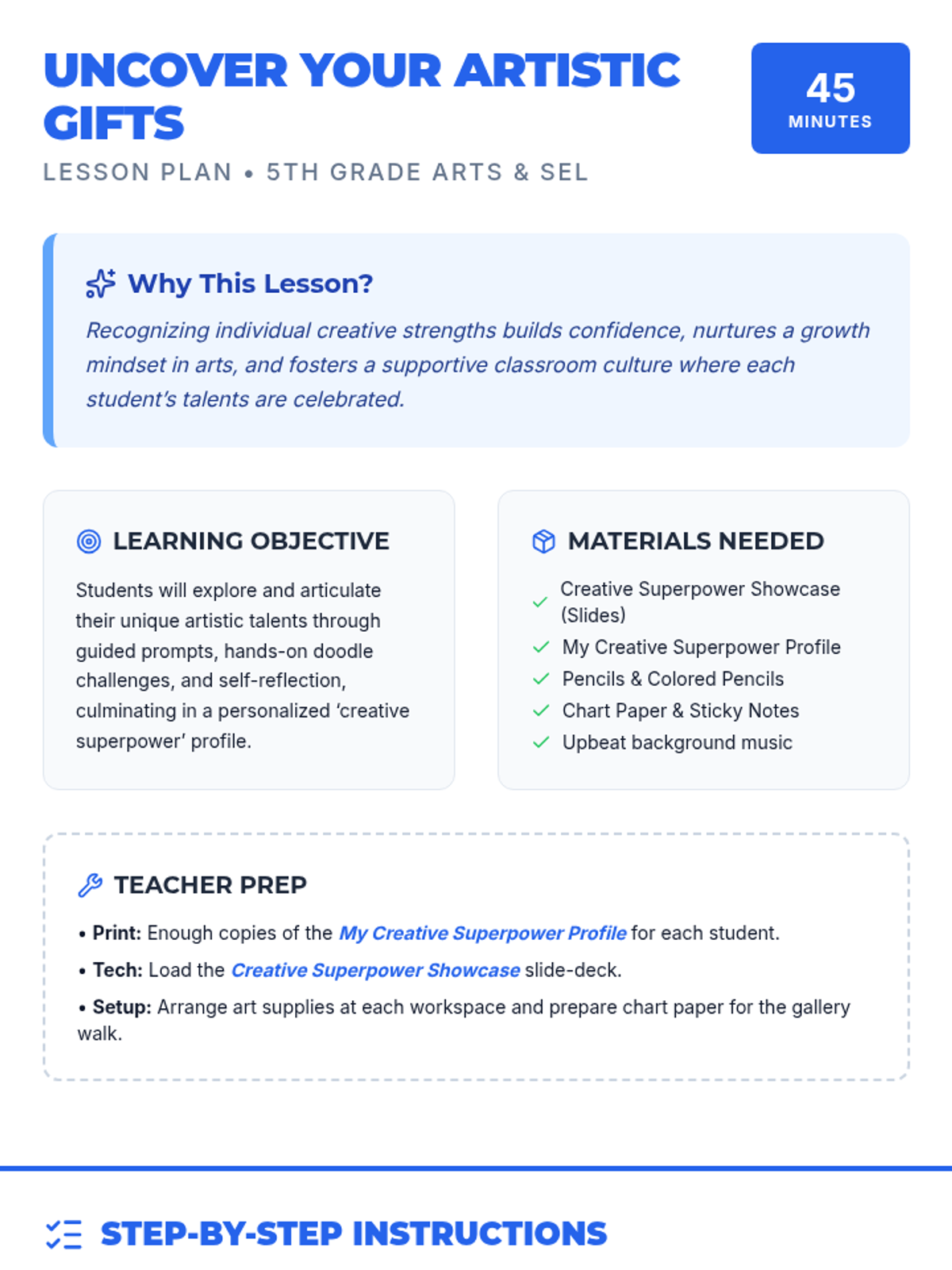 A 45-minute Tier 1 lesson for 5th graders to discover and celebrate their unique artistic strengths through reflection, doodling, and a gallery walk.