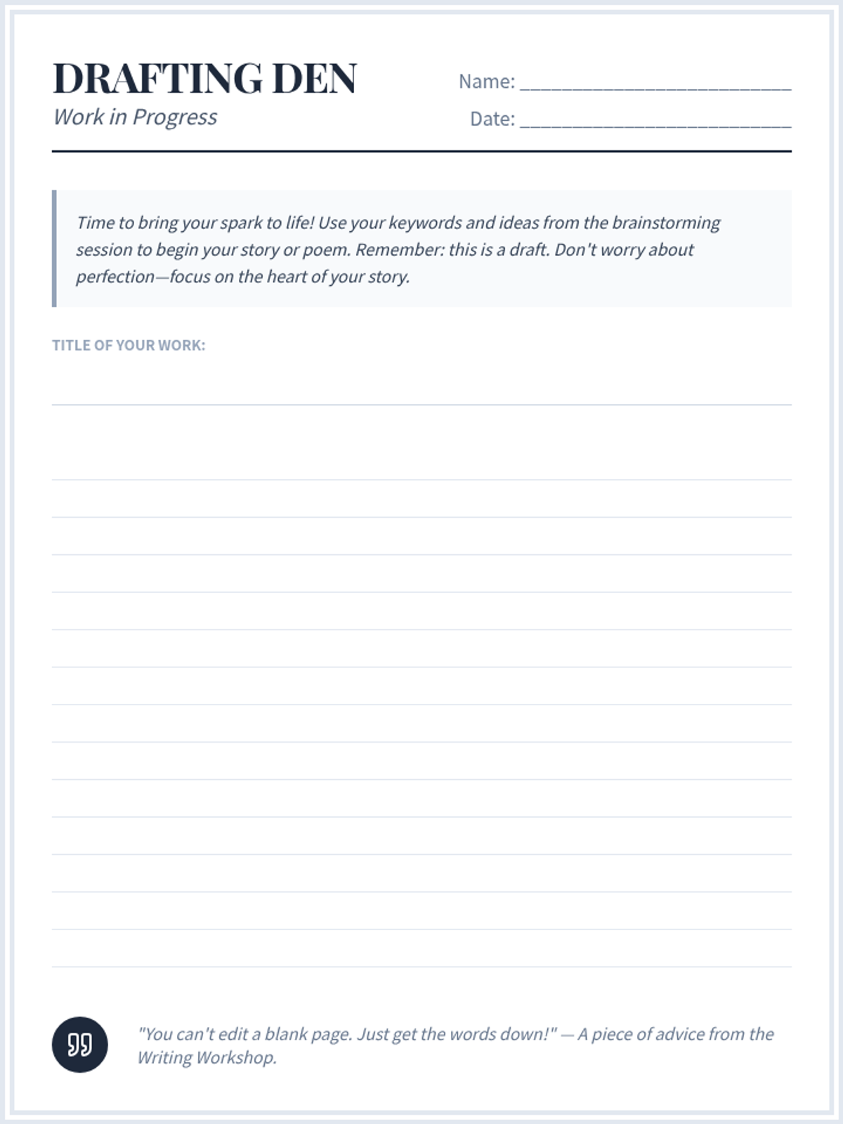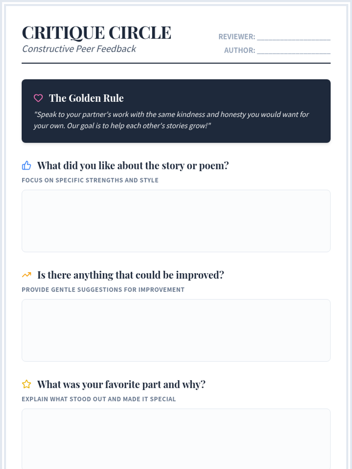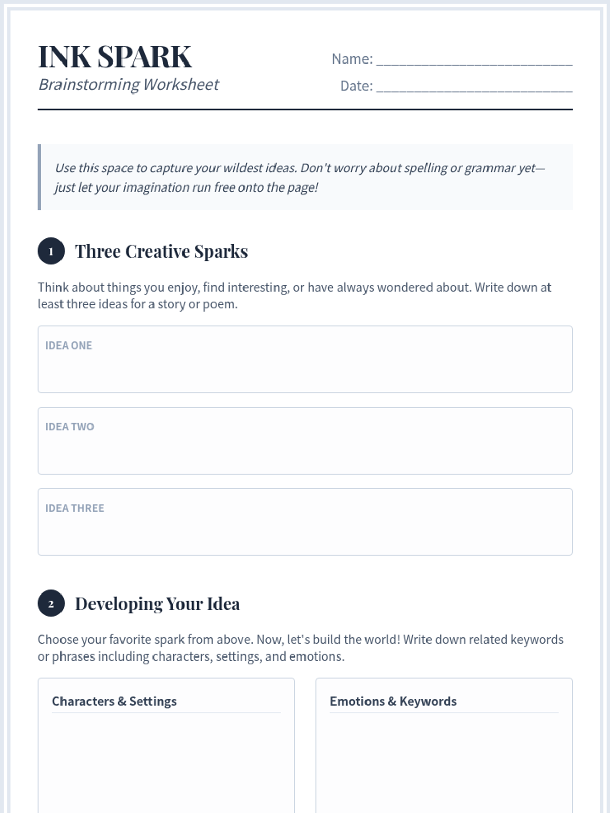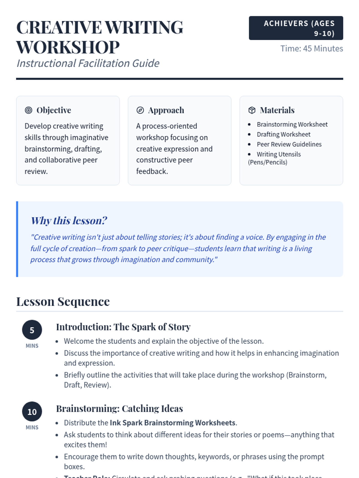 In this lesson, students will enhance their creative writing skills by crafting short stories or poems. They will engage in brainstorming, drafting, and peer review activities to help them develop their ideas and improve their writing.