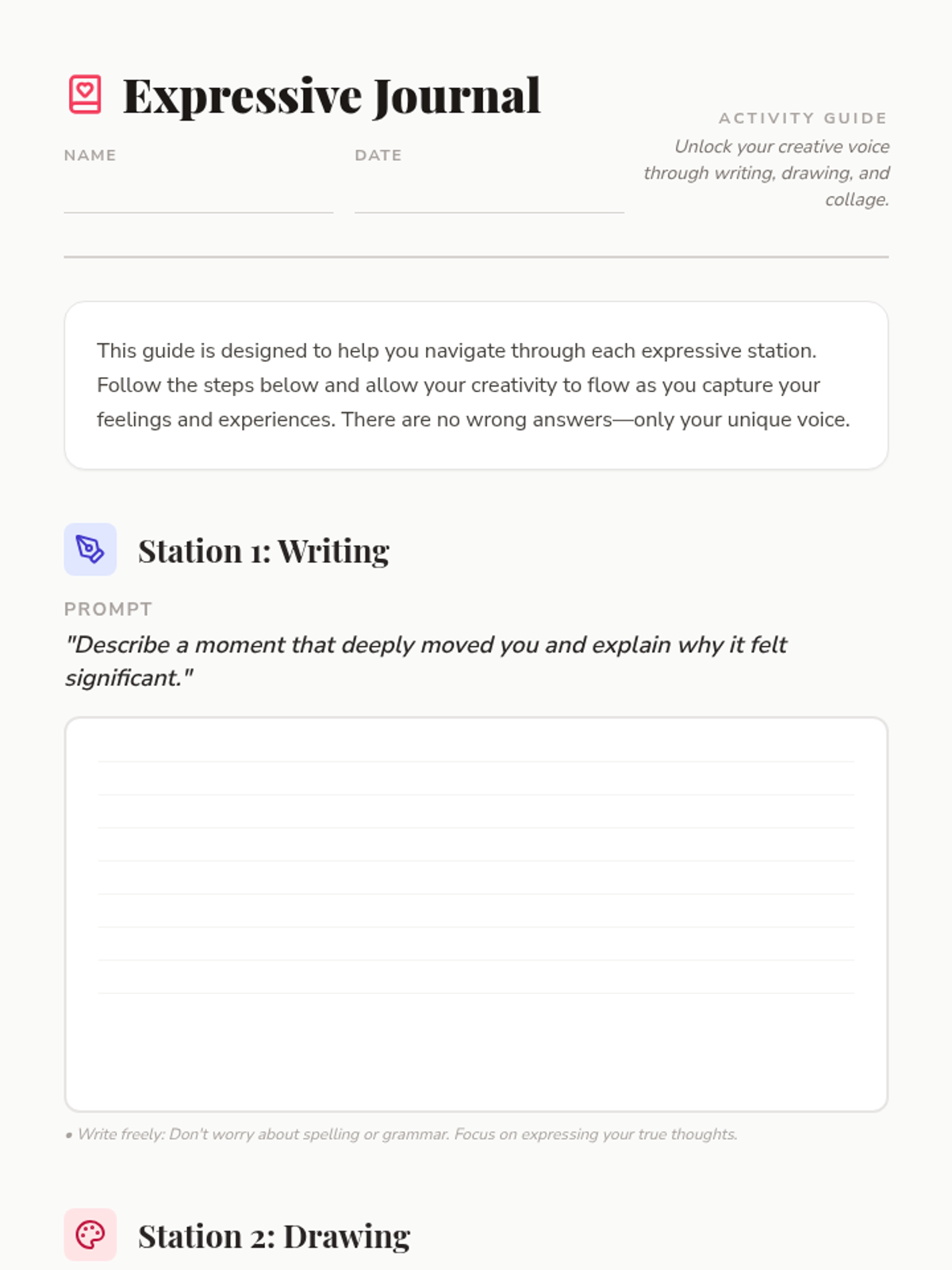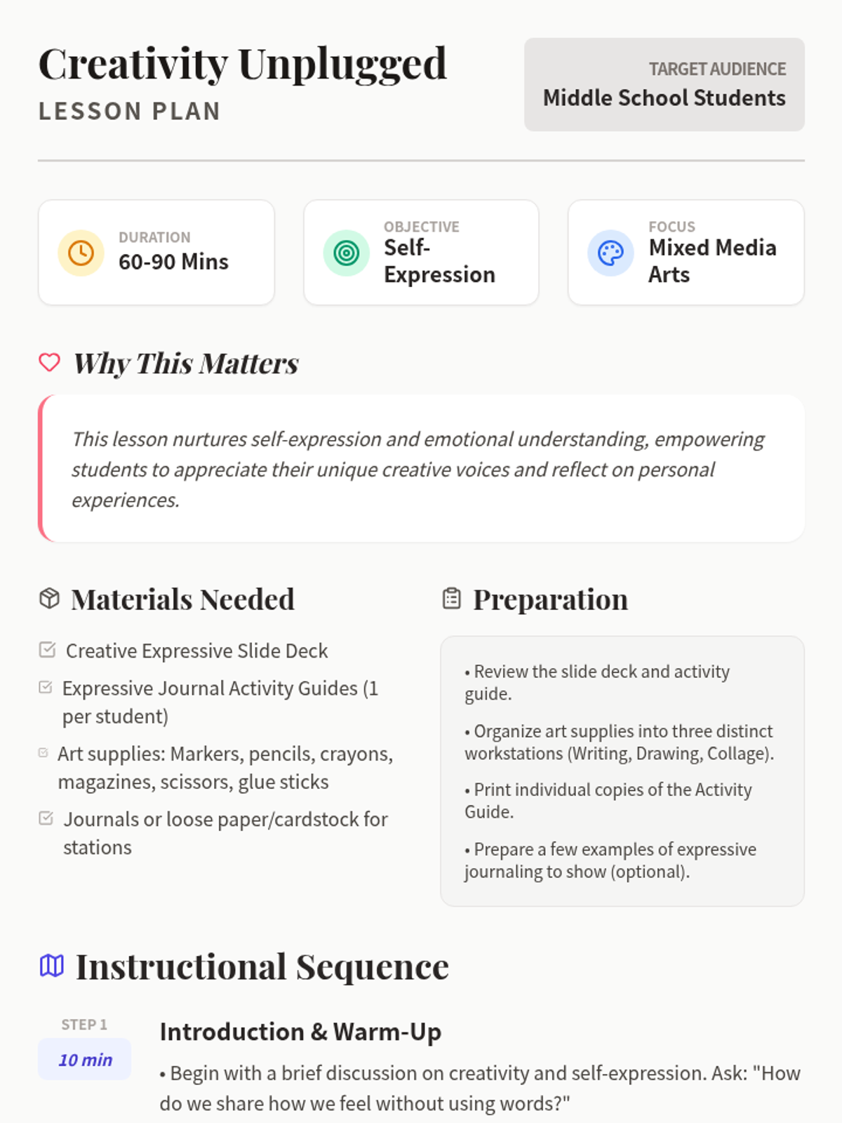 This lesson fosters self-expression and emotional literacy in middle school students through the creation of expressive journals using writing, drawing, and collage. Students explore their unique creative voices while practicing mindfulness and reflection in a supportive environment.