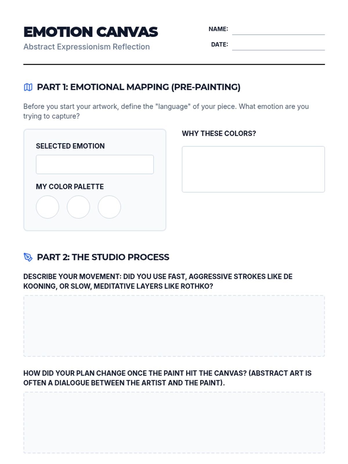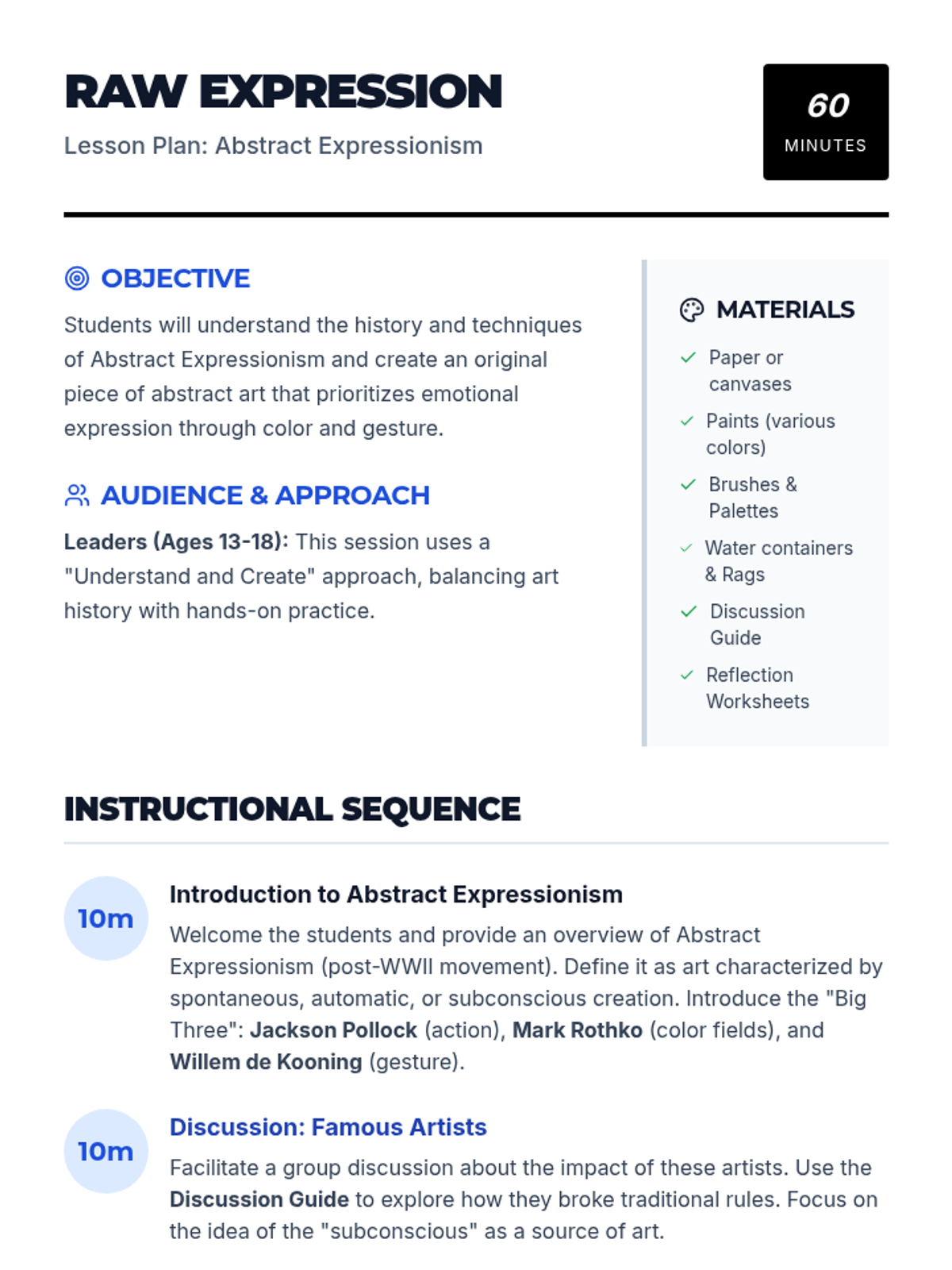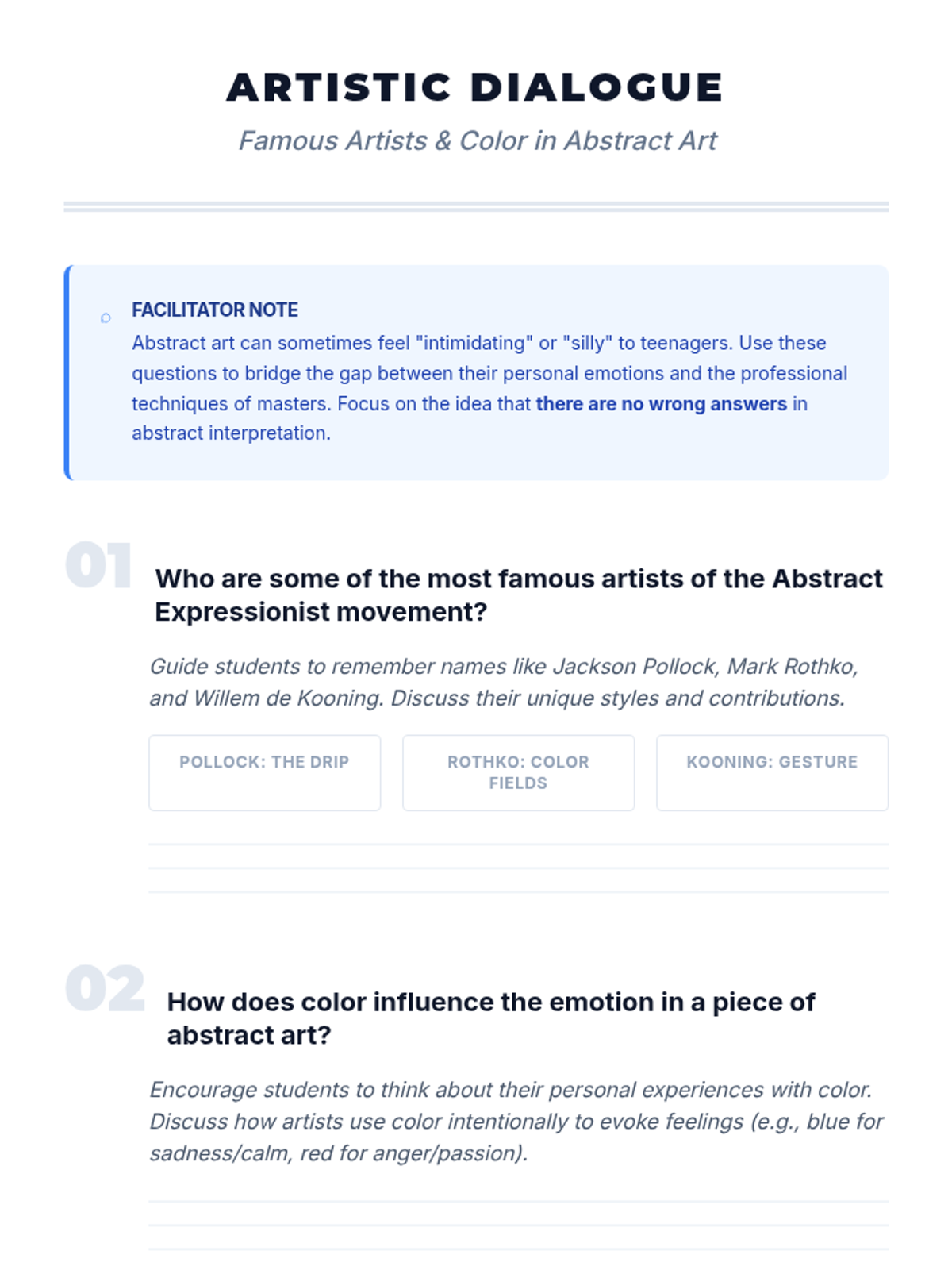 Students explore the history, artists, and techniques of Abstract Expressionism, focusing on how color and gesture convey emotion. They will create their own abstract pieces and reflect on the creative process.