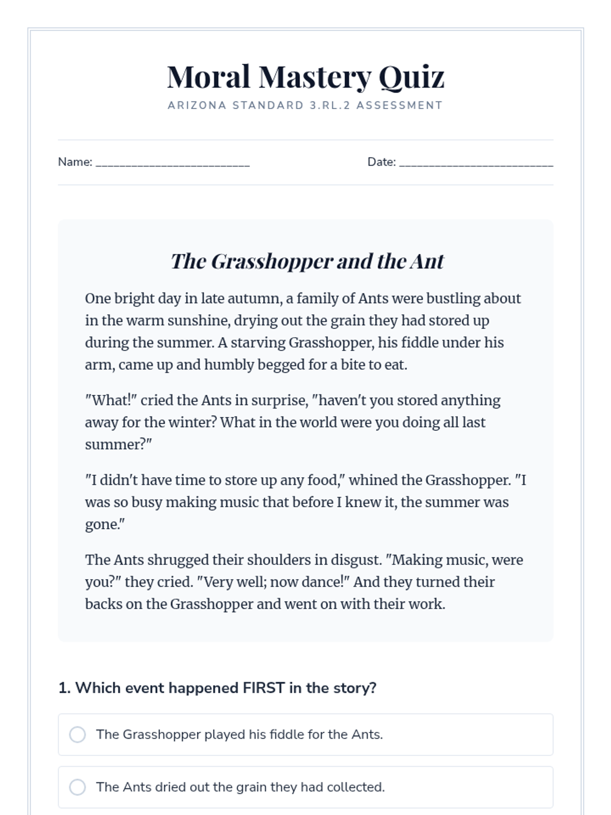 A formal assessment of 3.RL.2 skills using multiple-choice questions over a new folktale.