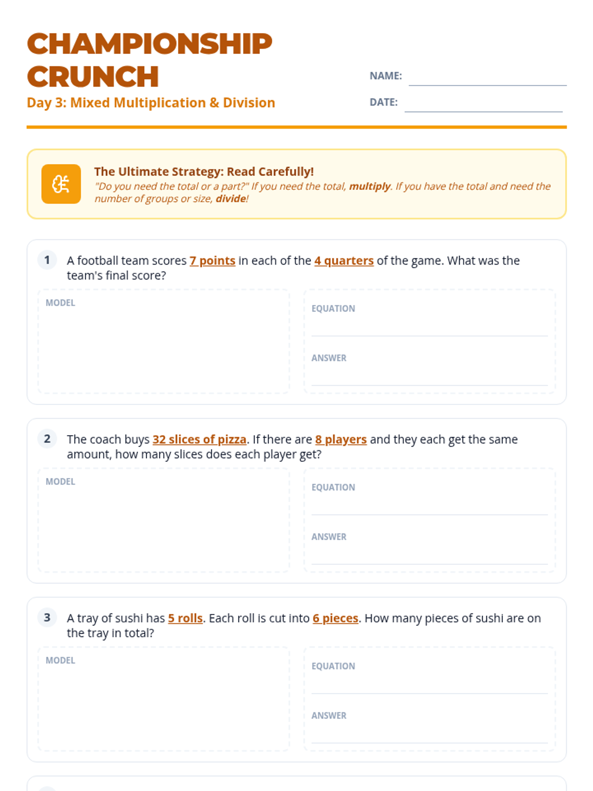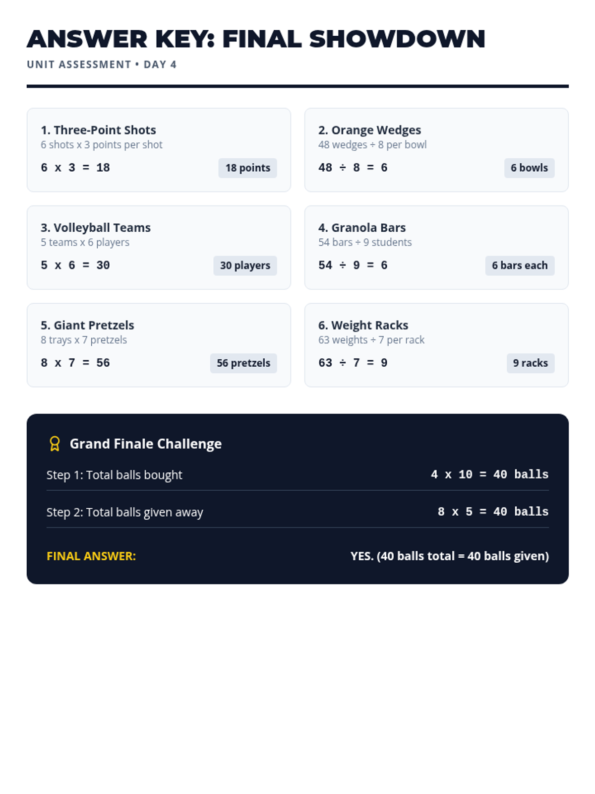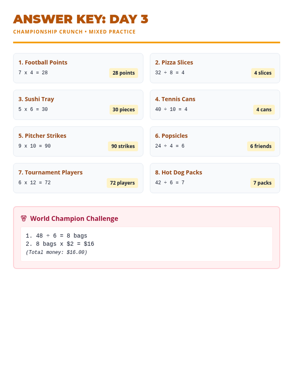A culminating mixed practice session where students solve both multiplication and division problems across food and sports scenarios.