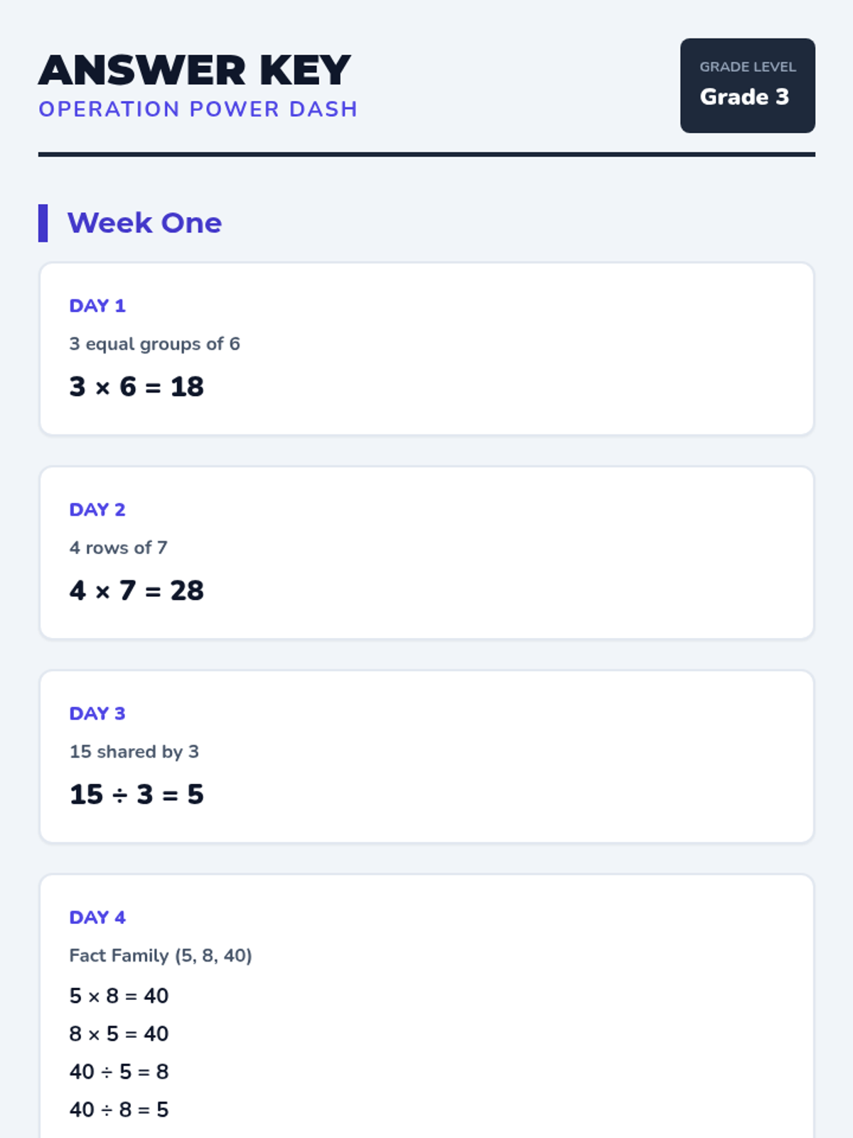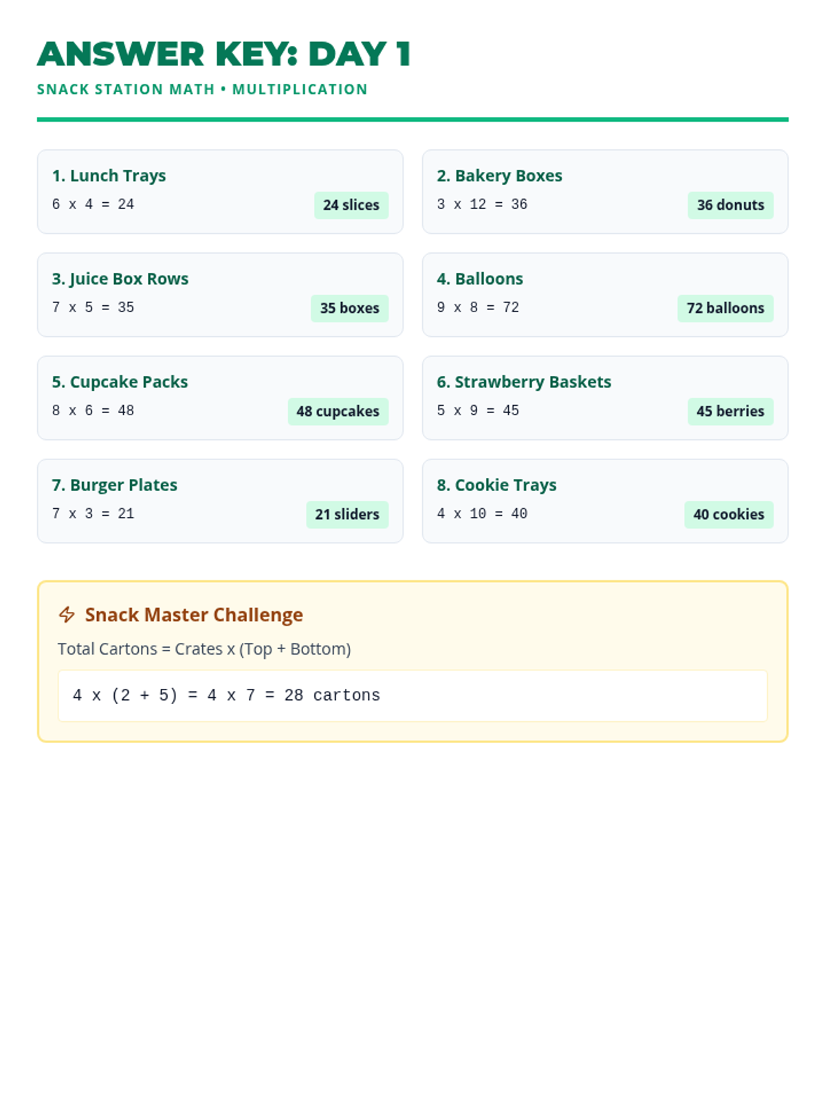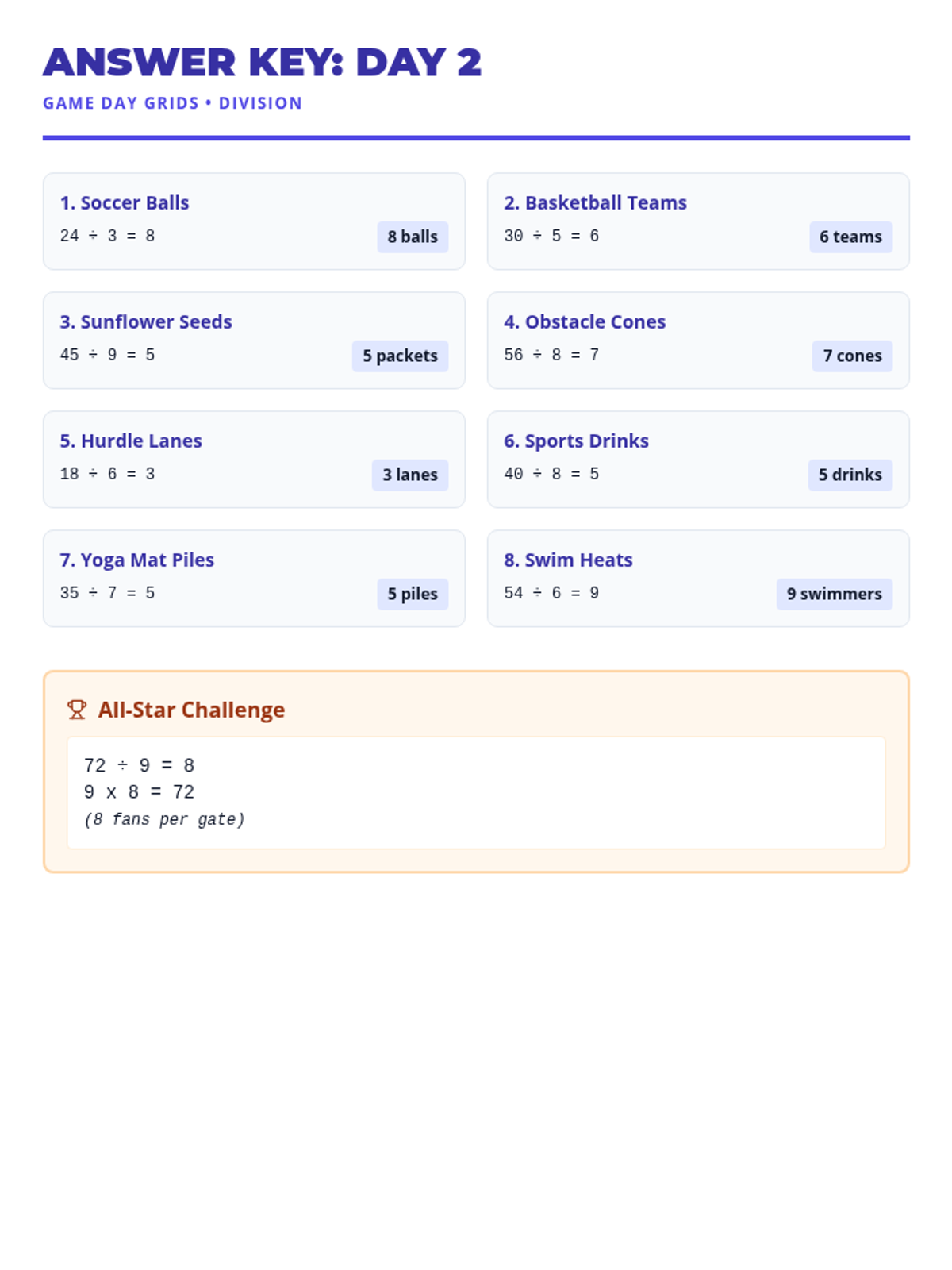 A culminating mixed practice session where students solve both multiplication and division problems across food and sports scenarios.