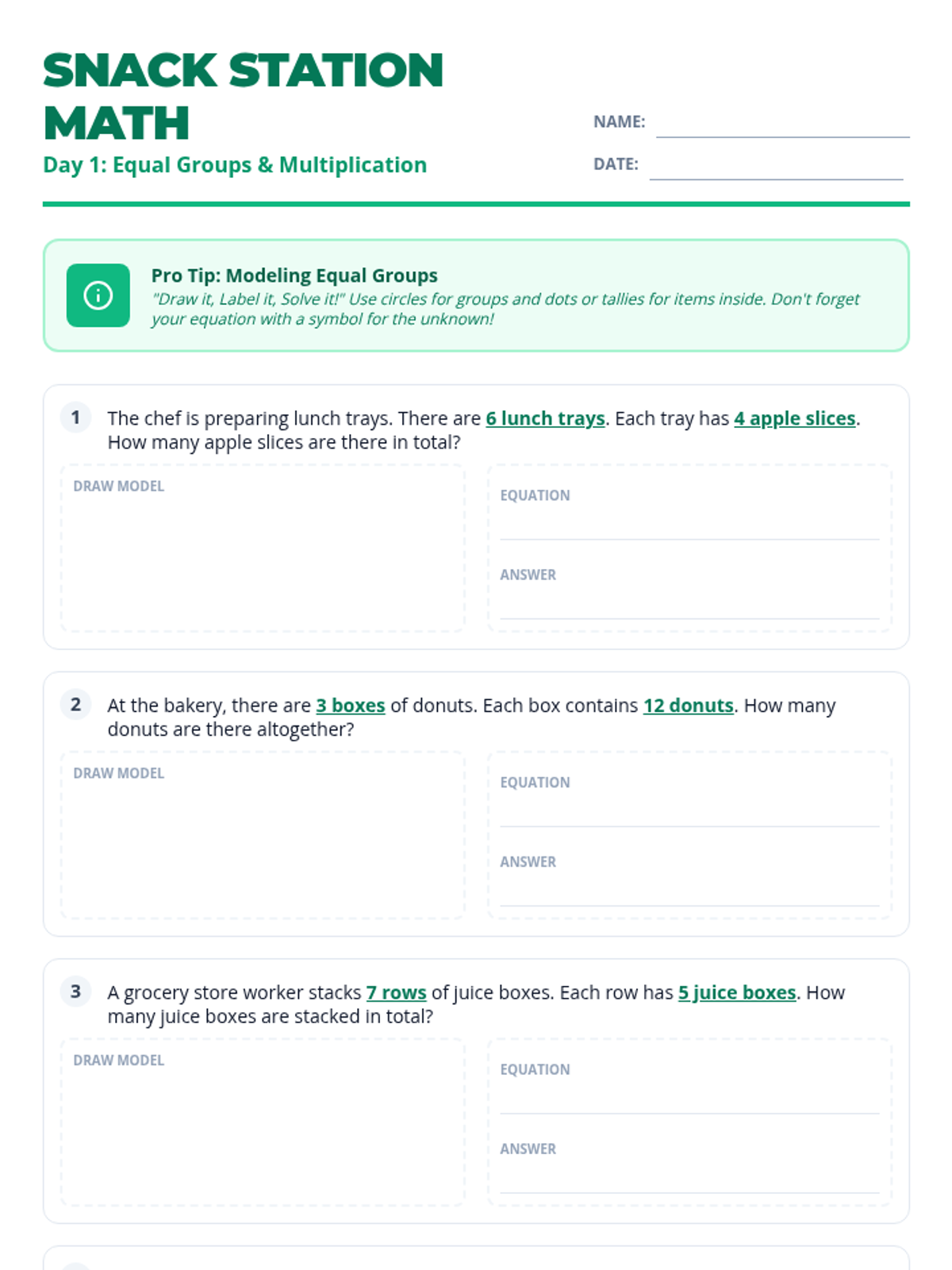 Focuses on multiplication word problems using equal groups in a food-themed context. Students will practice drawing models and writing equations with unknowns.
