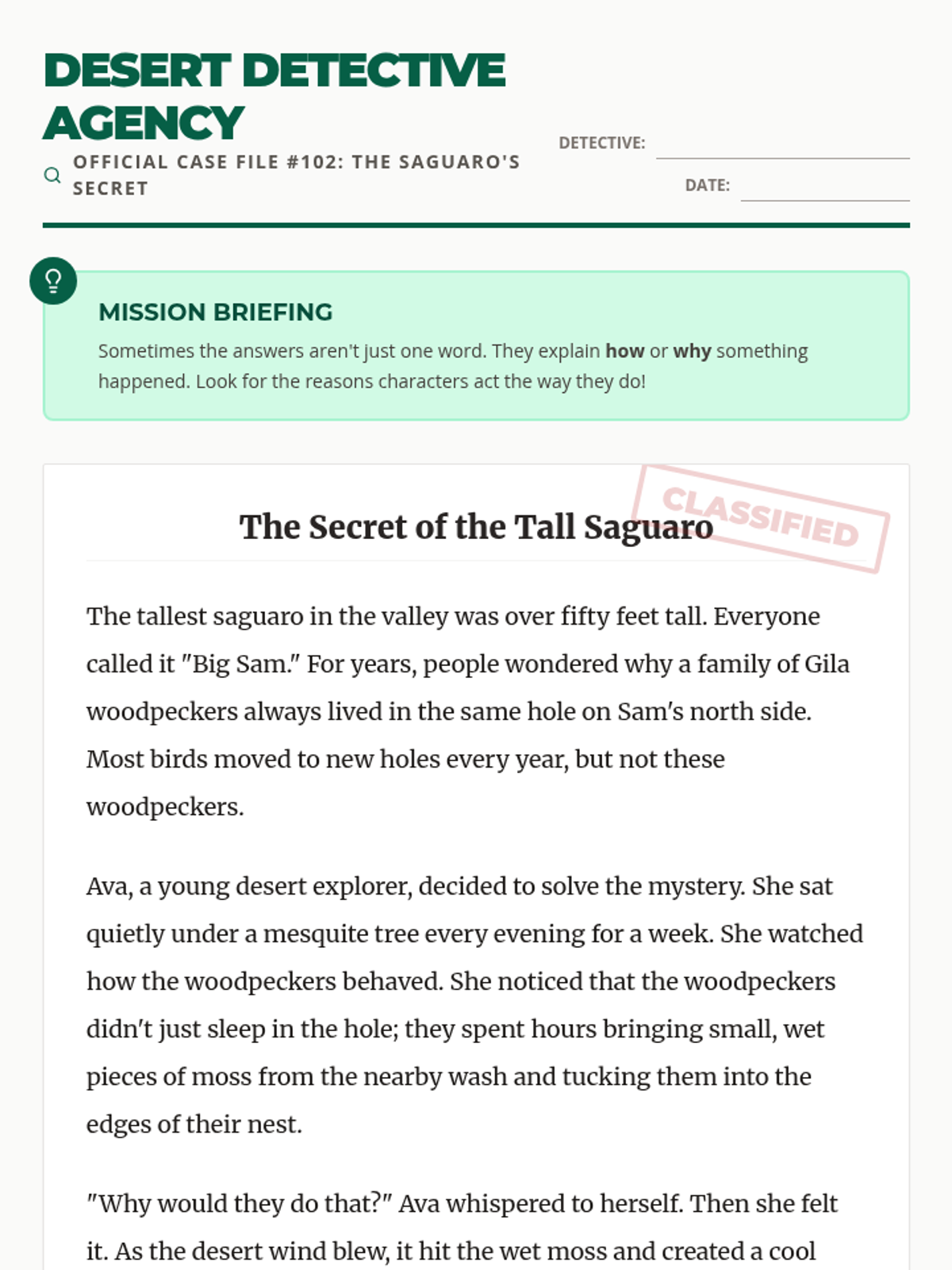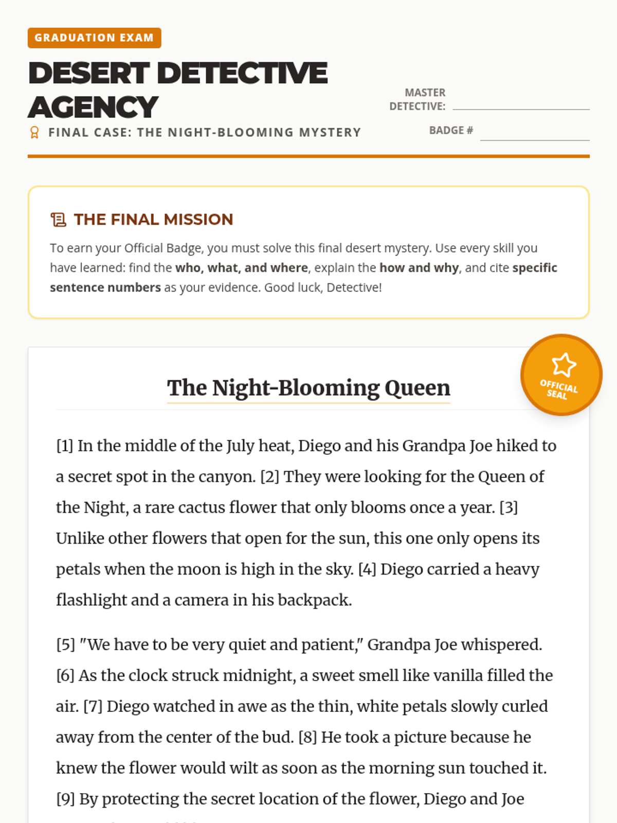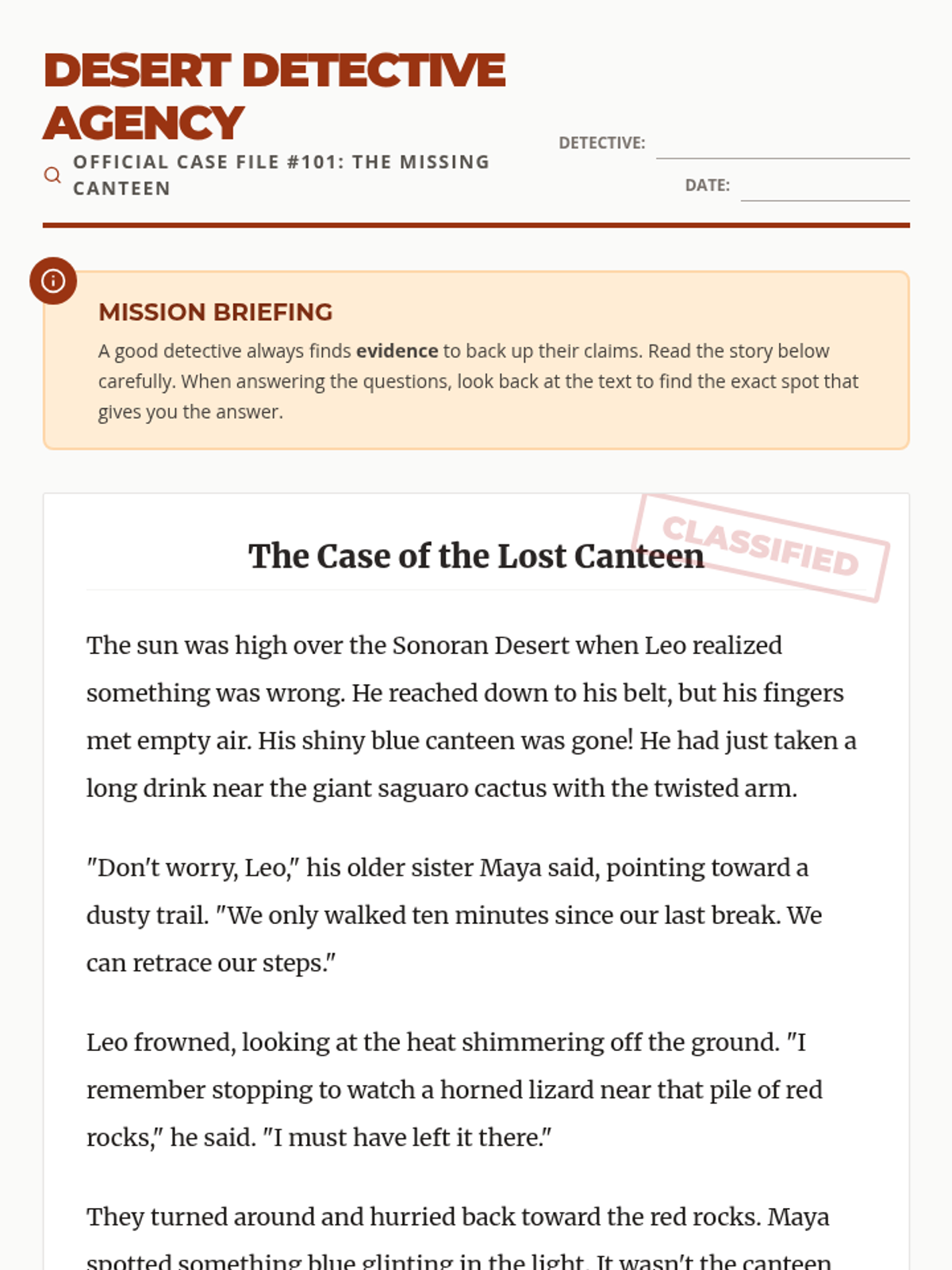 A cumulative assessment where students apply all their 'Desert Detective' skills—literal details, 'how and why' explanations, and citing specific sentence evidence—to solve a final mystery.