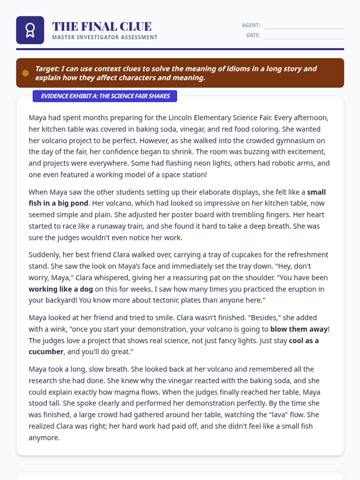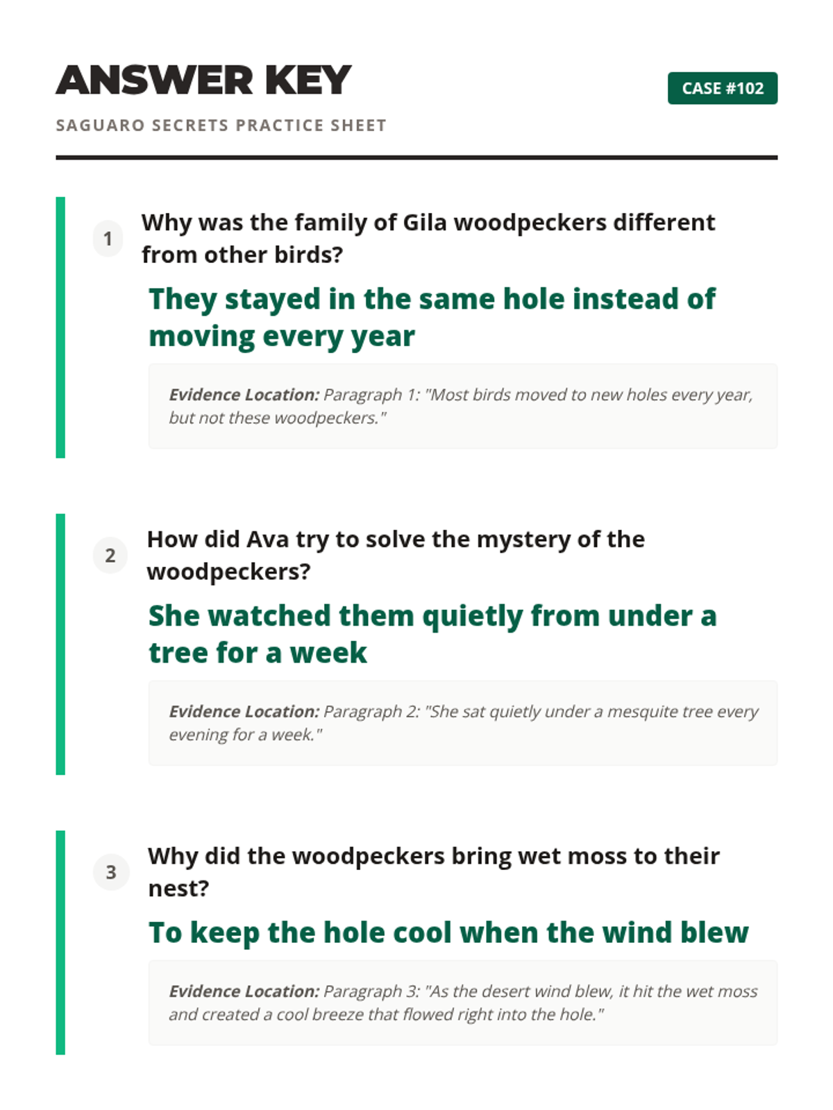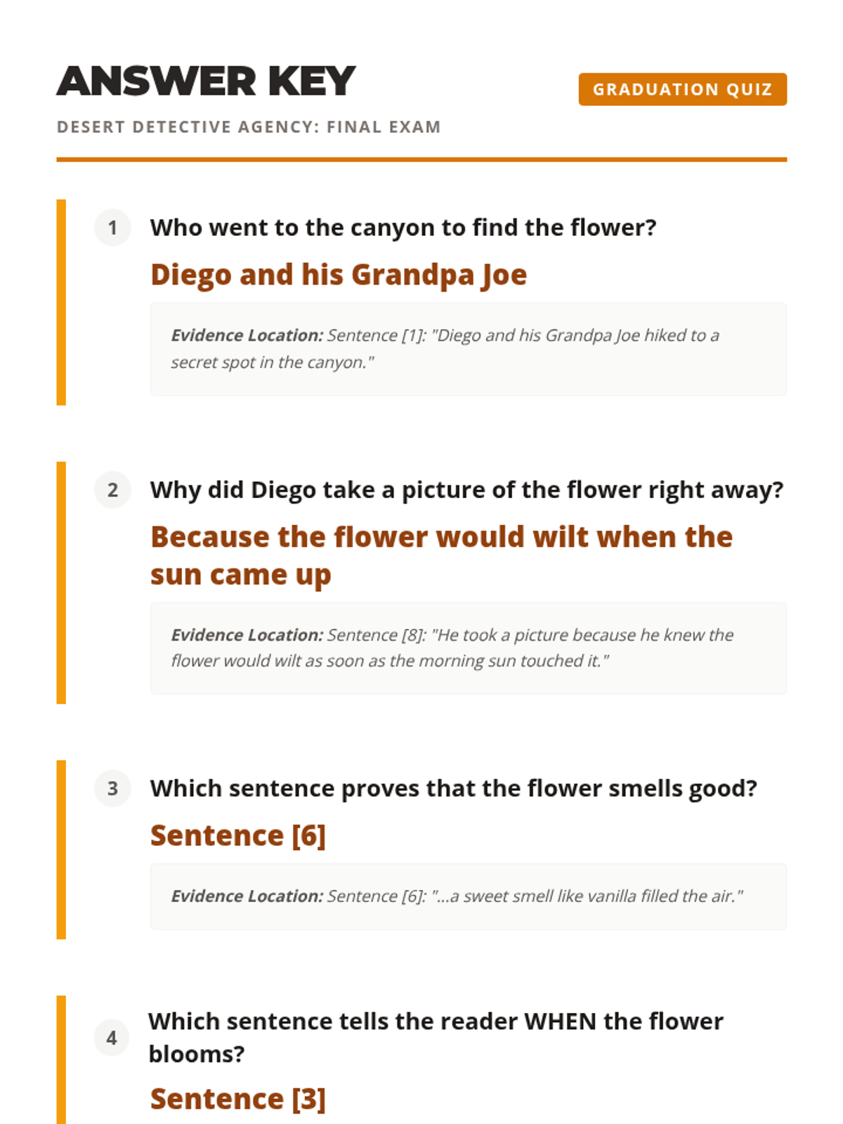 A cumulative assessment where students apply all their 'Desert Detective' skills—literal details, 'how and why' explanations, and citing specific sentence evidence—to solve a final mystery.