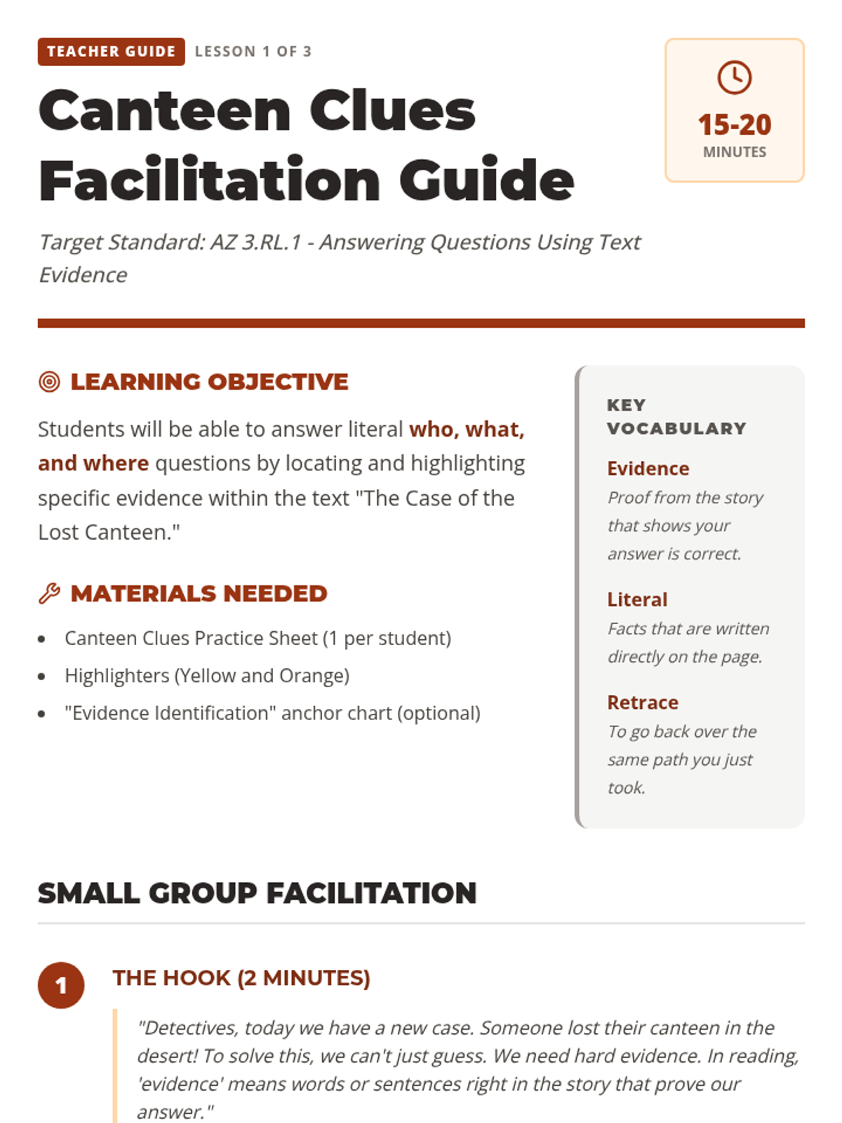 Students practice answering literal 'who, what, where, and when' questions by citing evidence from a story about a lost canteen.