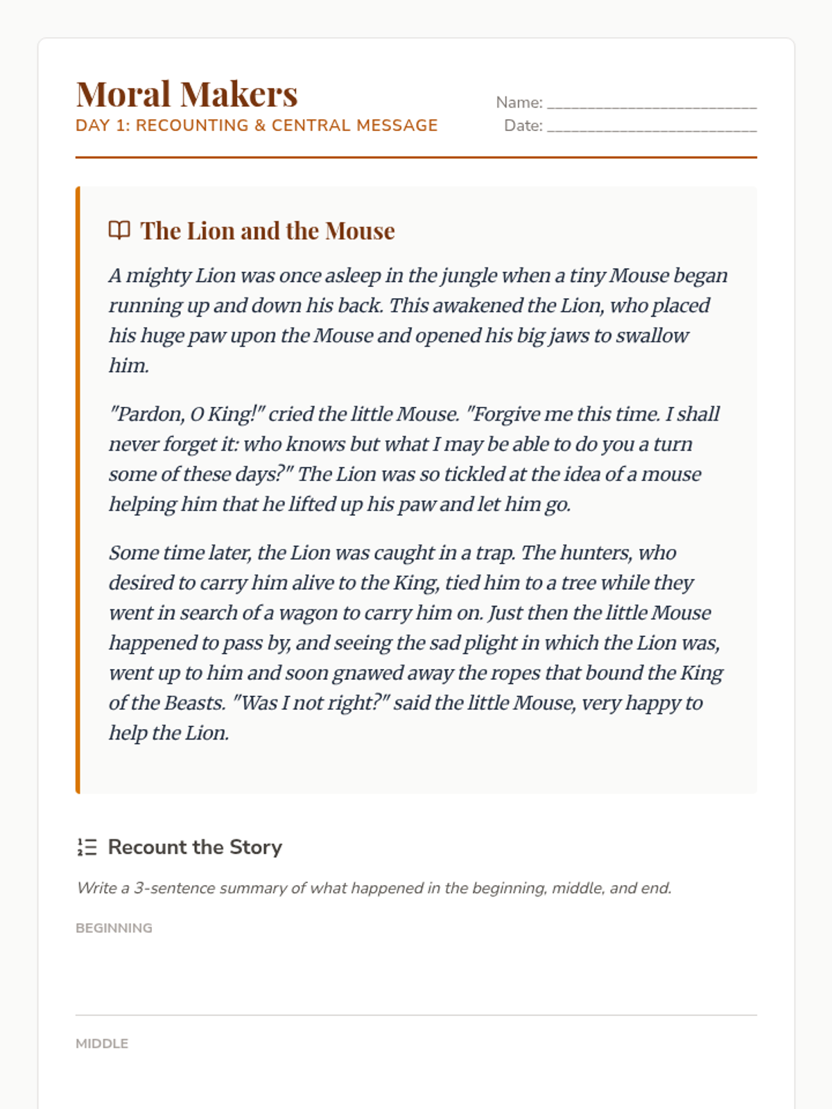 Focus on recounting the sequence of events and identifying the central message in 'The Lion and the Mouse'.