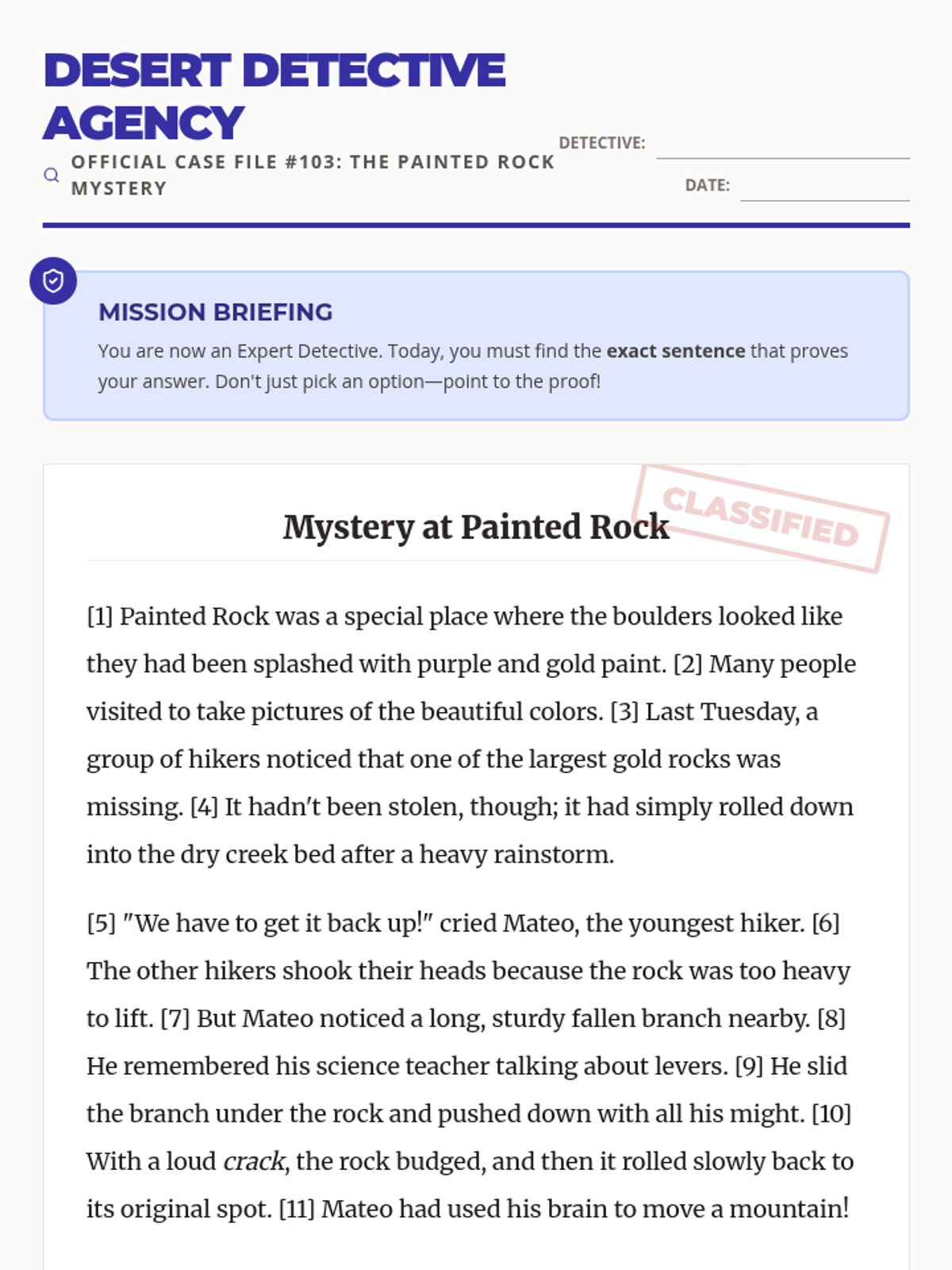 Students master the skill of identifying the specific sentence or phrase that proves an answer in a mystery set at Painted Rock.