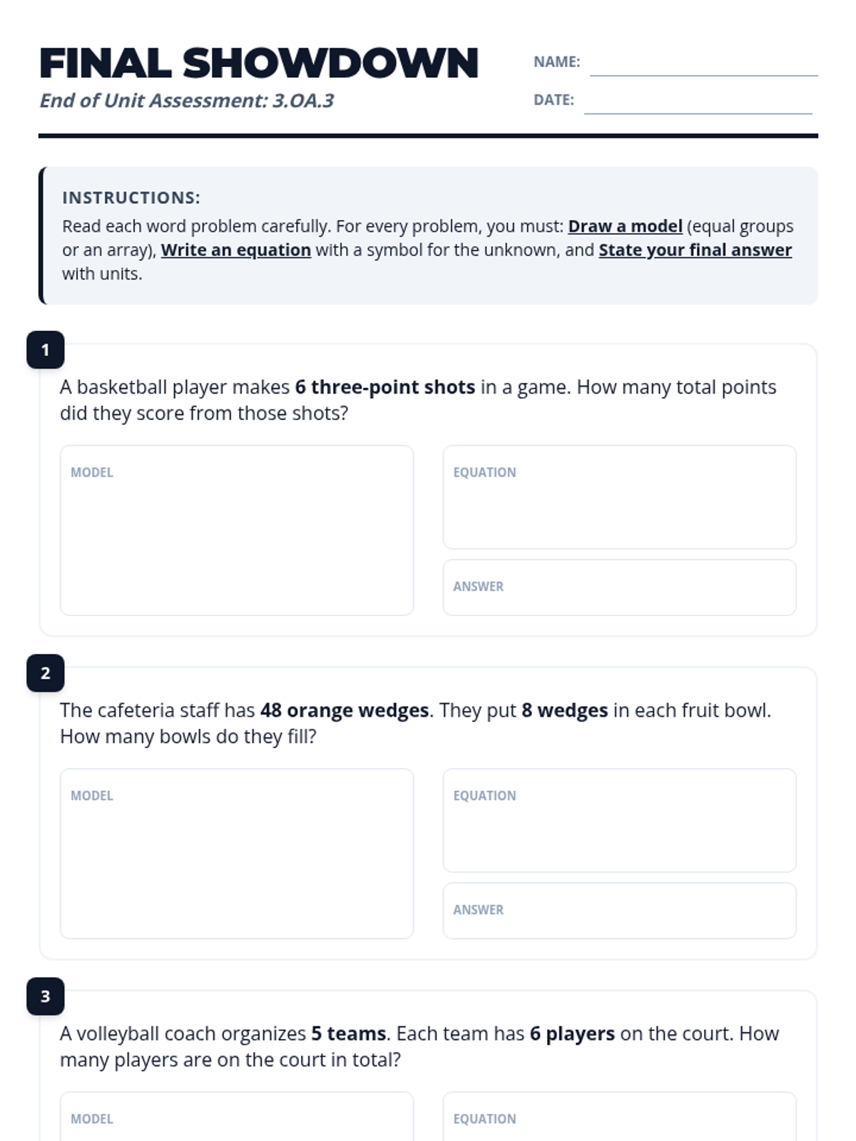 A formal assessment covering multiplication and division word problems within 100, featuring mixed food and sports scenarios as a final check for understanding of standard 3.OA.3.