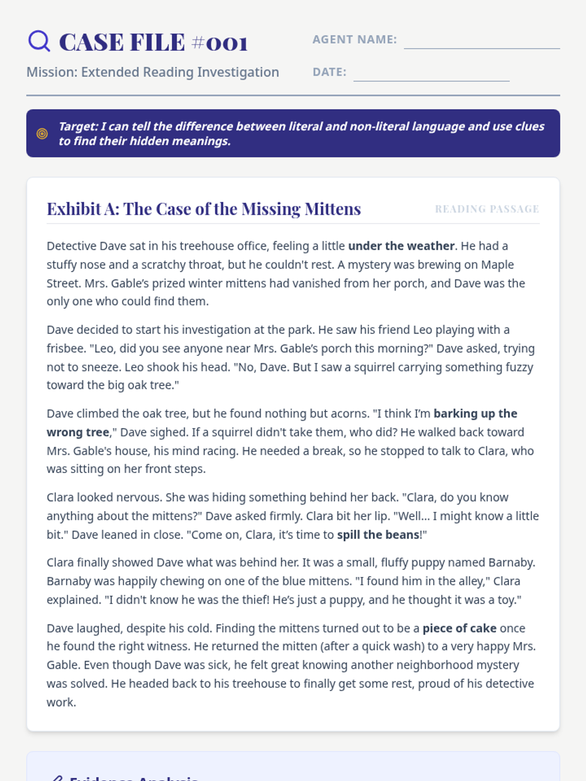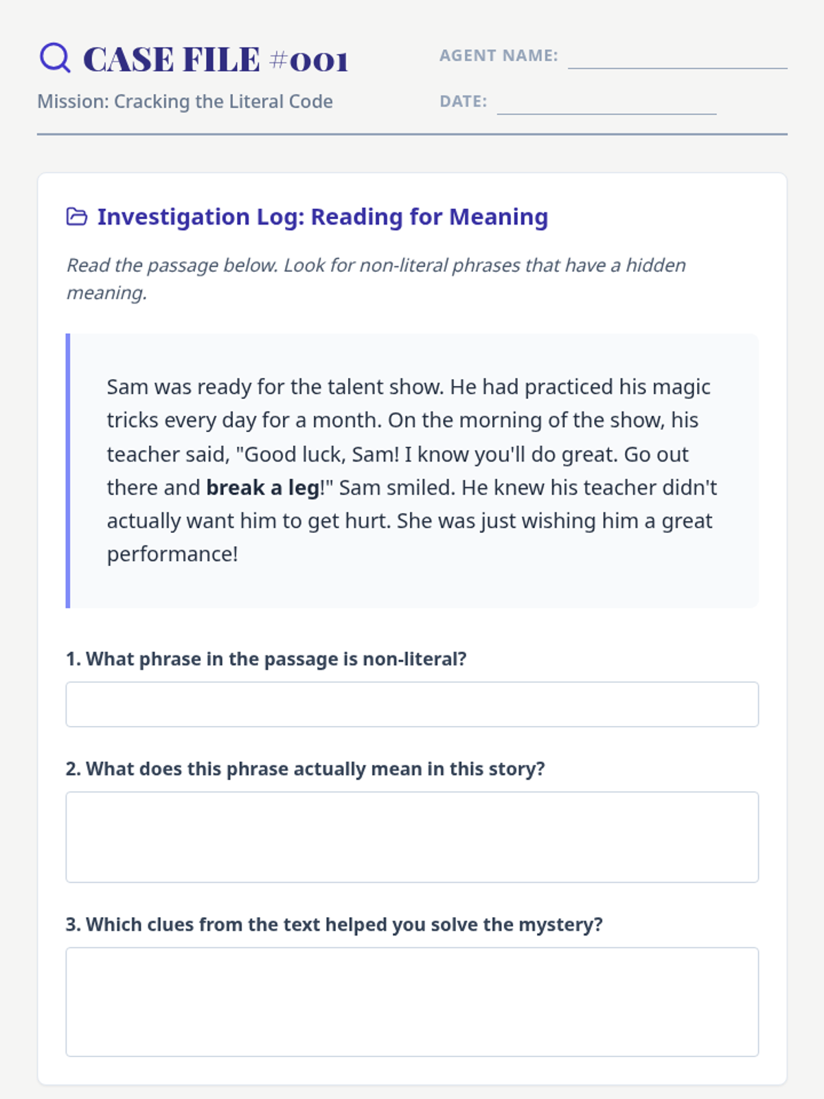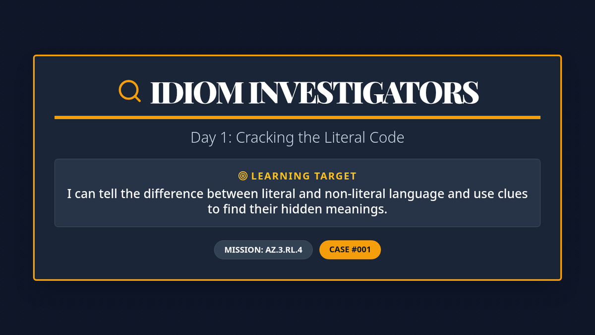 A 30-minute introductory lesson focusing on distinguishing between literal and non-literal language using context clues and engaging detective-themed examples.