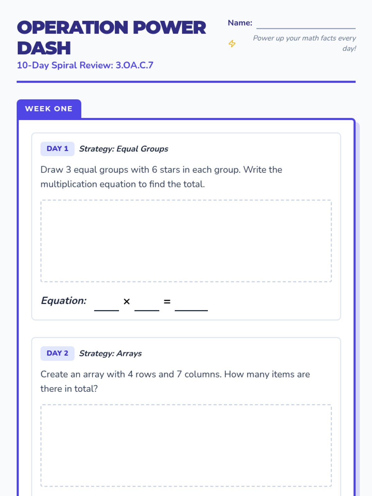A ten-day spiral review focused on building fluency in multiplication and division within 100 using various strategies like arrays, equal groups, area models, and fact families.