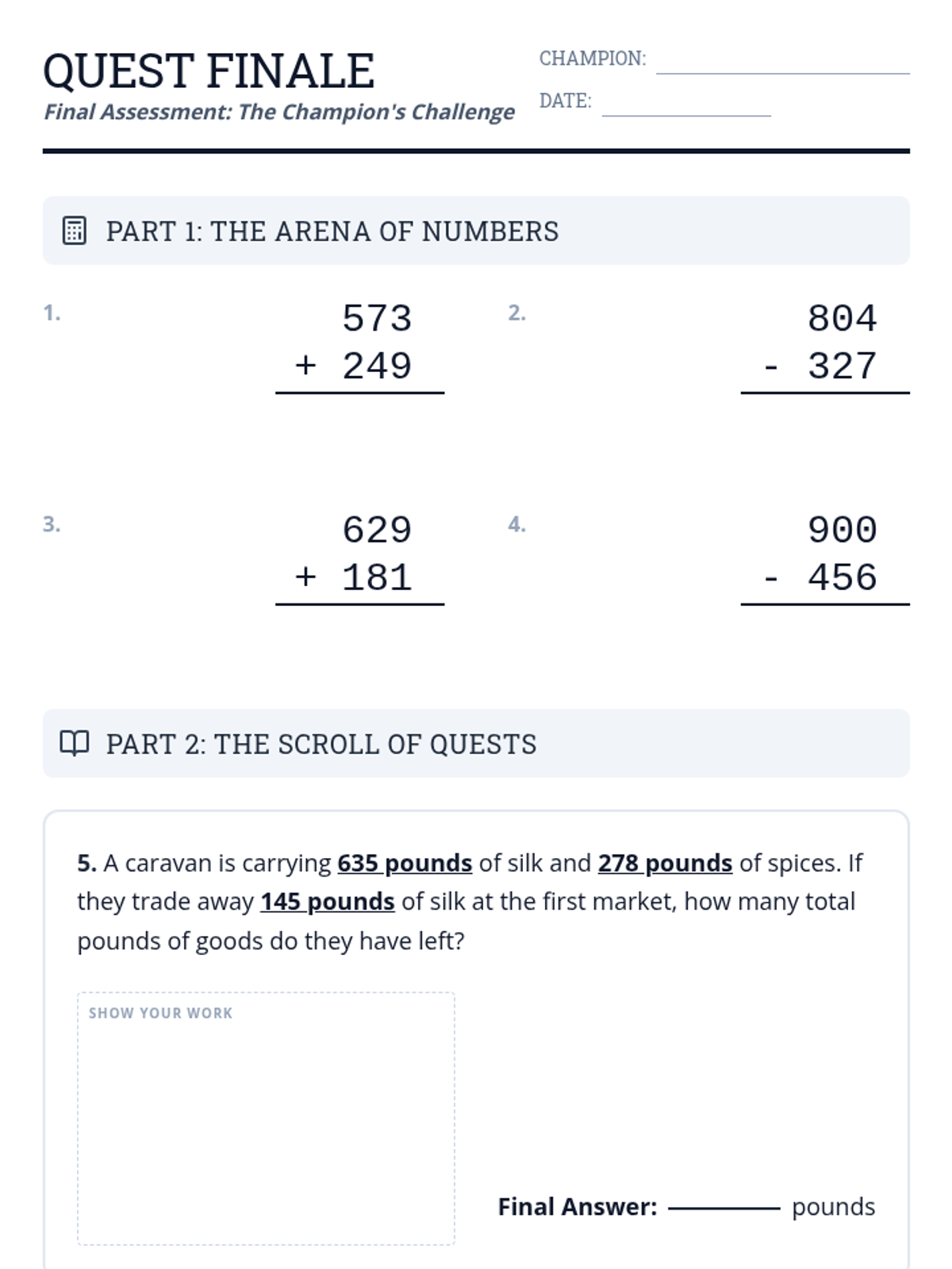 A comprehensive assessment of addition and subtraction within 1000, including multi-step word problems.