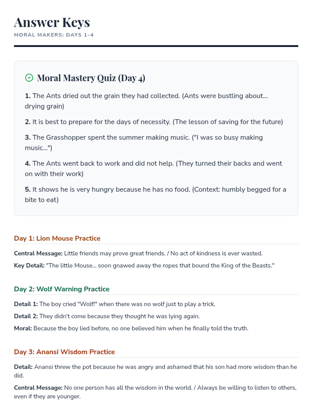Applying recounting and moral-finding skills to a West African folktale, 'Anansi and the Pot of Wisdom'.