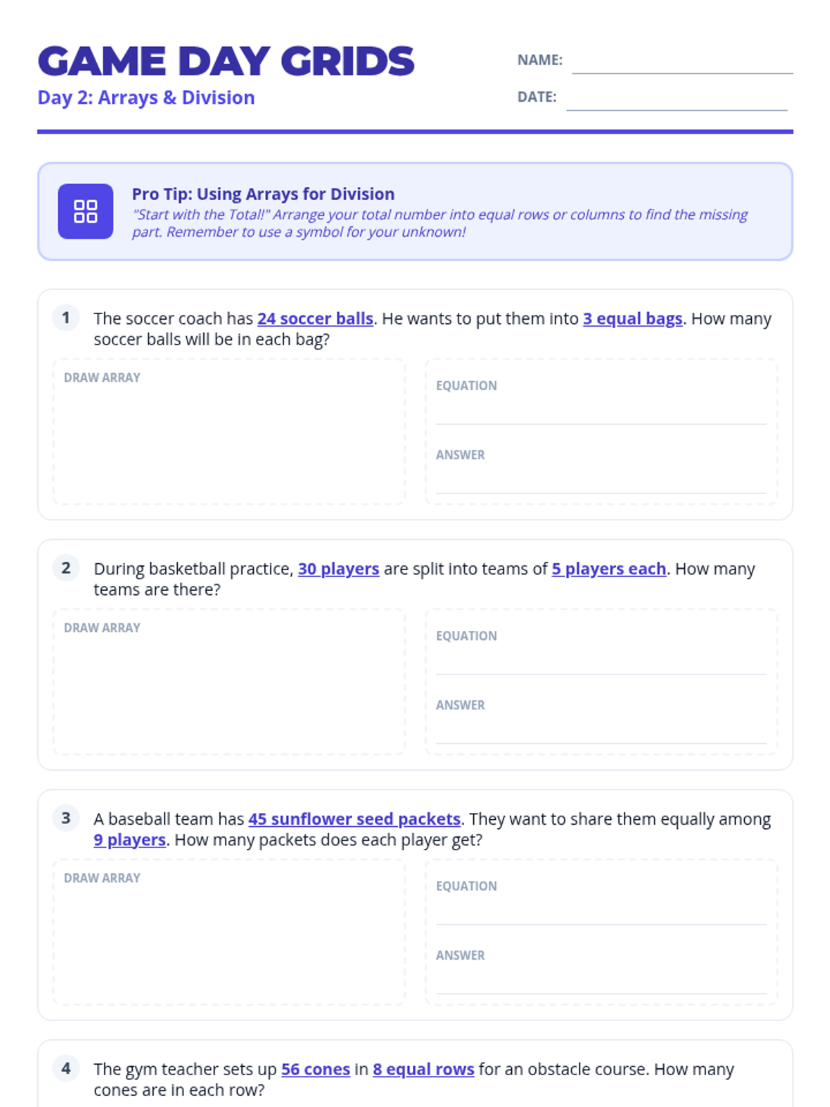 Explores division word problems through arrays and measurement quantities in a sports context. Students will use symbols for unknown numbers in their equations.