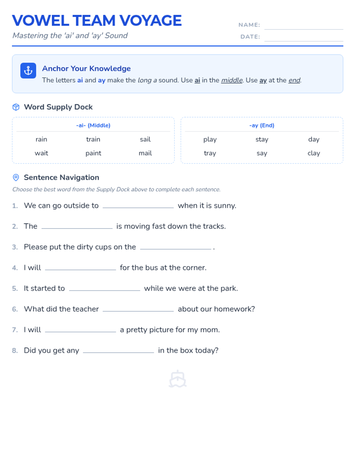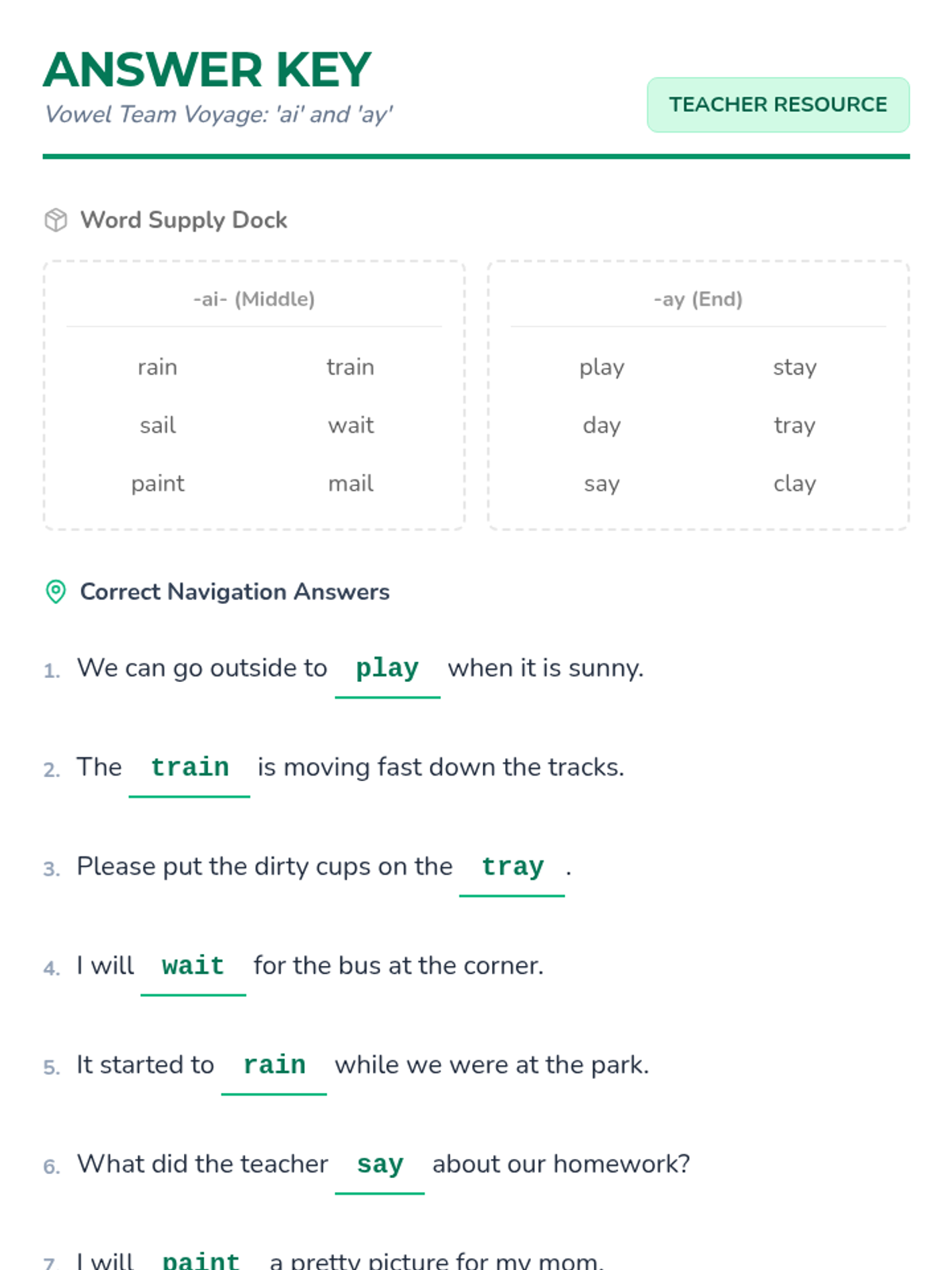 A lesson focusing on the vowel teams 'ai' and 'ay' for the long /a/ sound, following the SPIRE Level 3 progression. Students will practice identifying, reading, and spelling words with these patterns through guided instruction and independent practice.