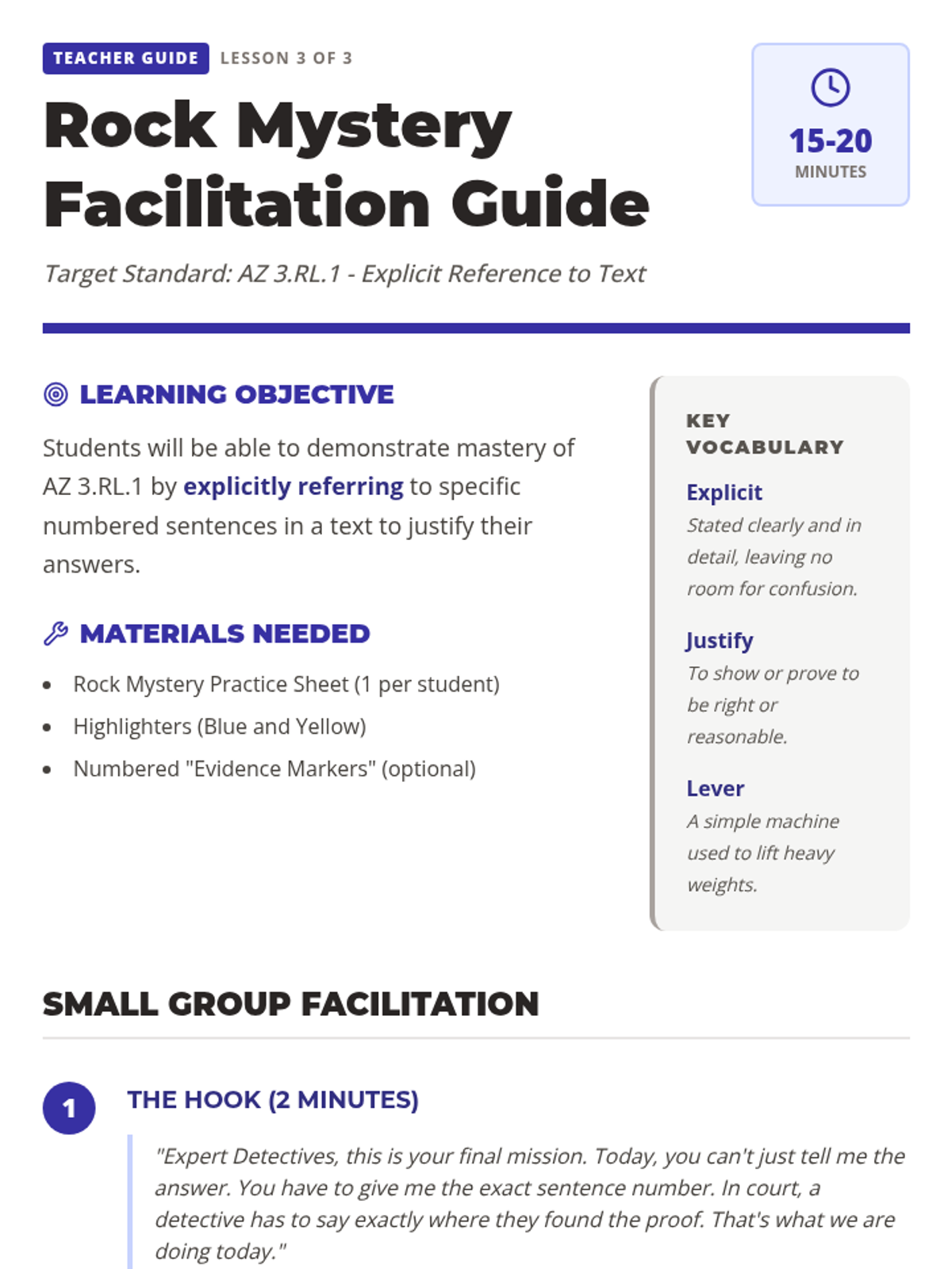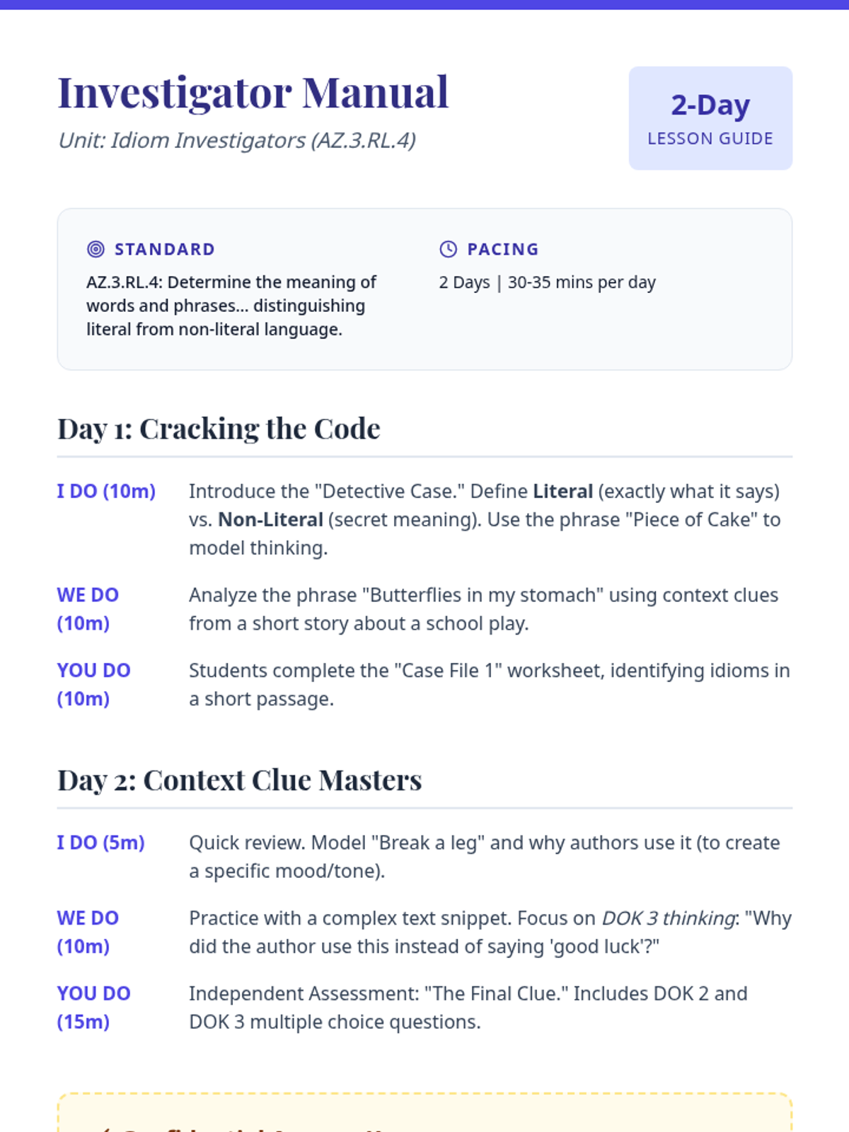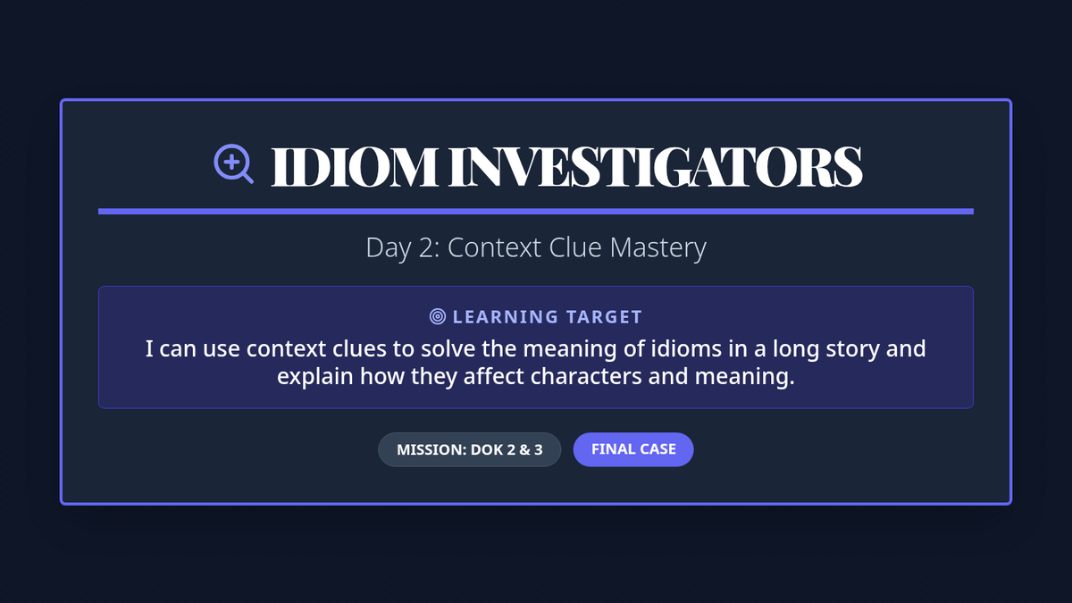 A 35-minute lesson focused on applying context clues to interpret non-literal language in grade-level texts, featuring DOK 2 and 3 assessment questions.