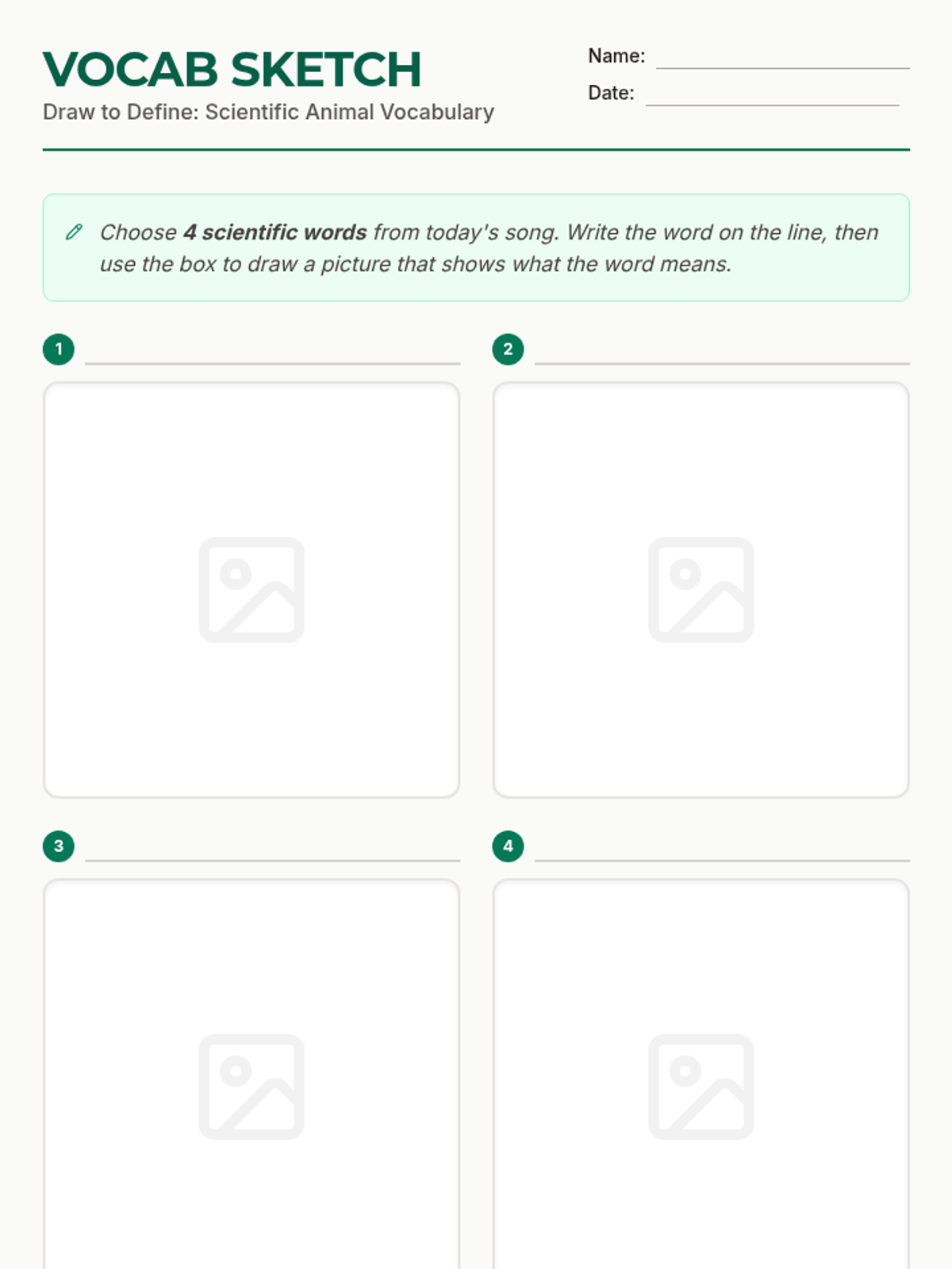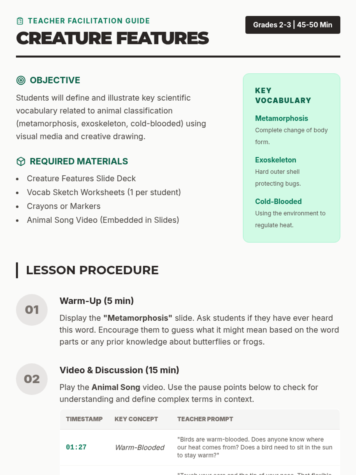 A lesson focused on animal classification and scientific vocabulary using the 'Animal Song' video. Students explore terms like metamorphosis, exoskeleton, and cold-blooded through visual sketching and interactive discussion.
