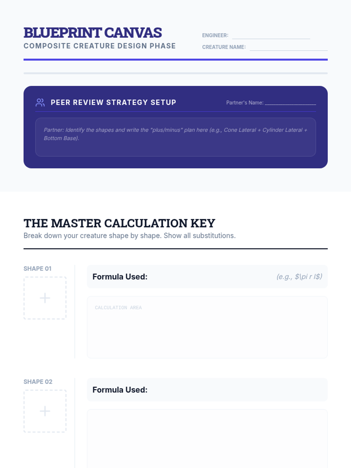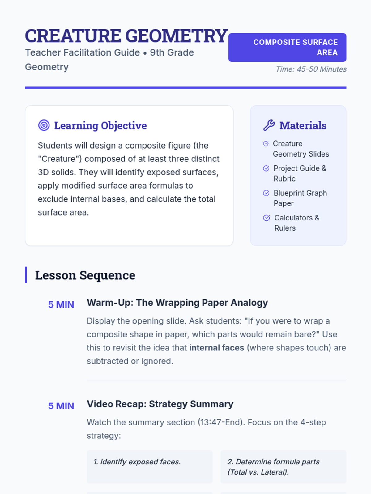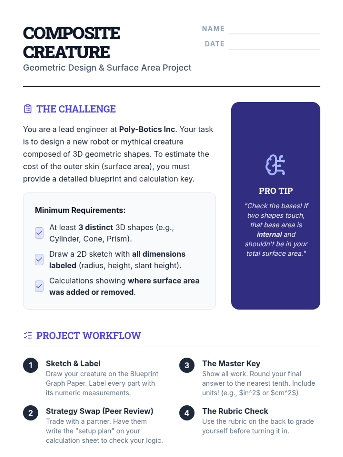 Students design and calculate the surface area of a 3D 'Composite Creature' made from at least three distinct geometric solids, applying the principle of excluding internal faces.