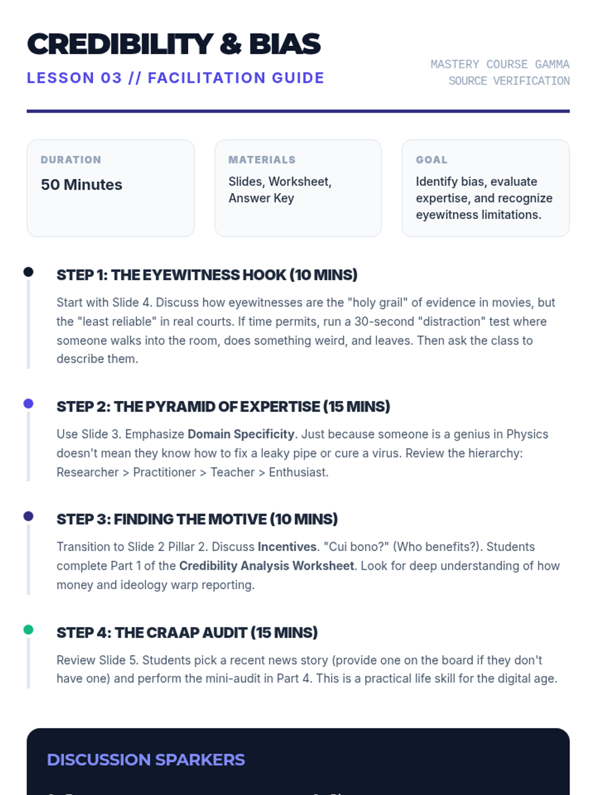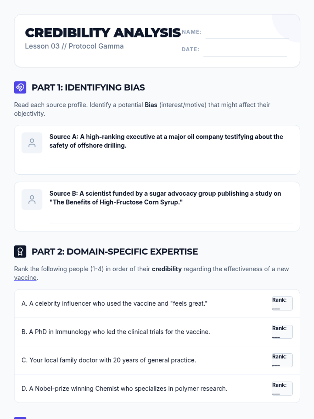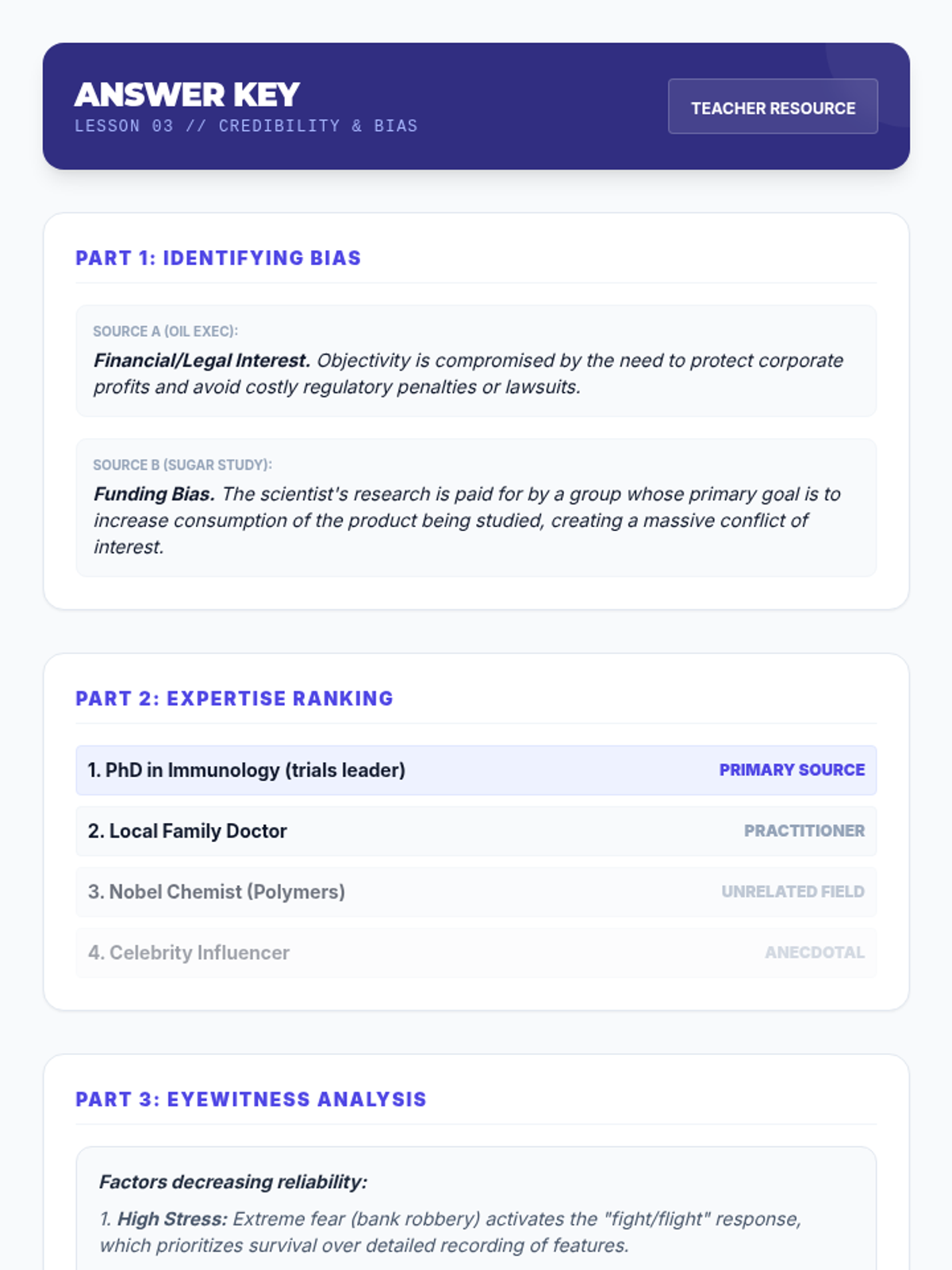 Evaluating source reliability by recognizing bias, determining levels of expertise, and understanding the specific challenges of eyewitness testimony.