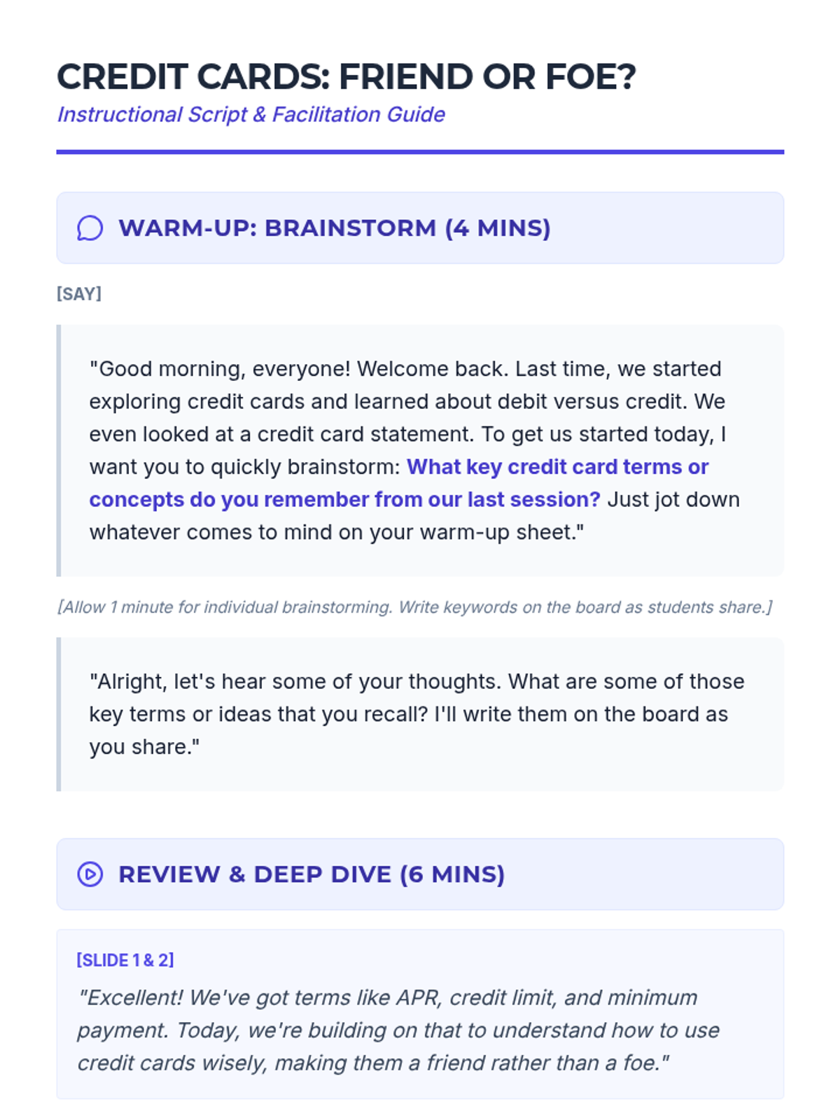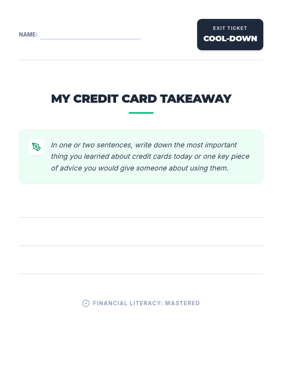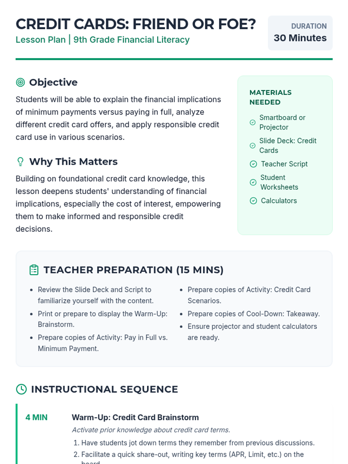 A 30-minute financial literacy lesson for 9th graders exploring the benefits and risks of credit cards, with a focus on interest and responsible payment strategies.