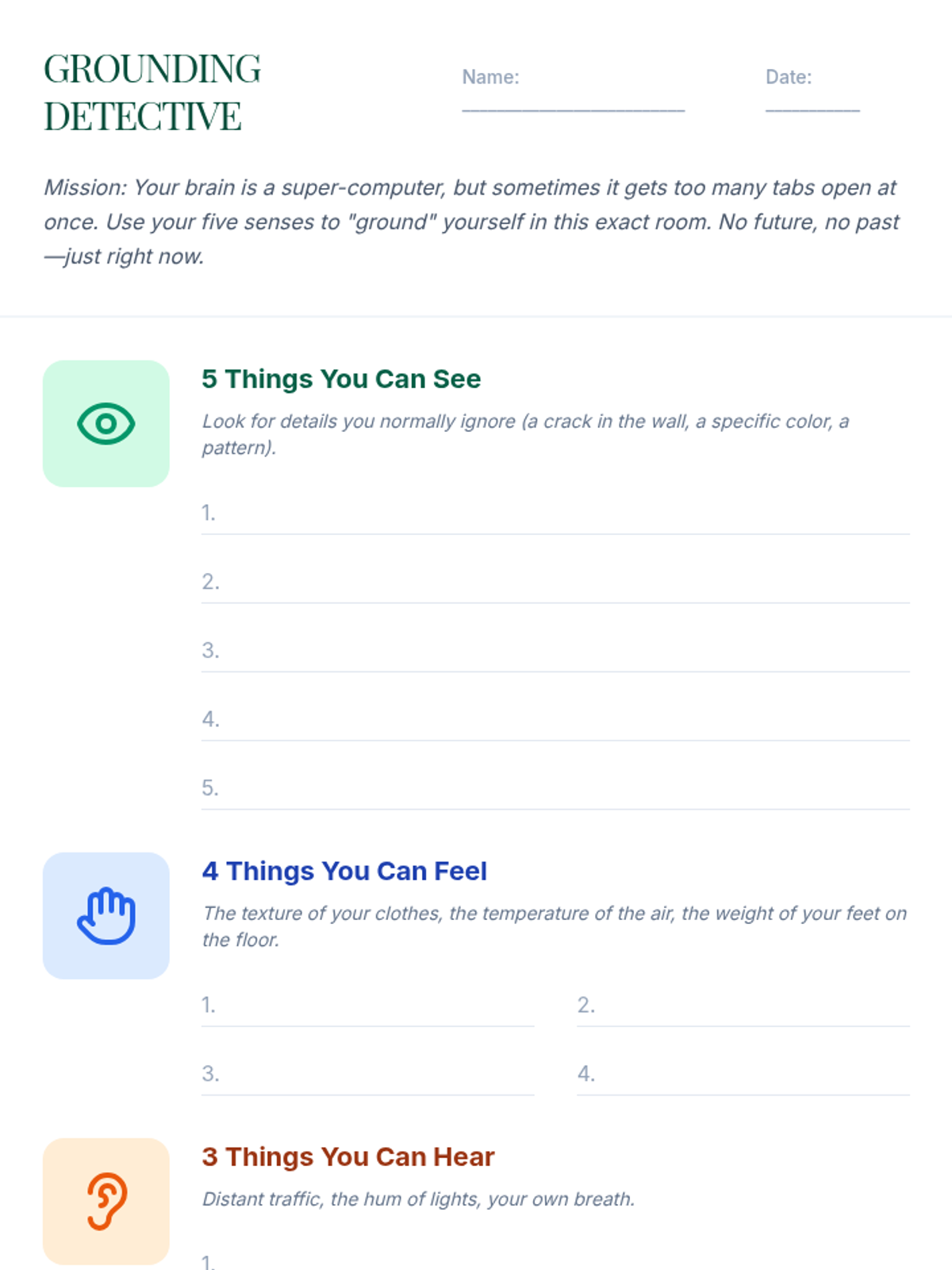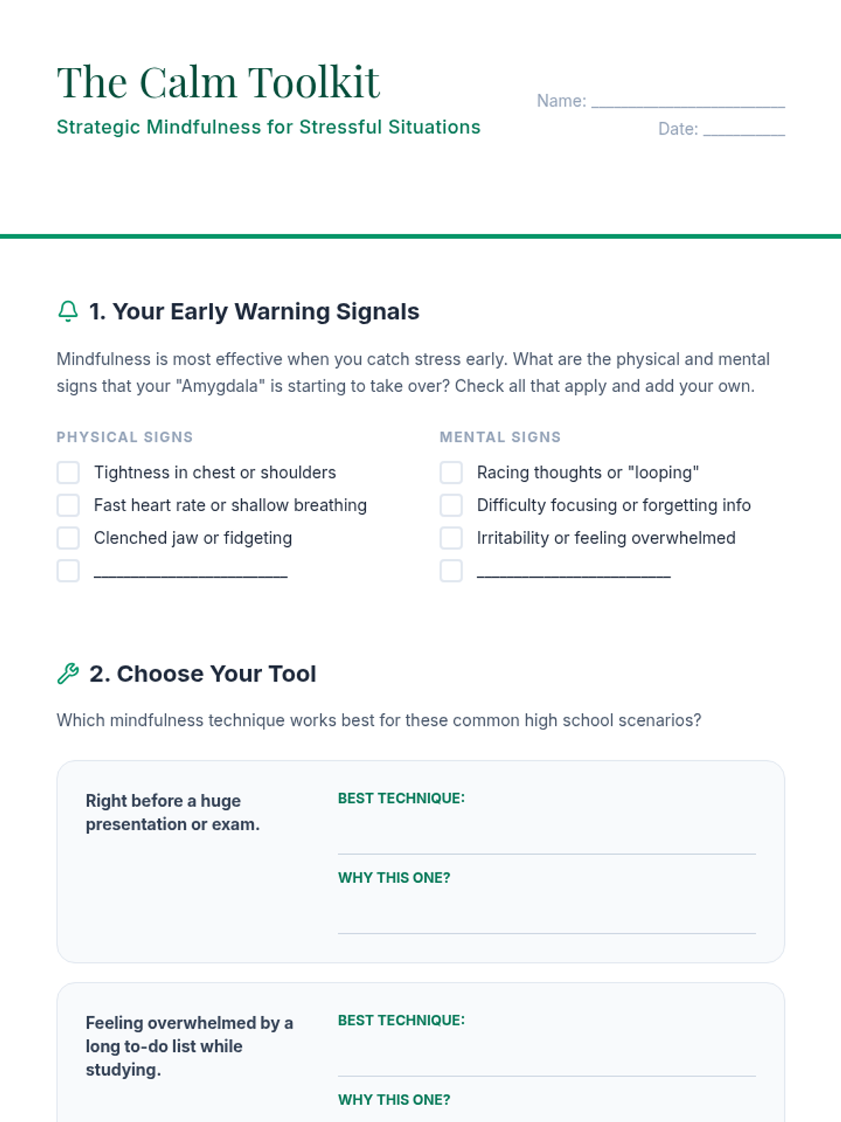 An introductory session where students learn to identify physical and emotional stress signals and explore immediate techniques to regulate their response. Includes a lesson plan and a stress mapping worksheet.