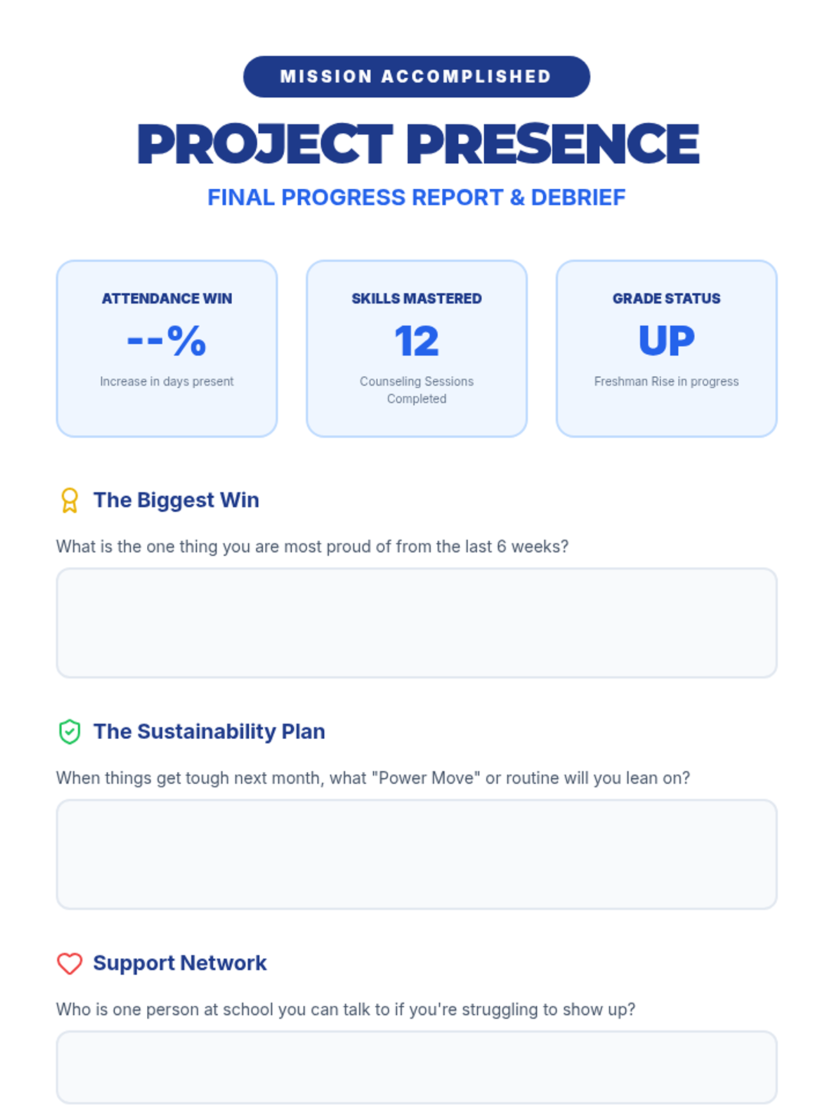 Summarizing progress, planning for future challenges, and celebrating the successful completion of the intervention.