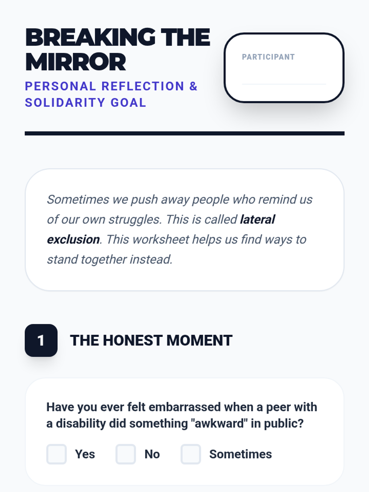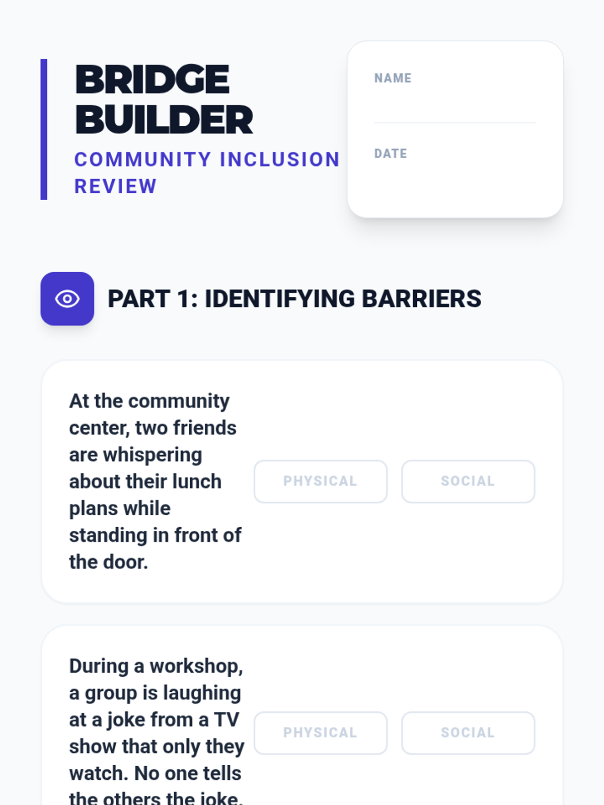 A foundational lesson for adults with disabilities to identify physical and social exclusion in community and vocational settings, focusing on basic inclusion strategies.