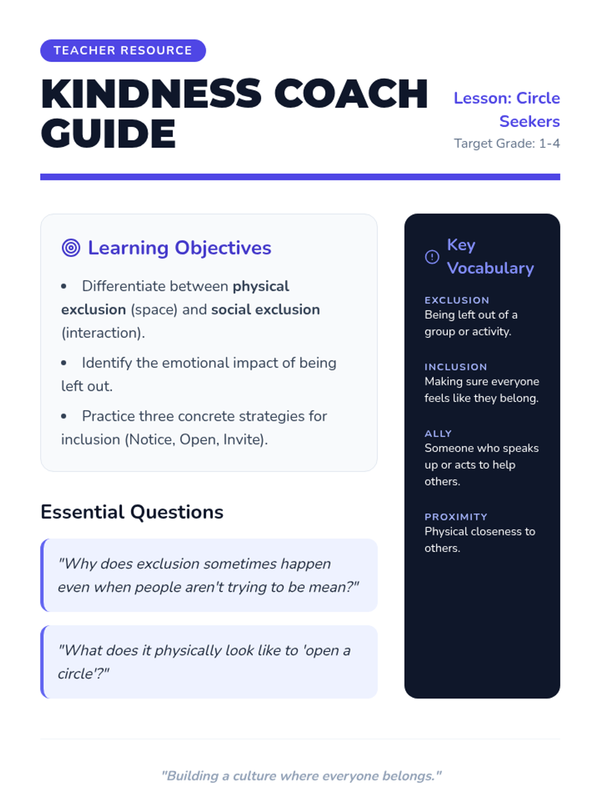 A high-energy brainstorming session designed to empower peer helpers to design and implement initiatives for school inclusion and community spirit. Students will transition from abstract goals to concrete action plans using a 'Culture Architect' framework.