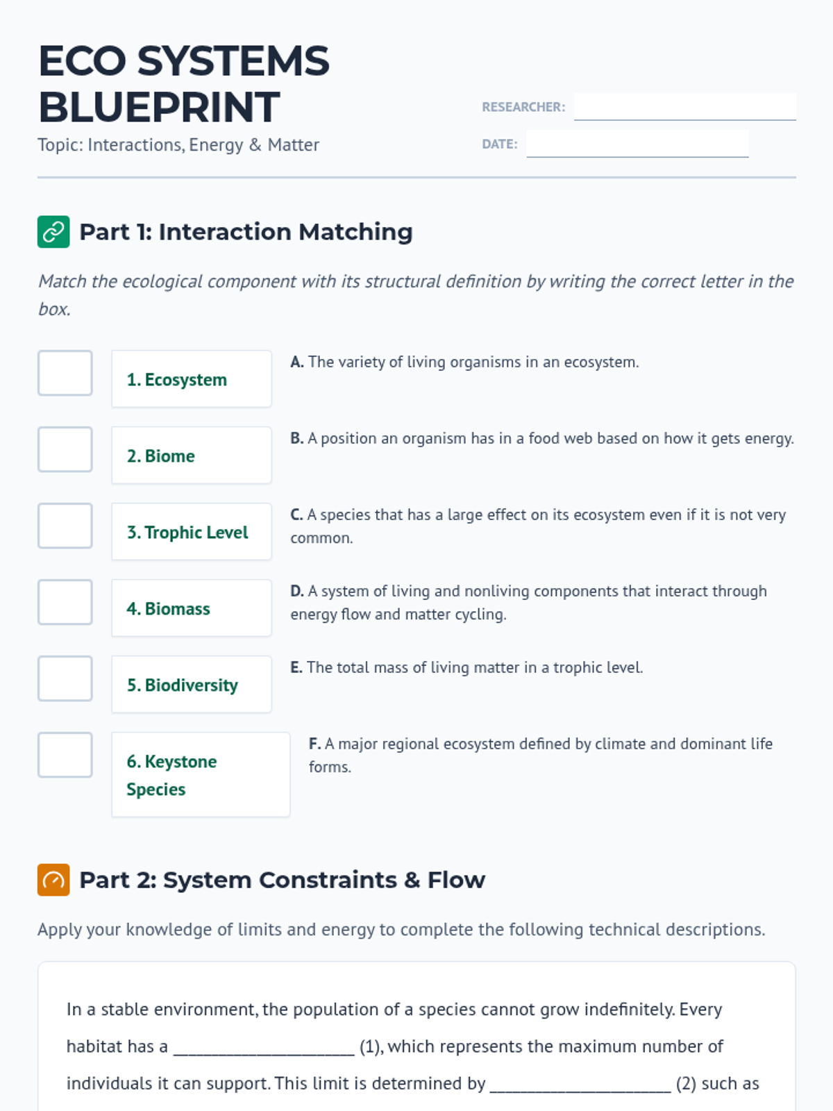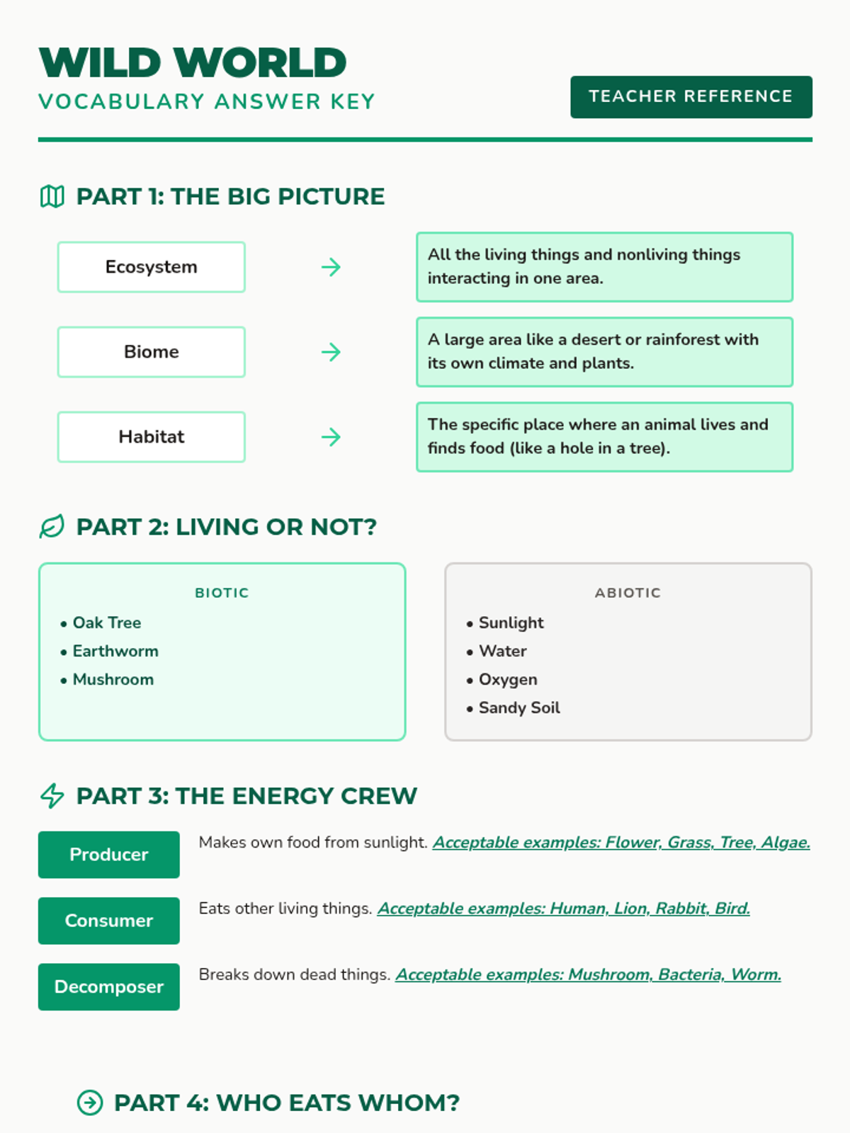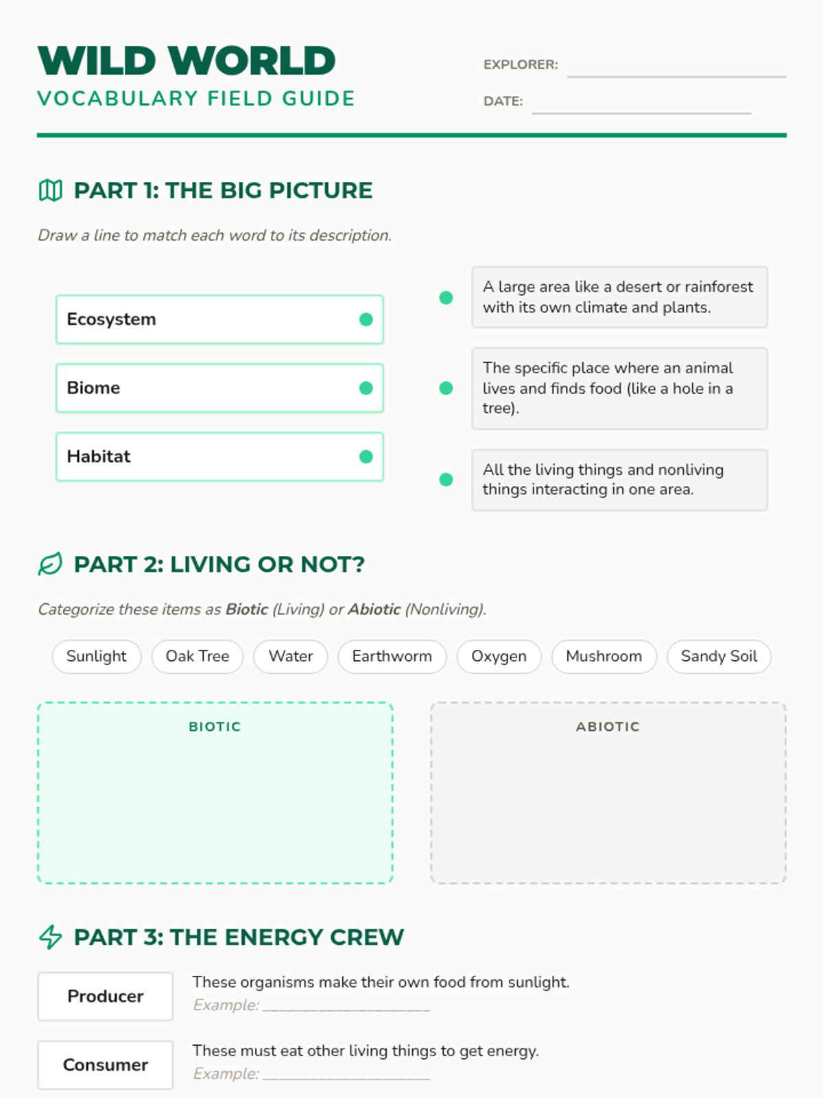 A foundational introduction to ecosystems, biomes, and the roles living things play in their environments. Students explore biotic and abiotic factors and the simple energy paths within food chains and webs.