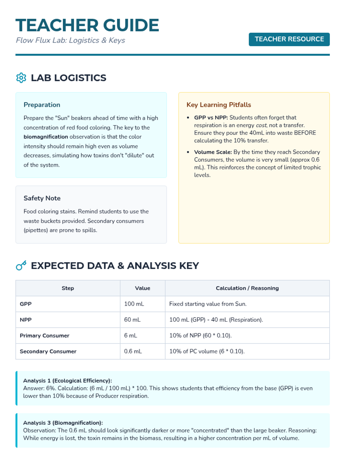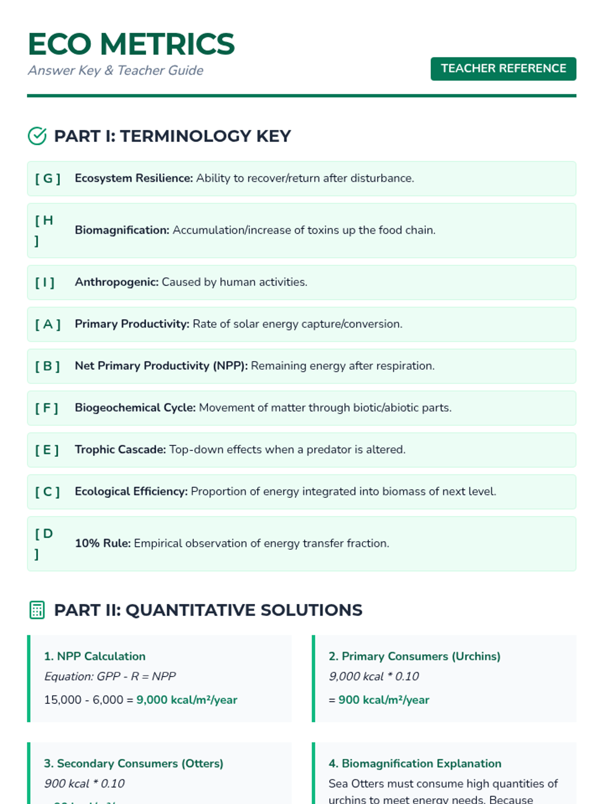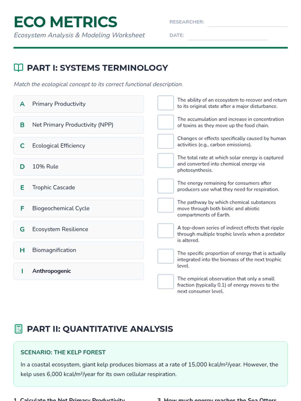 A lesson focusing on the quantitative analysis of energy flow and matter cycling within ecosystems, emphasizing the 10% rule, productivity, and human impact.